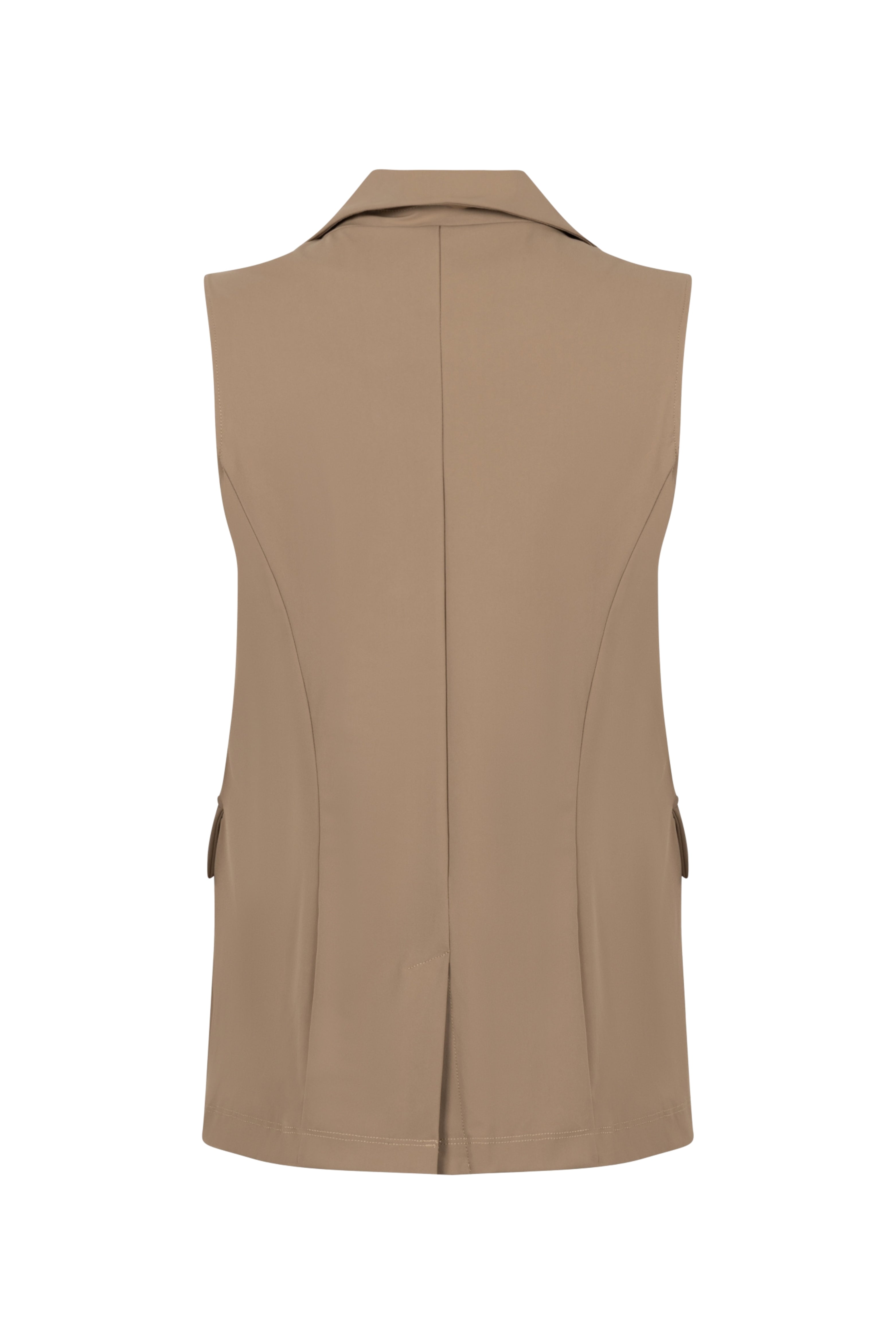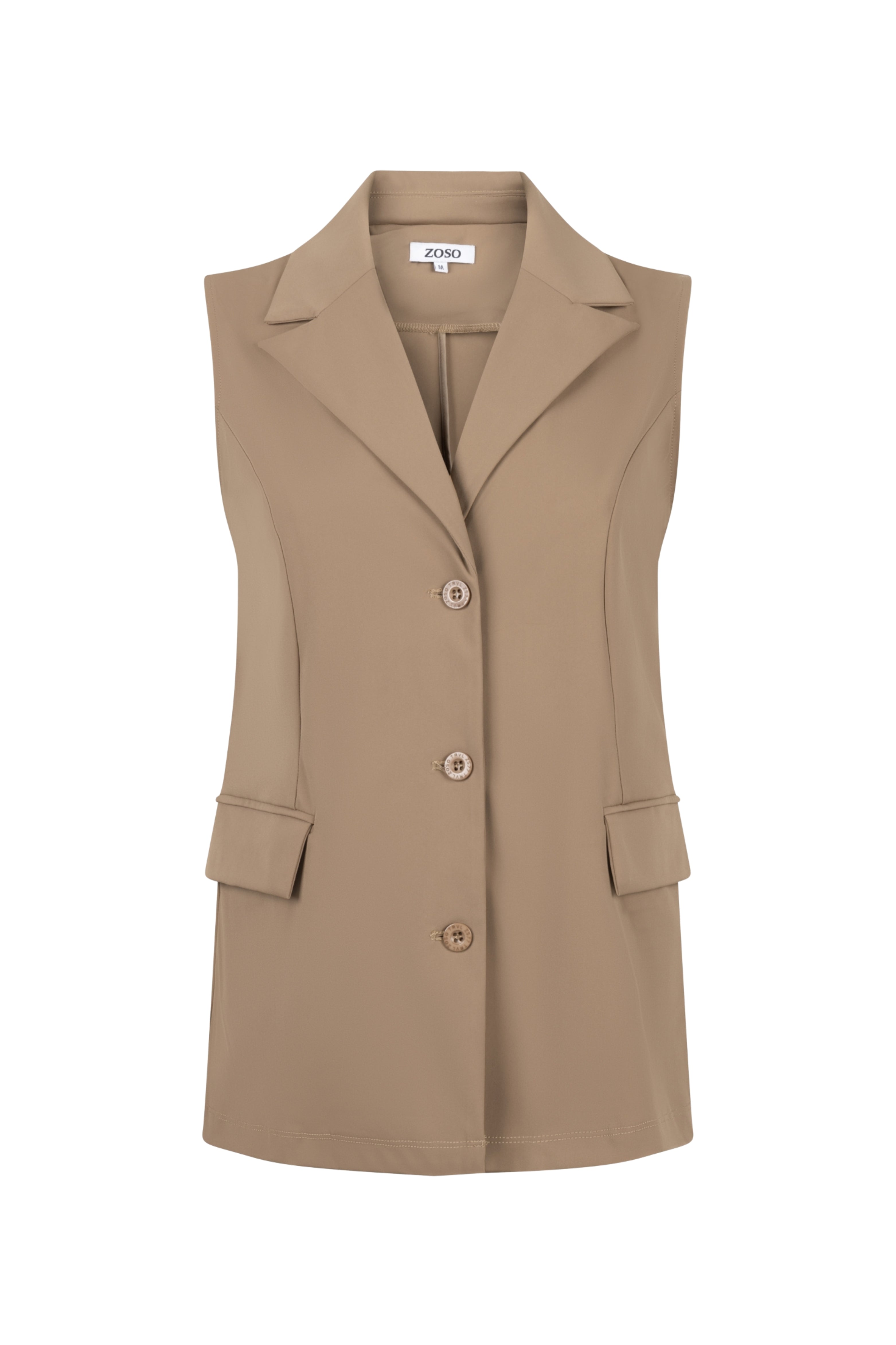 Het Gilet Angelique Camel van Zoso is een stijlvol mouwloos jasje met reverskraag, knoopsluiting en klepzakken. Gemaakt van comfortabele, kreukvrije travelkwaliteit. Perfect voor een casual of zakelijke look.