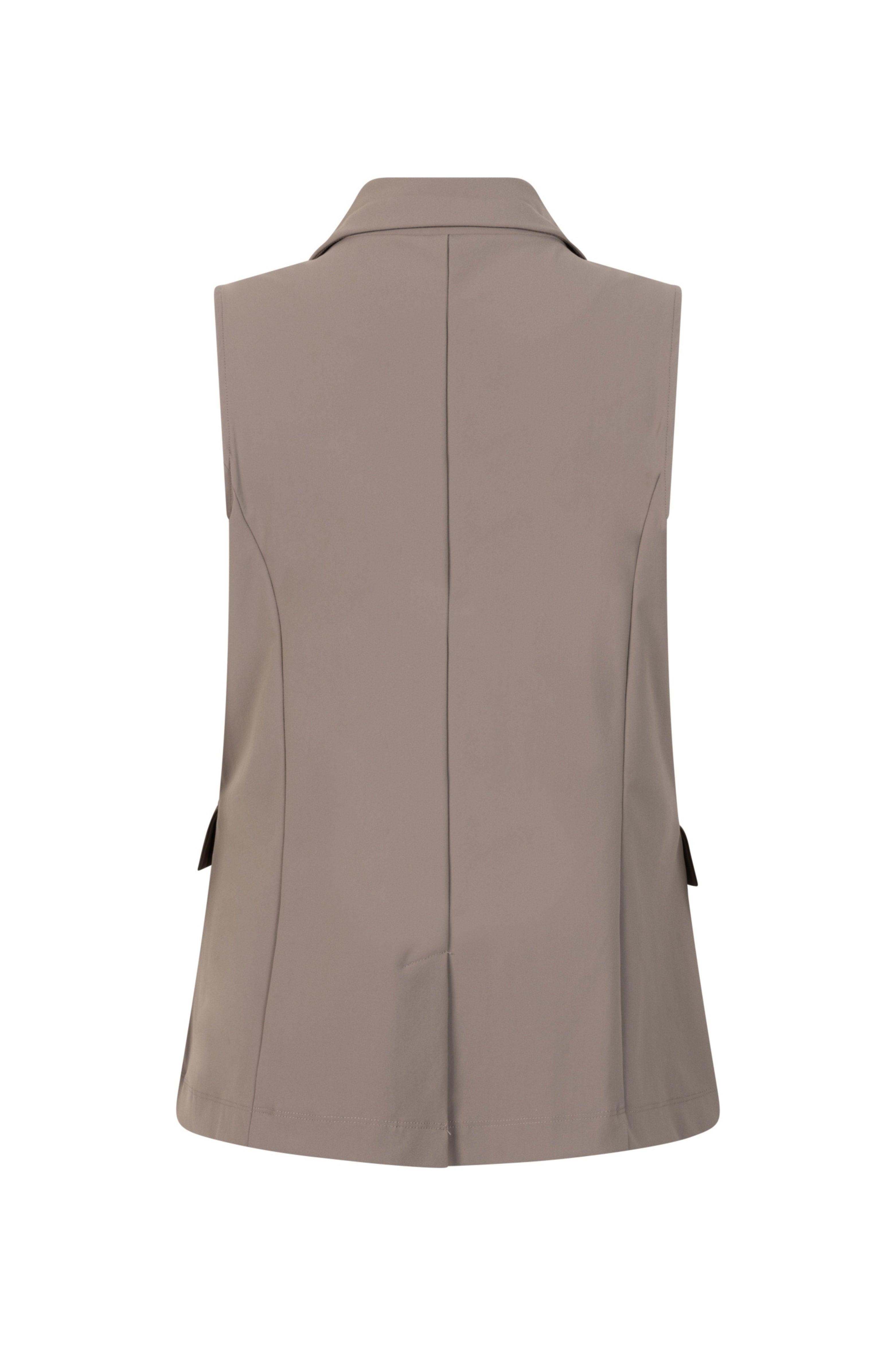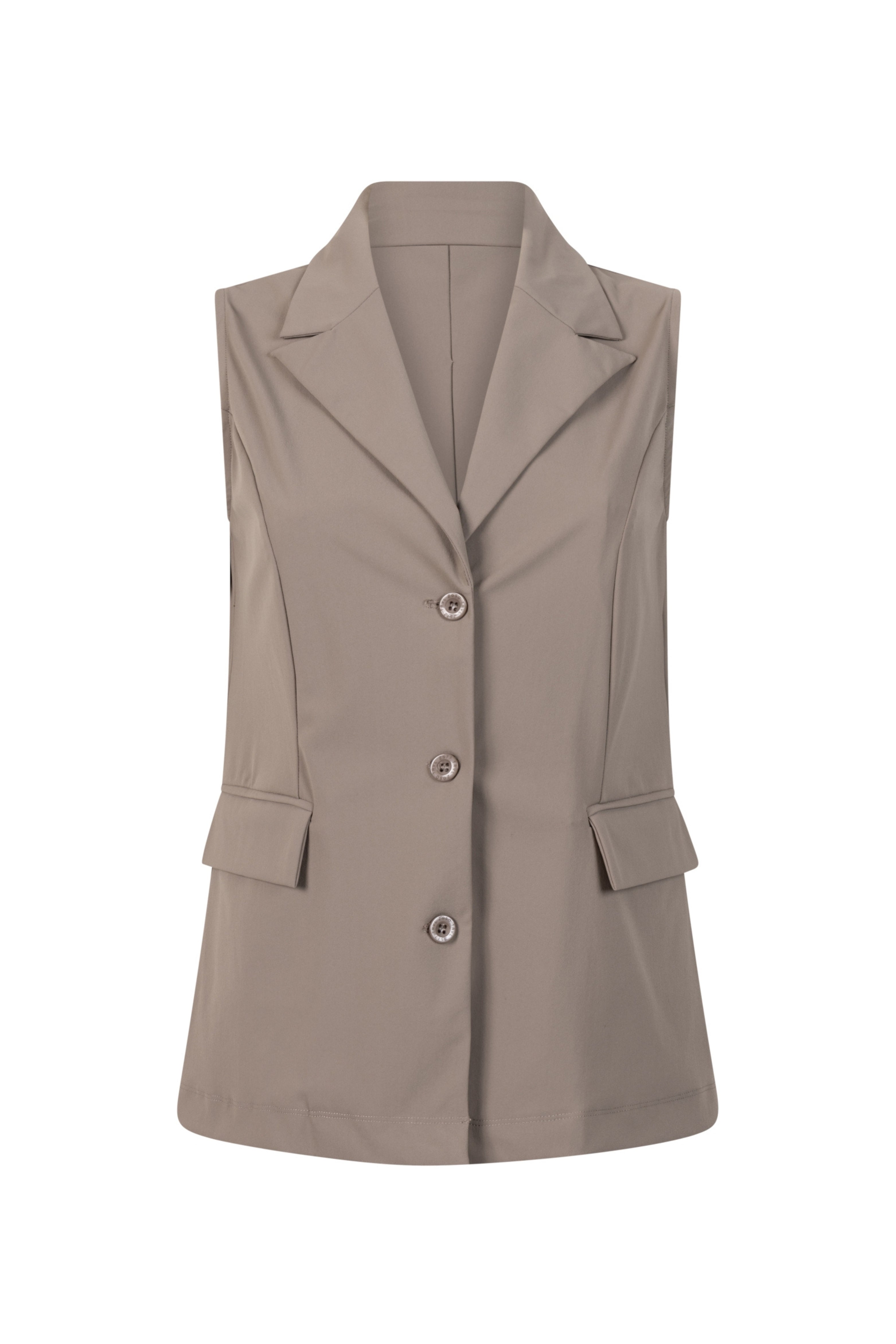 De Travel Gilet Angelique Taupe 251 van Zoso is een elegante en veelzijdige mouwloze blazer die perfect is voor een gelaagde look. Het gilet is uitgevoerd in een zachte taupekleur en heeft een klassieke reverskraag met een knoopsluiting aan de voorkant.