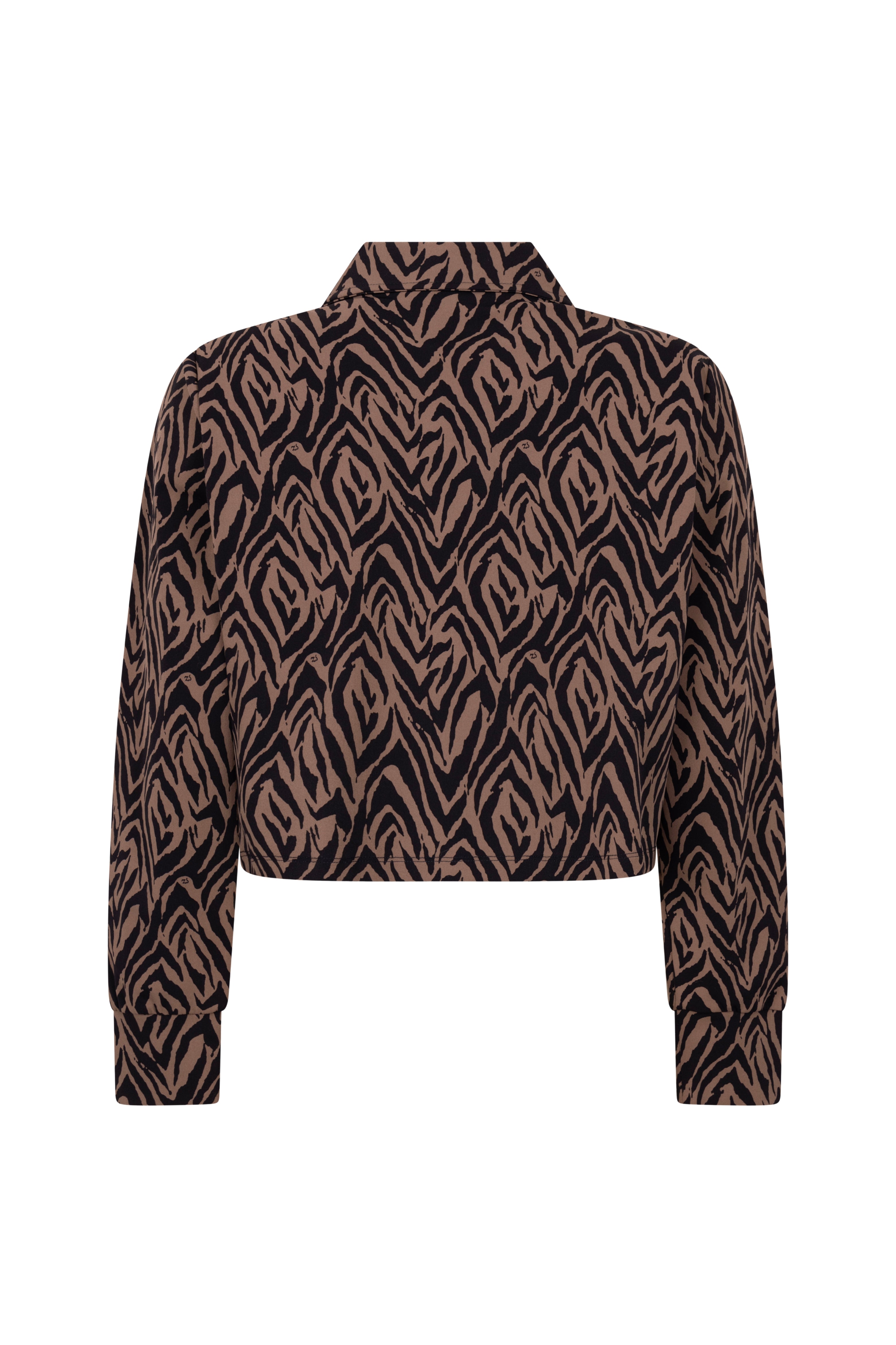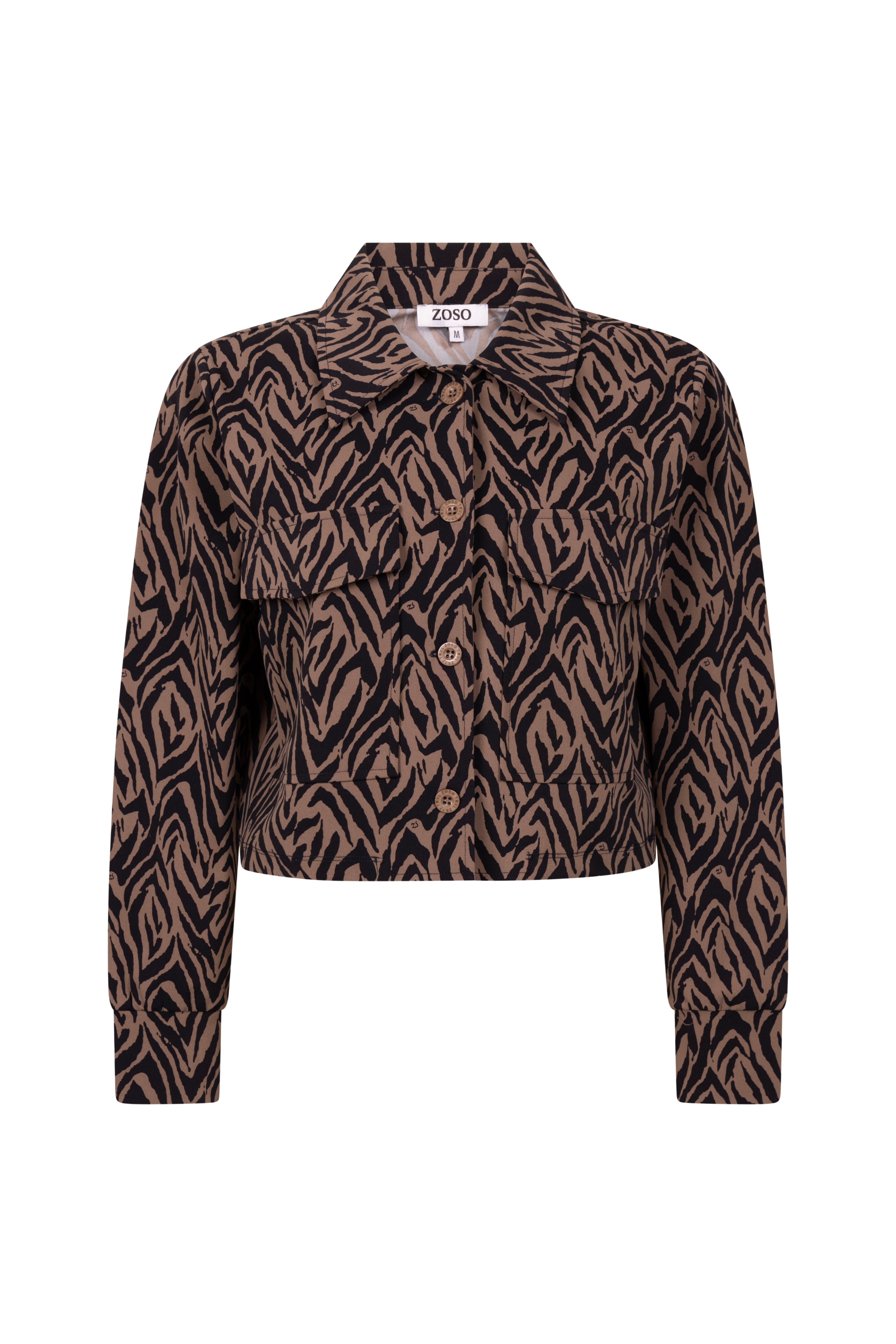 De Travel Jacket Alma Mocha Navy van Zoso is een korte, stijlvolle blouse-jacket met een opvallende all-over print. Voorzien van kraag, knoopsluiting en borstzakken. Ga voor een trendy, casual look.