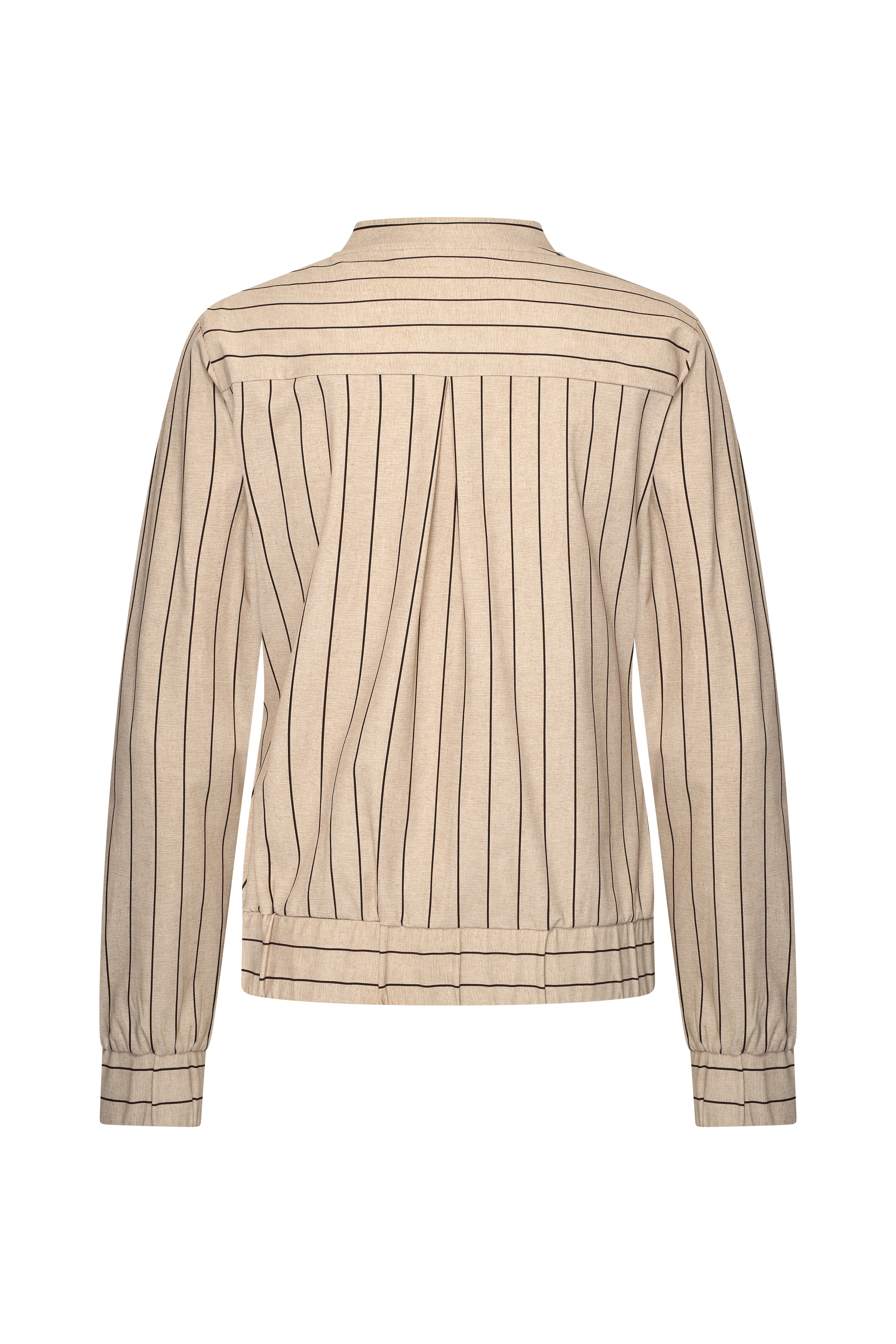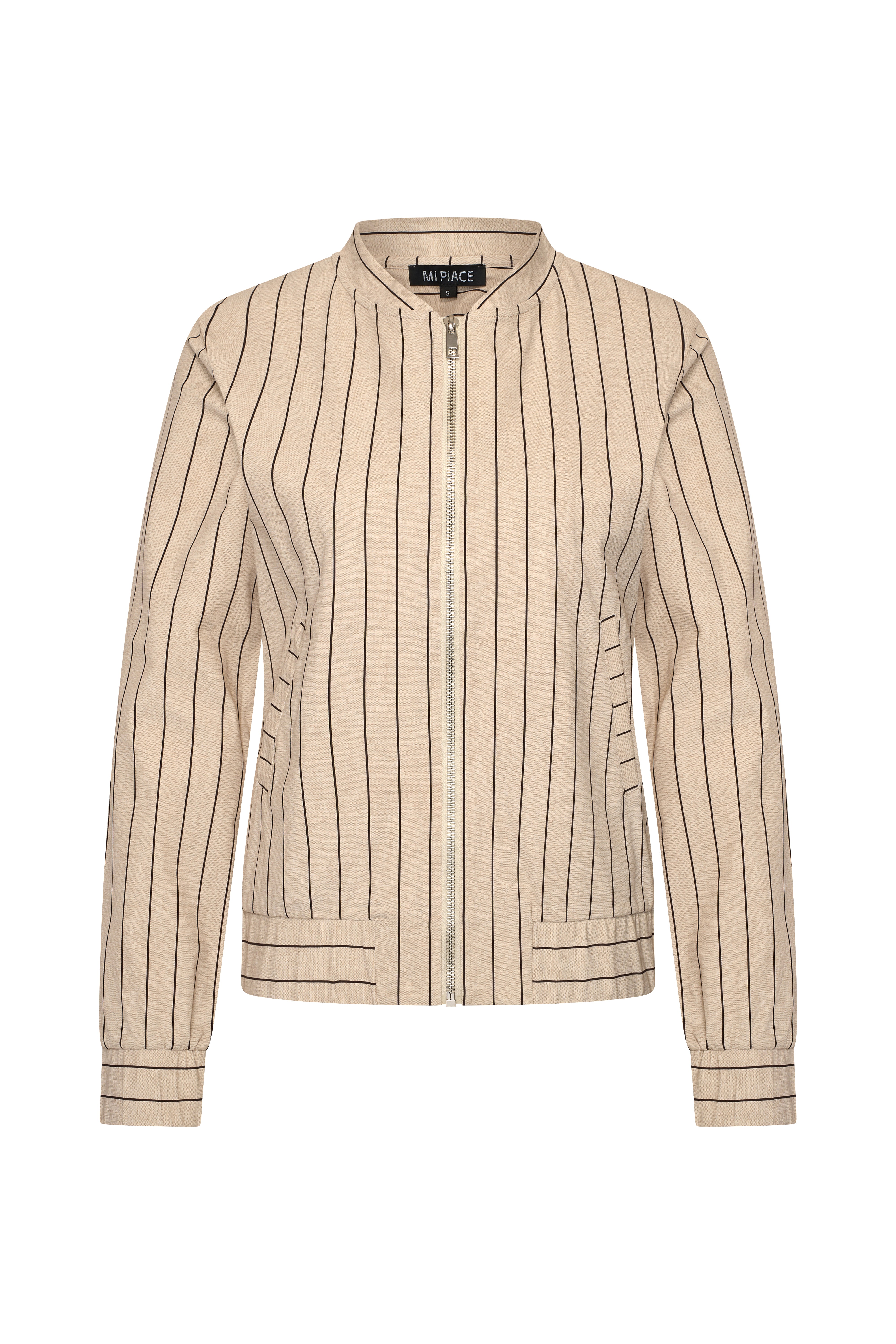 De Travel Jacket Classic Stripe Print Latte van Mi Piace is een stijlvol jasje van comfortabele travelstof met verfijnde streepprint. Voorzien van ritssluiting, opstaande kraag en elastische boorden. Kreukarm en ideaal voor werk en onderweg.