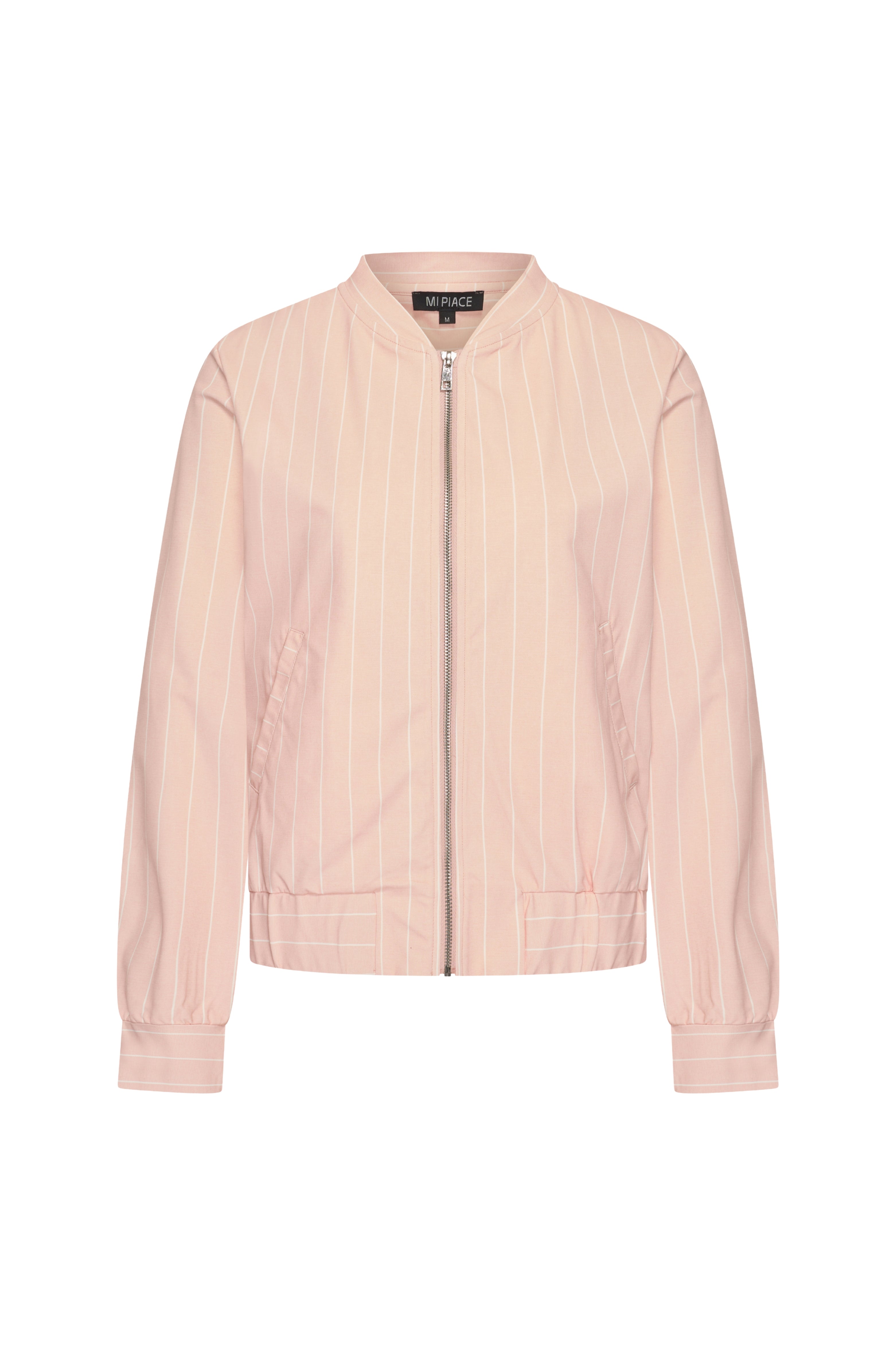 De Travel Jacket Classic Stripe Print Mellow Rose van Mi Piace is een licht en comfortabel jasje van travelstof met elegante streepprint. Voorzien van ritssluiting, opstaande kraag en elastische boorden. Kreukarm en perfect voor werk en reizen.