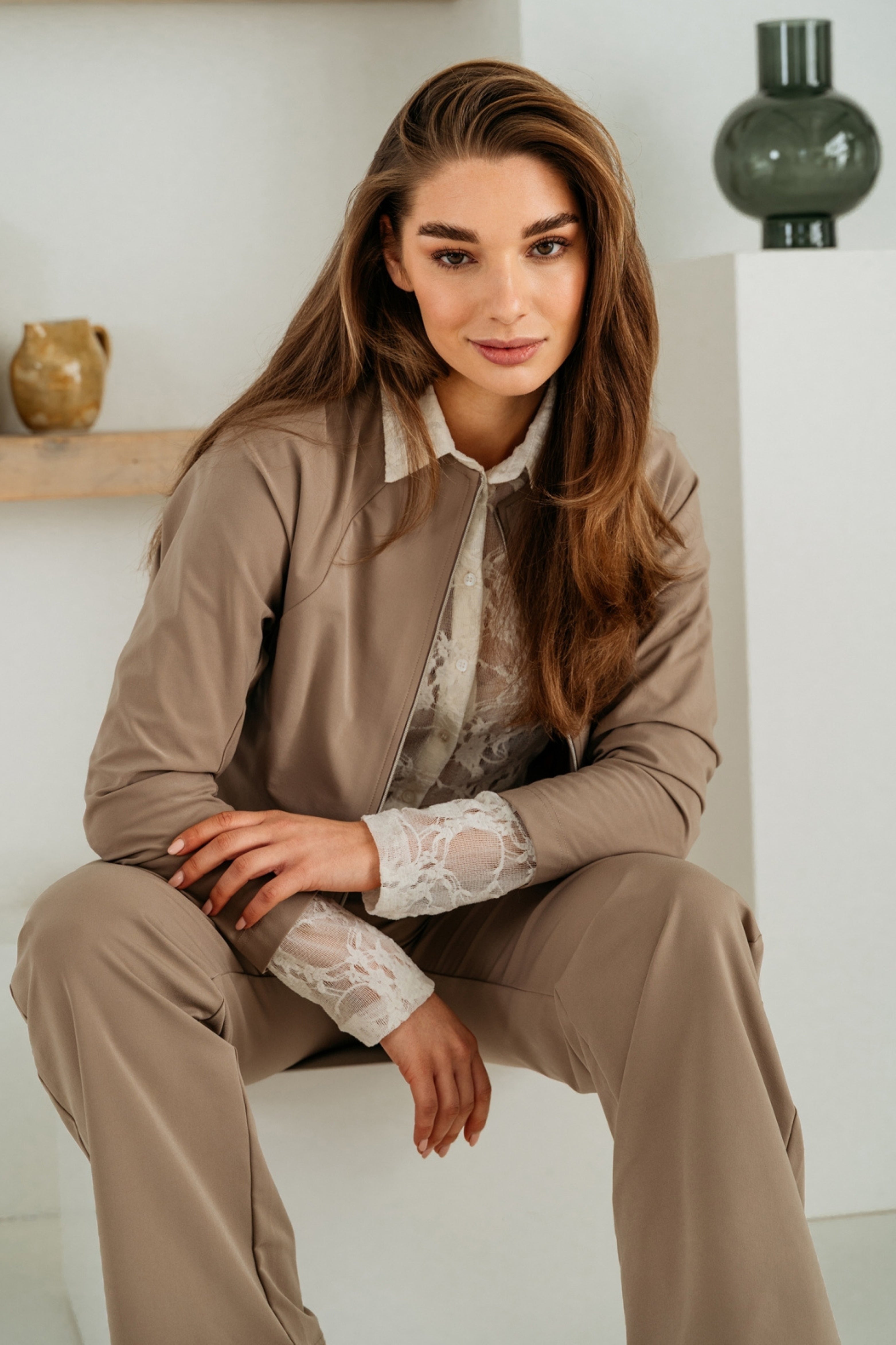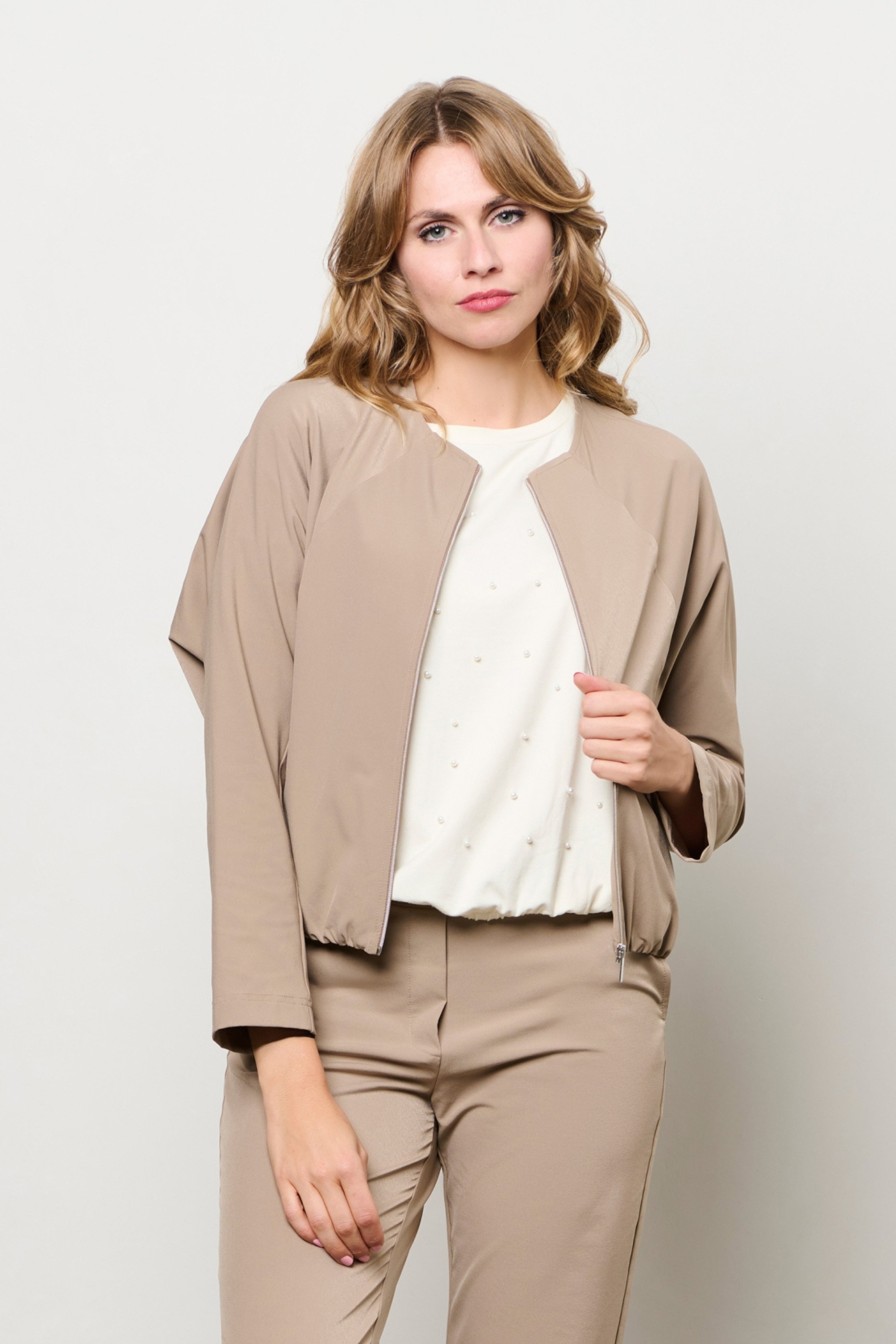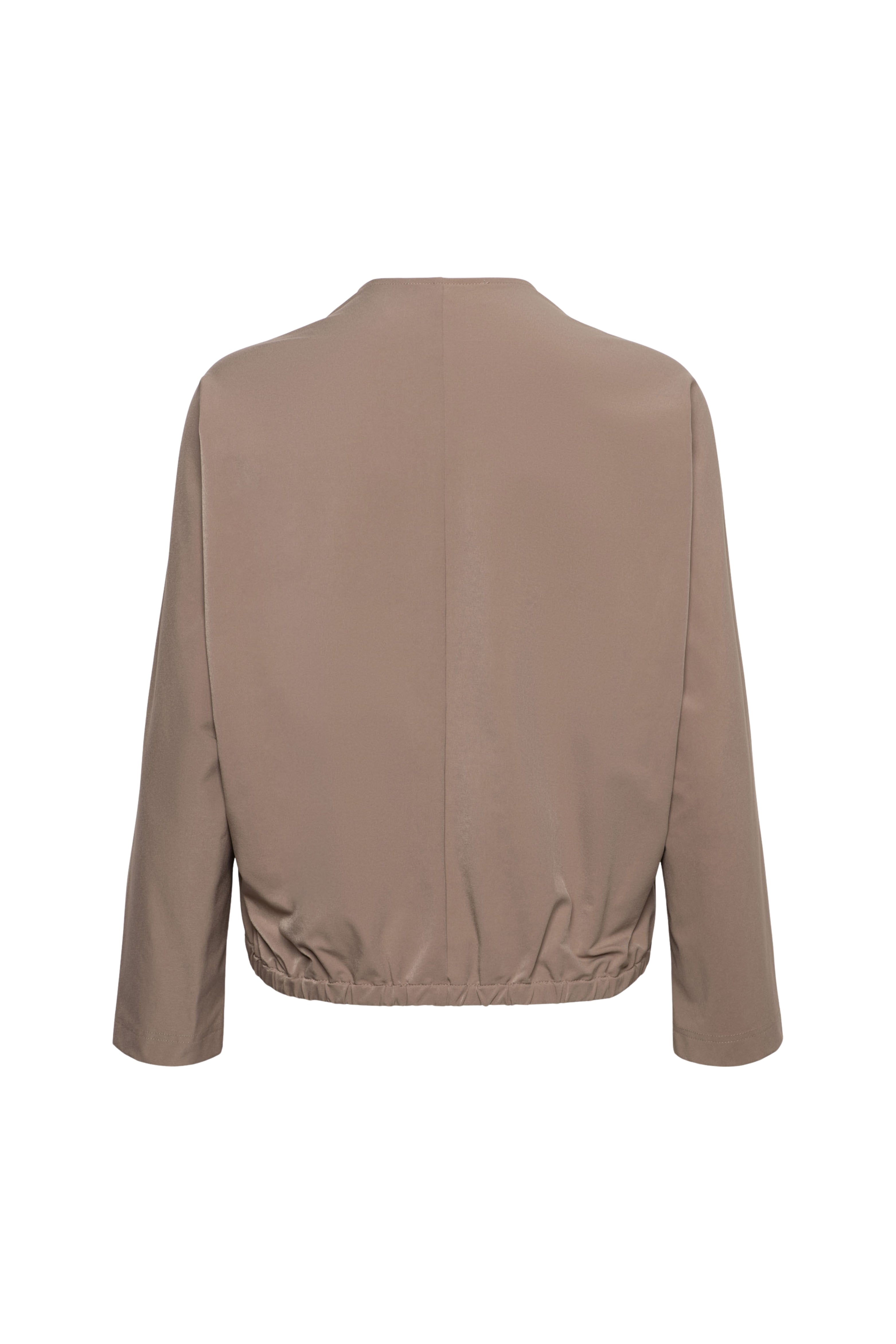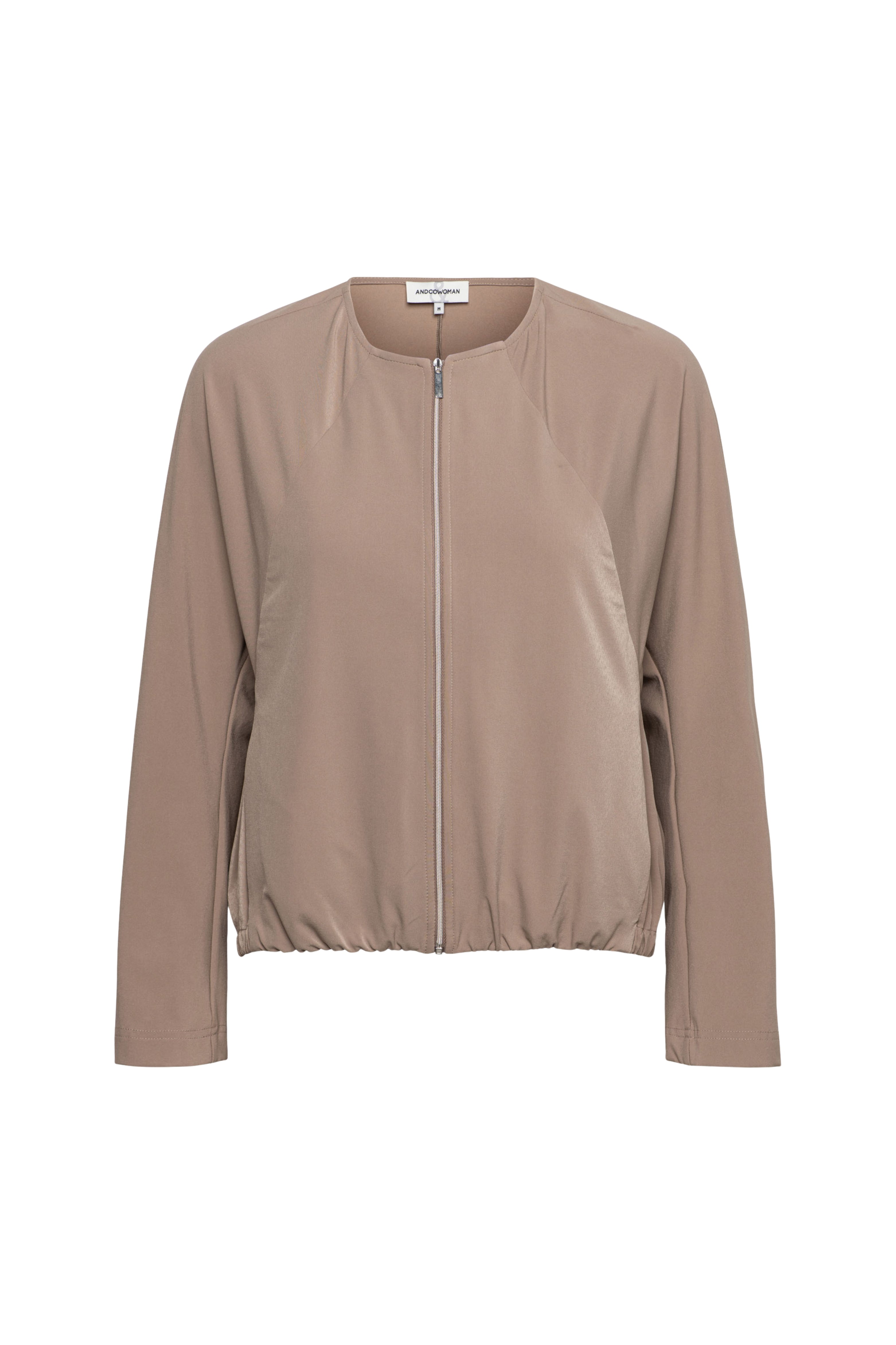 Jacket Pihla Taupe van &Co Woman is een stijlvolle, licht glanzende jas met ronde hals en ritssluiting. De elastische zoom zorgt voor een moderne, blousende fit en een comfortabele uitstraling.