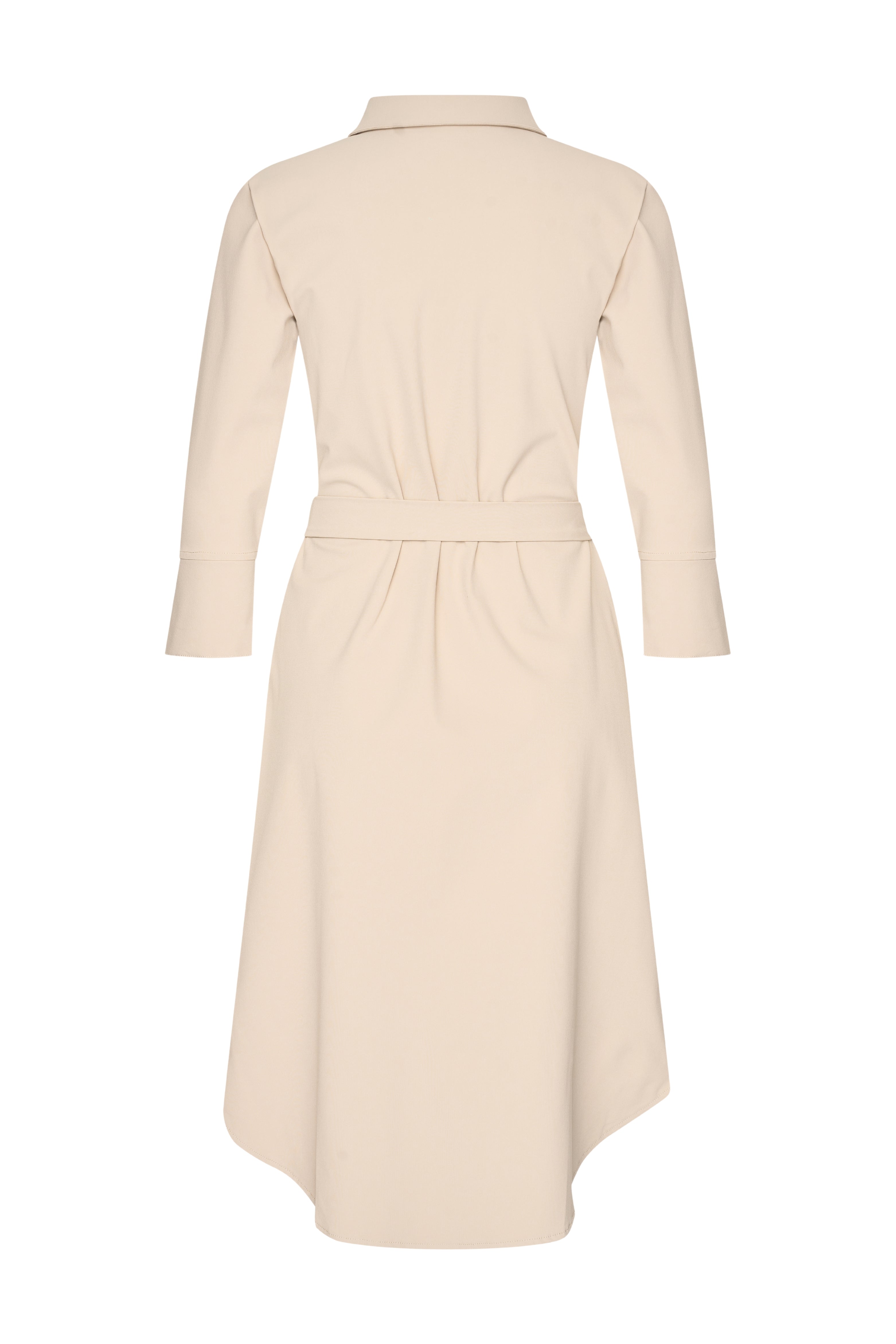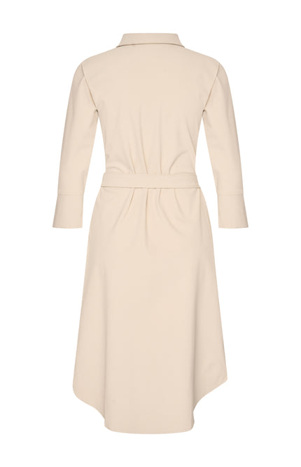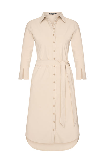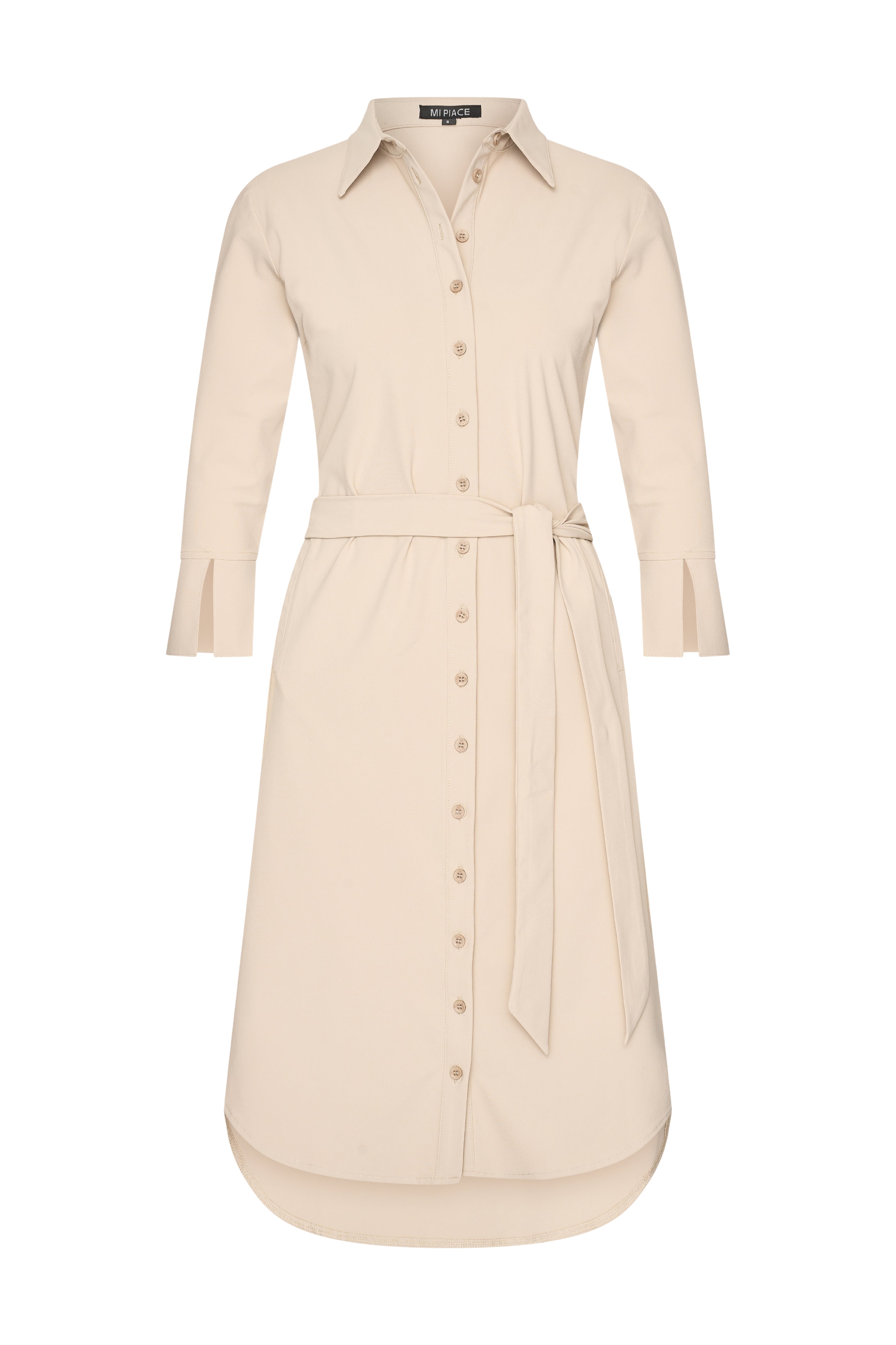 De Mi Piace Travel Jurk Beige is een elegante doorknoopjurk met strikceintuur in de taille. Gemaakt van comfortabele, kreukvrije travelkwaliteit. Perfect voor een stijlvolle en moeiteloze look, van werkdag tot weekend.