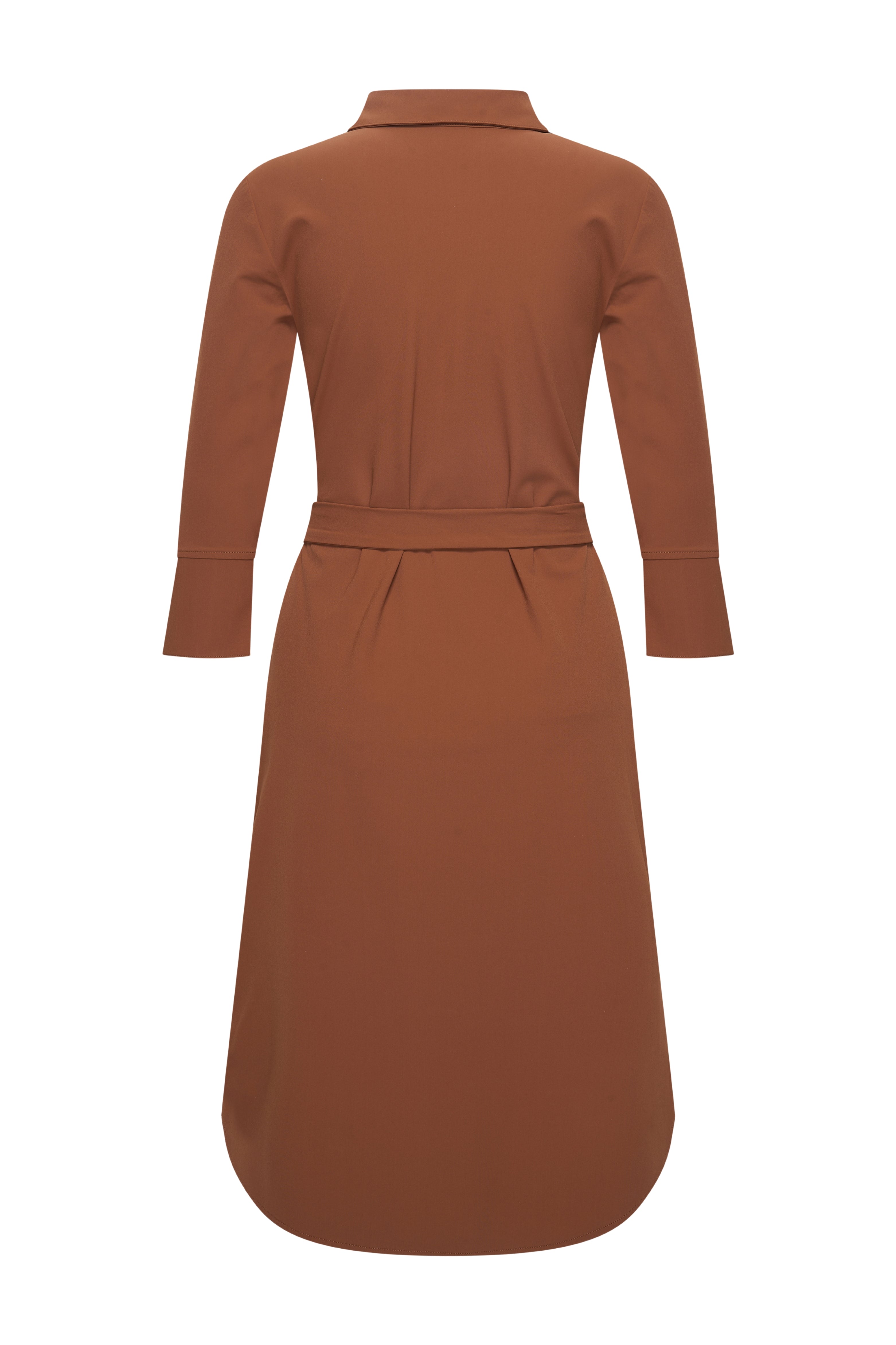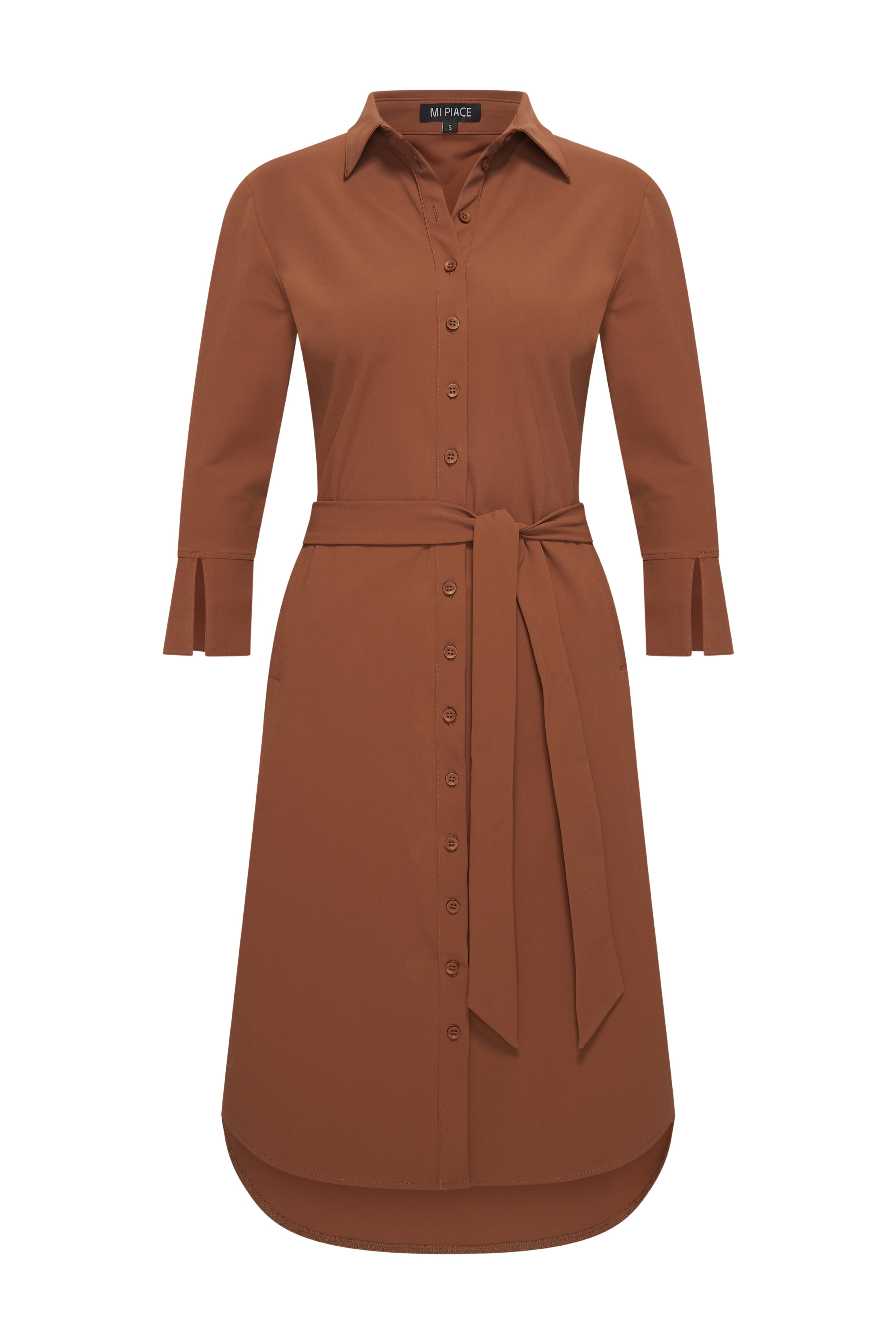 De Travel Jurk Caramel van Mi Piace is een elegante doorknoopjurk met ceintuur, gemaakt van comfortabele, kreukvrije travelstof. Stijlvol en praktisch, ideaal voor zowel werk als vrije tijd.