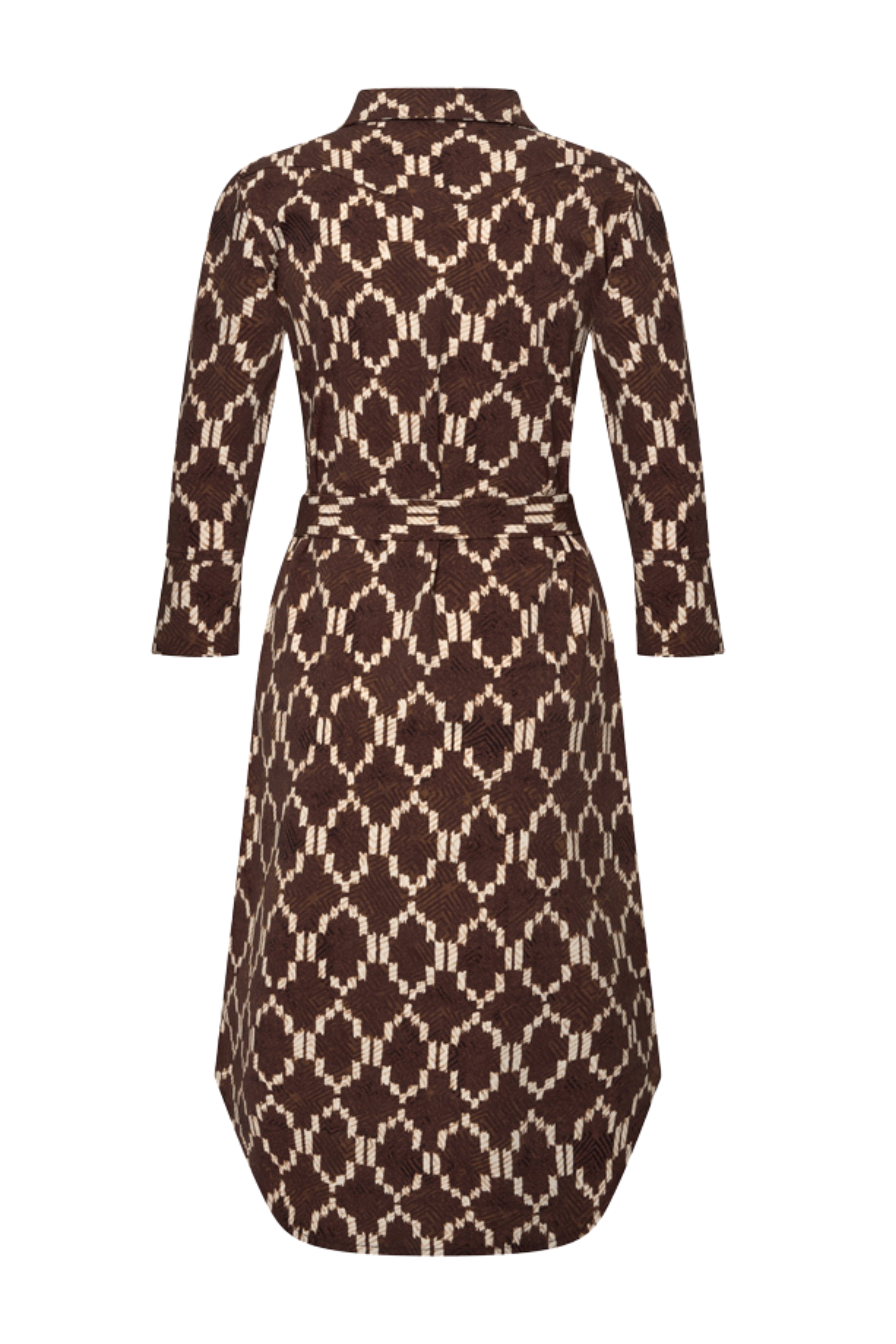 De Travel Jurk Ikat Print Espresso van Mi Piace is een stijlvolle jurk met een grafisch ikat dessin en een tijdloze uitstraling. De comfortabele travelstof, knoopsluiting en ceintuur in de taille zorgen voor een prettige pasvorm en een elegant silhouet. Ideaal voor zowel werk als vrije tijd.