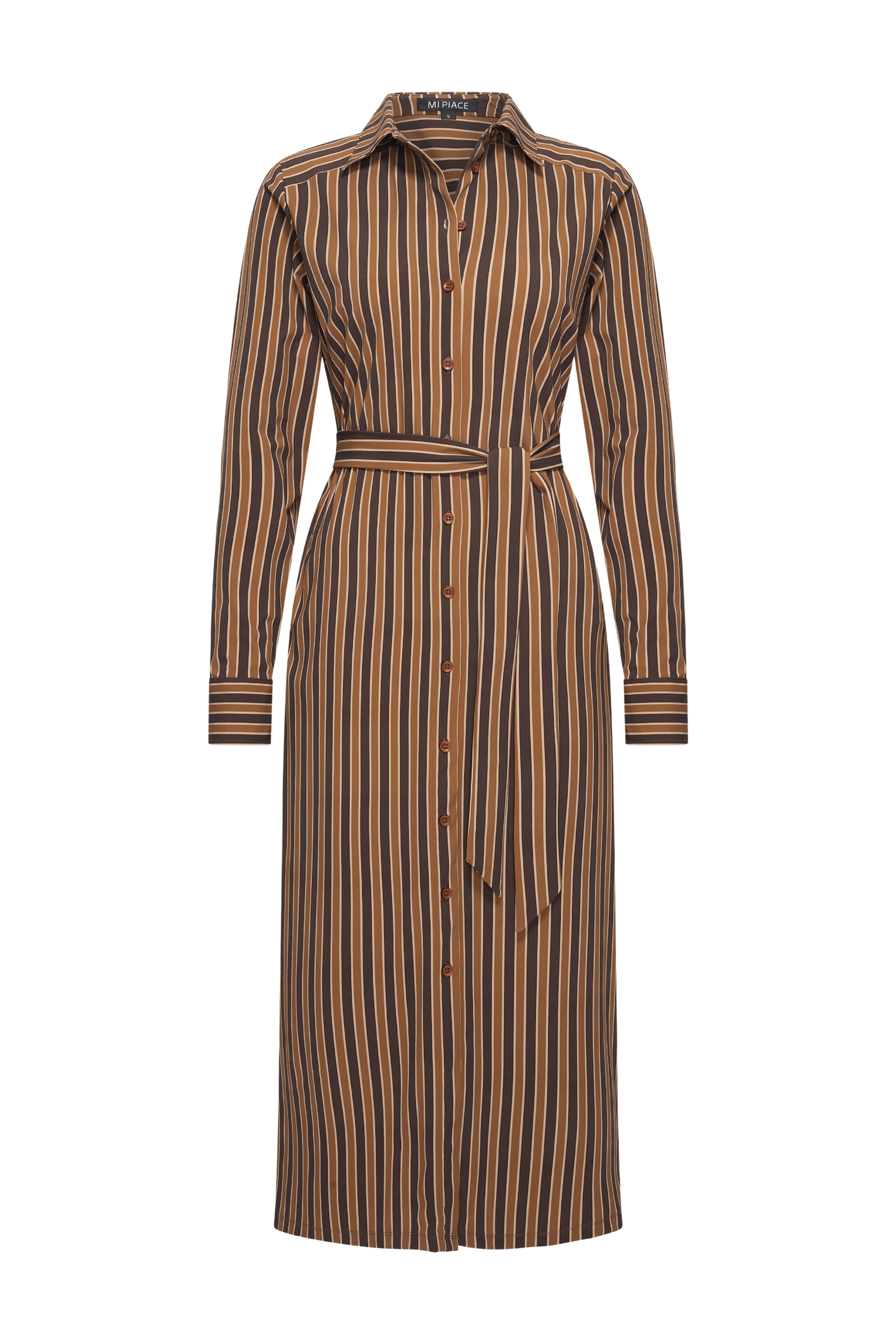 Travel Jurk Stripe Print Espresso Caramel van Mi Piace is een elegante blousejurk in travelstof. Het gestreepte dessin in espresso en caramel geeft een moderne en stijlvolle uitstraling. Voorzien van een knoopsluiting en bijpassende ceintuur om de taille te accentueren.