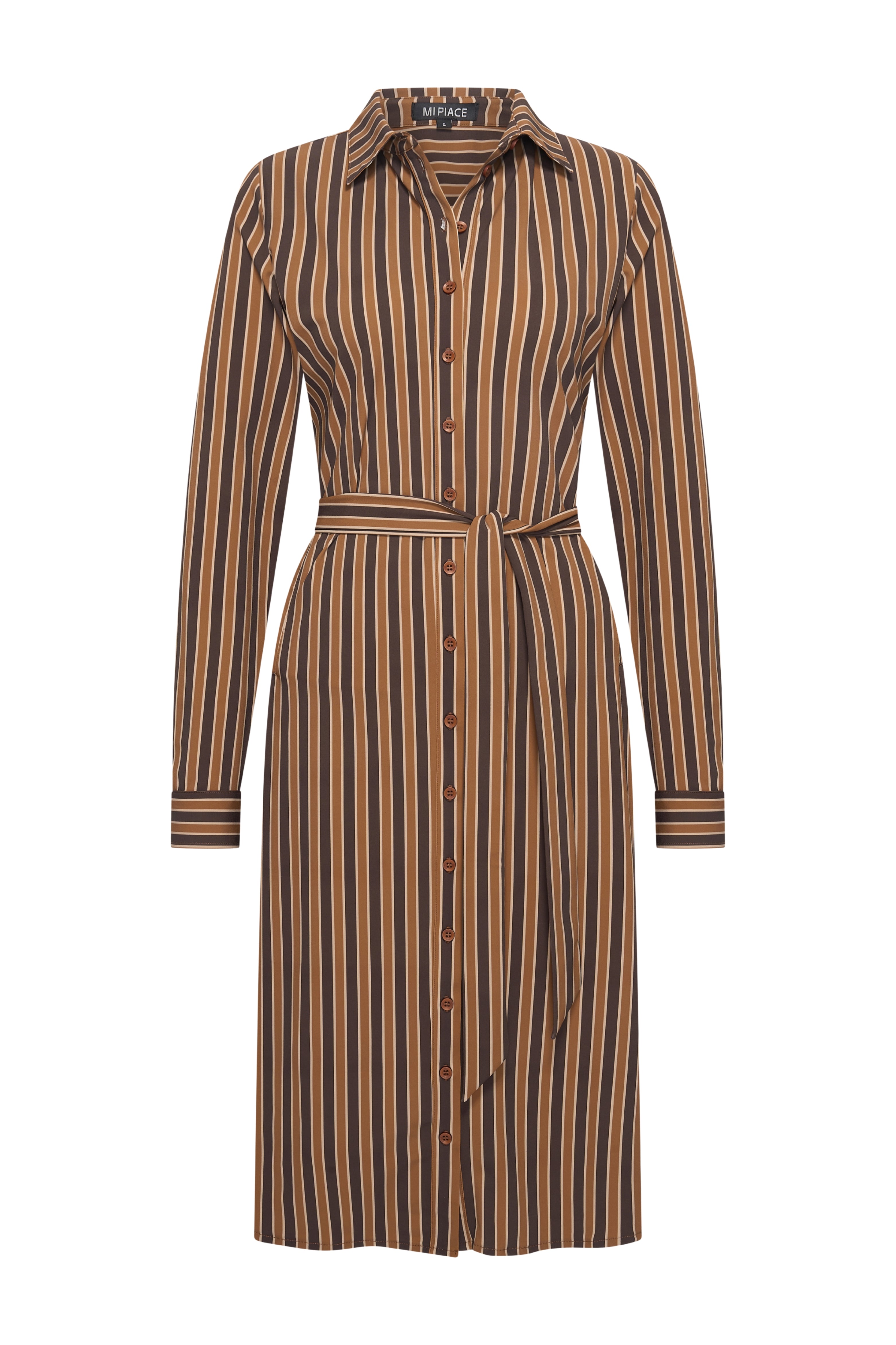 Travel Jurk Stripe Print Espresso Latte van Mi Piace is een moderne blousejurk uitgevoerd in comfortabele travelstof. De bruine strepen zorgen voor een elegante uitstraling. Met de knoopsluiting en bijpassende ceintuur draag je deze jurk zowel losjes als getailleerd.