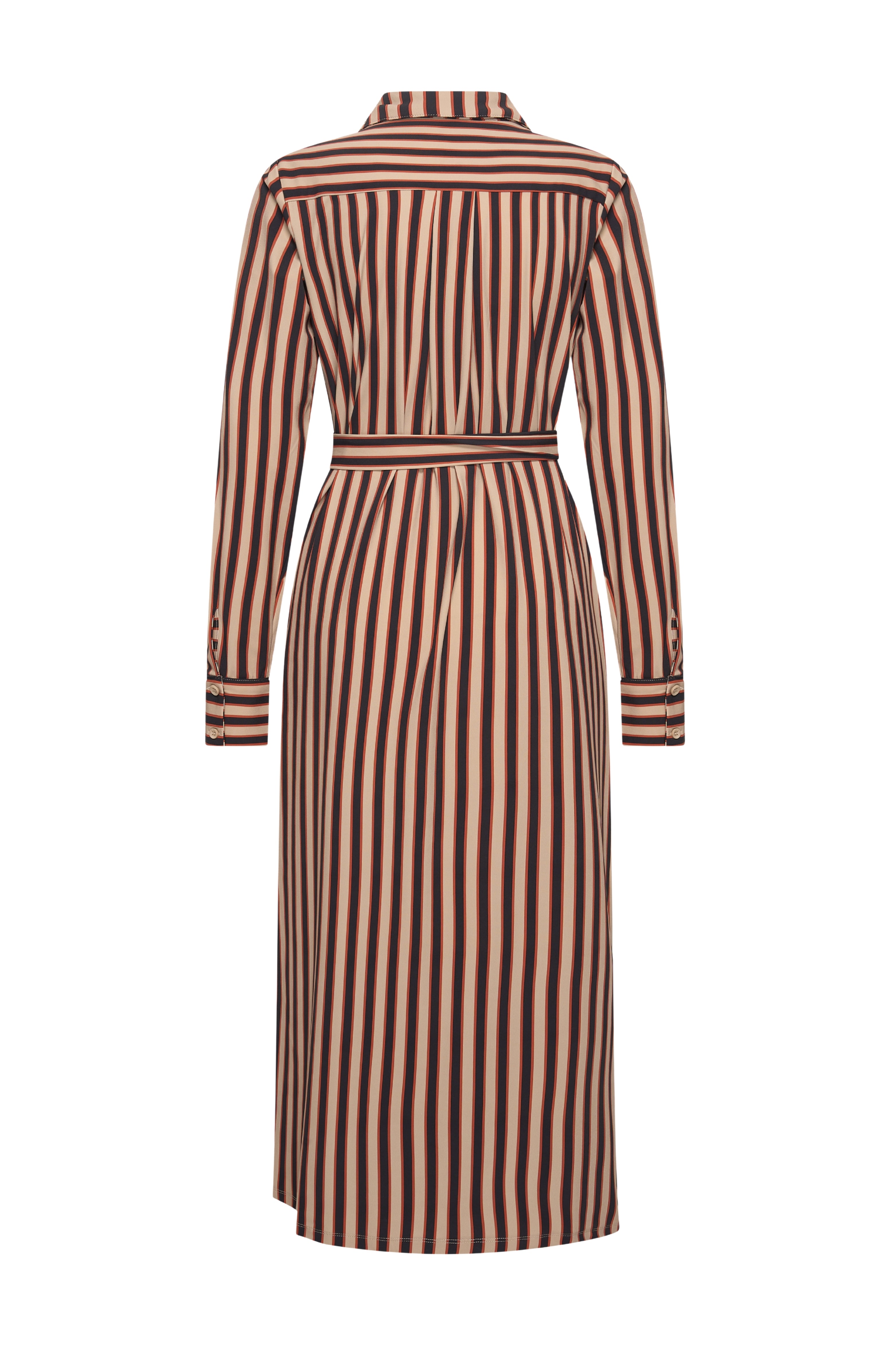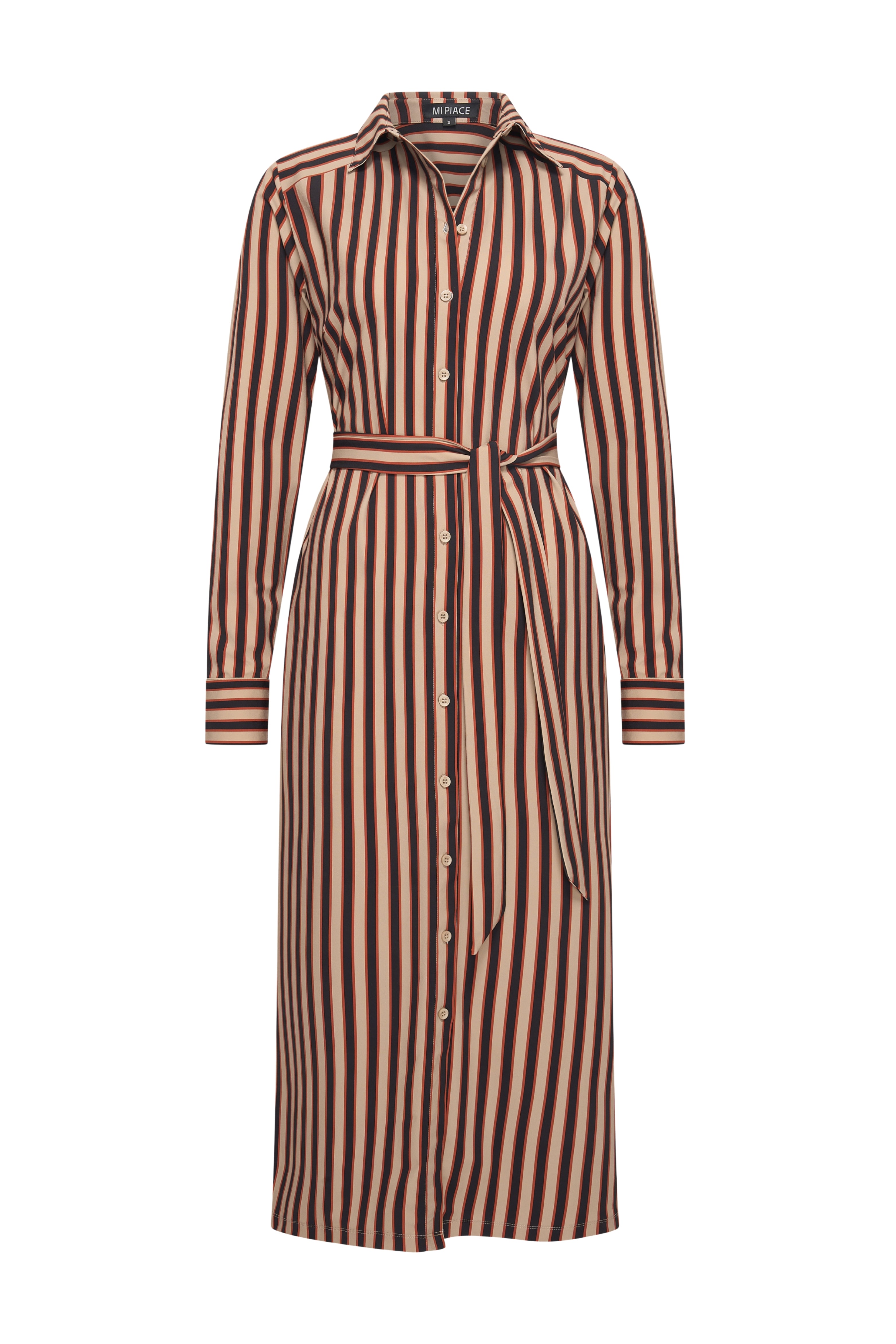 Travel Jurk Stripe Print Espresso Latte van Mi Piace is een moderne blousejurk uitgevoerd in comfortabele travelstof. De bruine strepen met rode accent zorgt voor een elegante uitstraling. Met de knoopsluiting en bijpassende ceintuur draag je deze jurk zowel losjes als getailleerd.