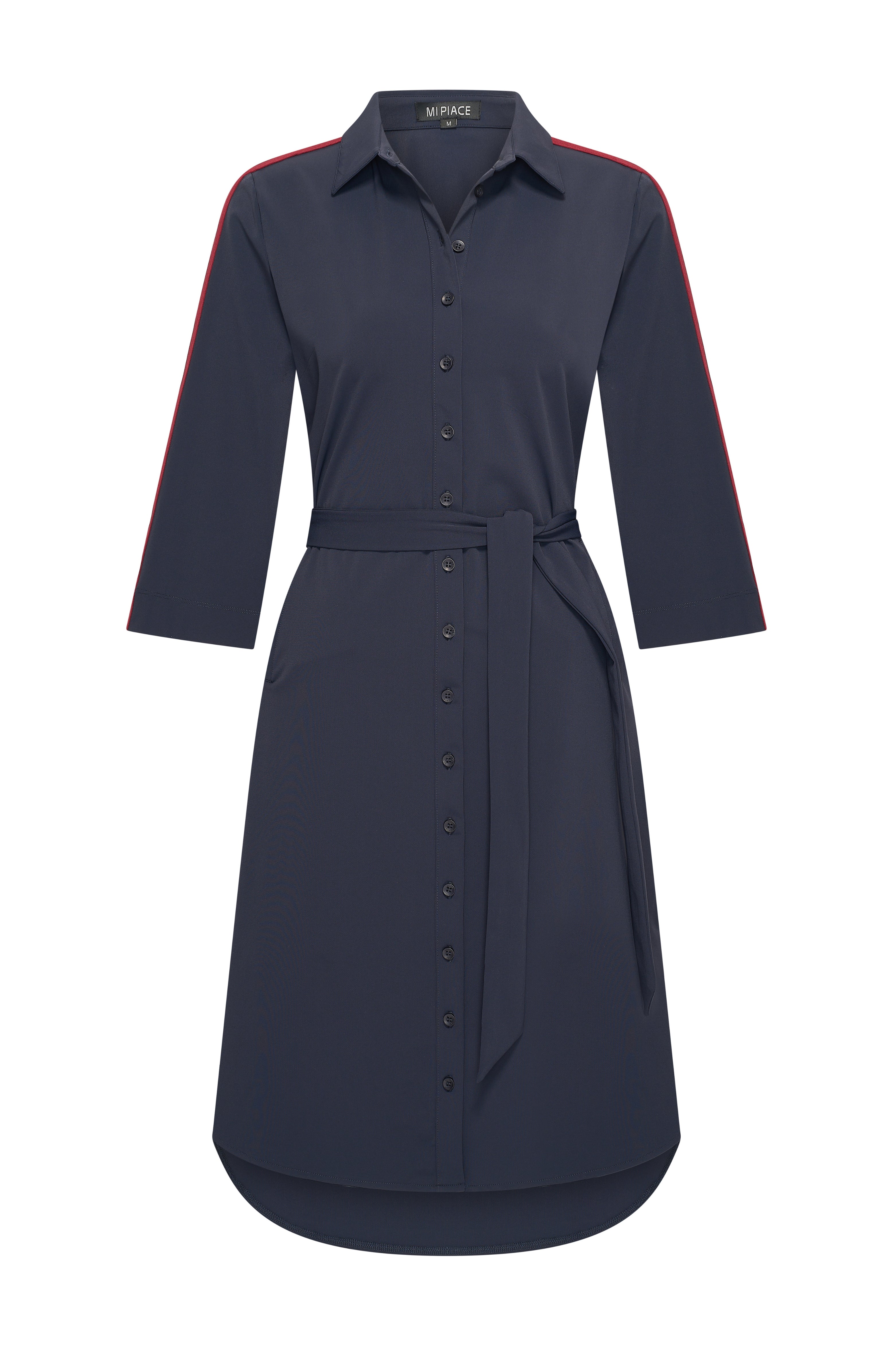 De Travel Jurk Tape Navy van Mi Piace is een sportieve doorknoopjurk met een vrouwelijke uitstraling. De contrasterende tape op de mouwen en het strikceintuur in de taille geven je look net dat beetje extra.