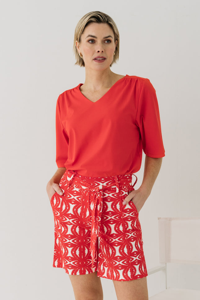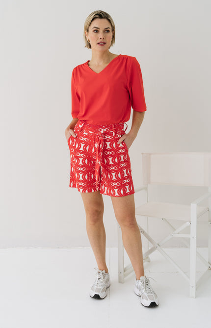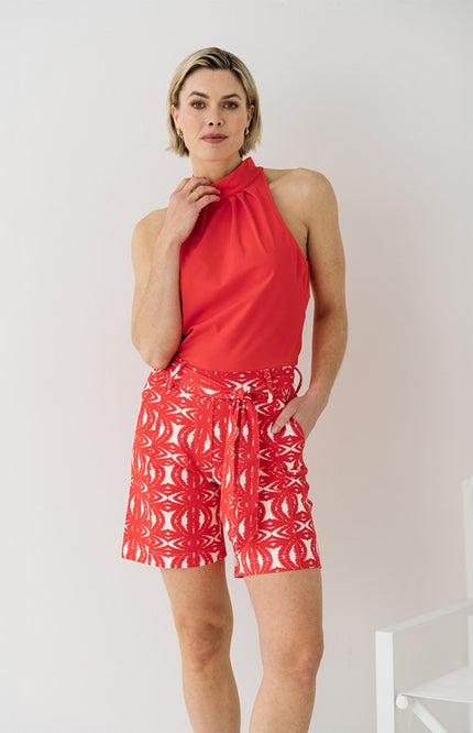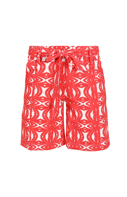 De Cuba short in African Red brengt tropische vibes in een comfortabele fit. Gemaakt van soepele travelstof met een opvallende print, strikceintuur en relaxte pasvorm. Perfect voor een zomerse city look of een dag op het strand!