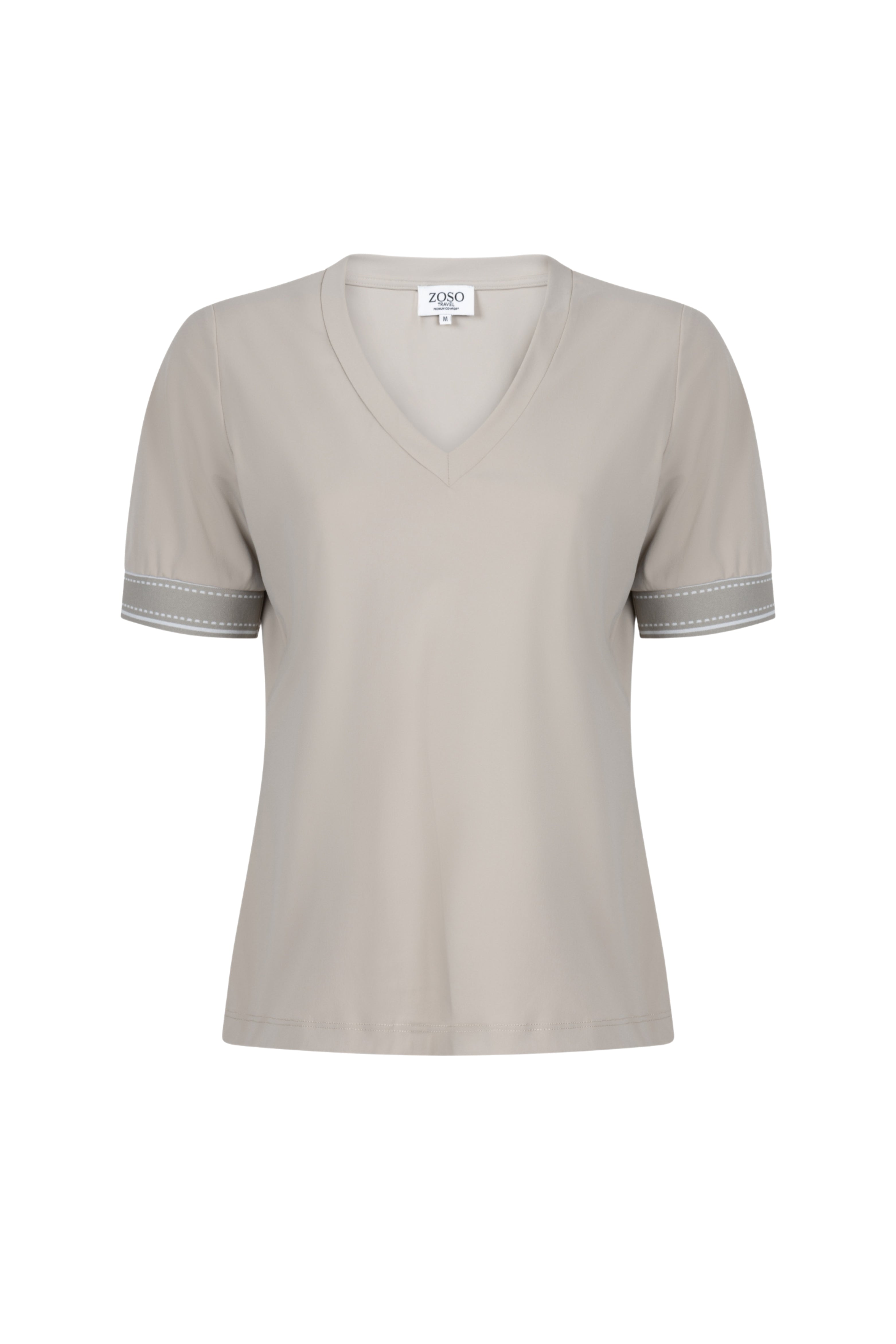 Het Travel T-Shirt Desiree Sand Stone van Zoso is een elegante basic met een vrouwelijke V-hals en verfijnde gestreepte manchetdetails. Gemaakt van comfortabele travelstof die ademt en mooi in vorm blijft.