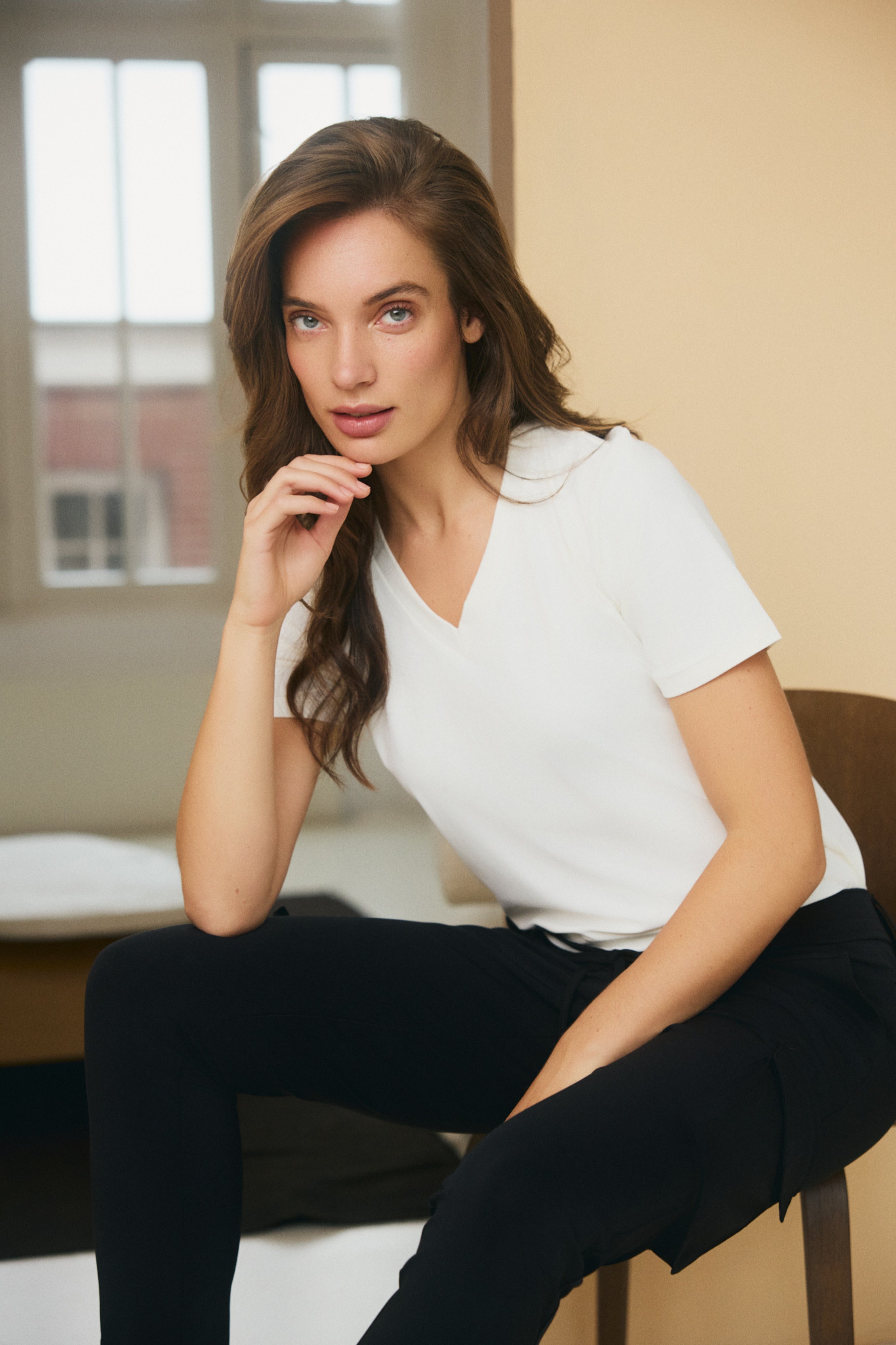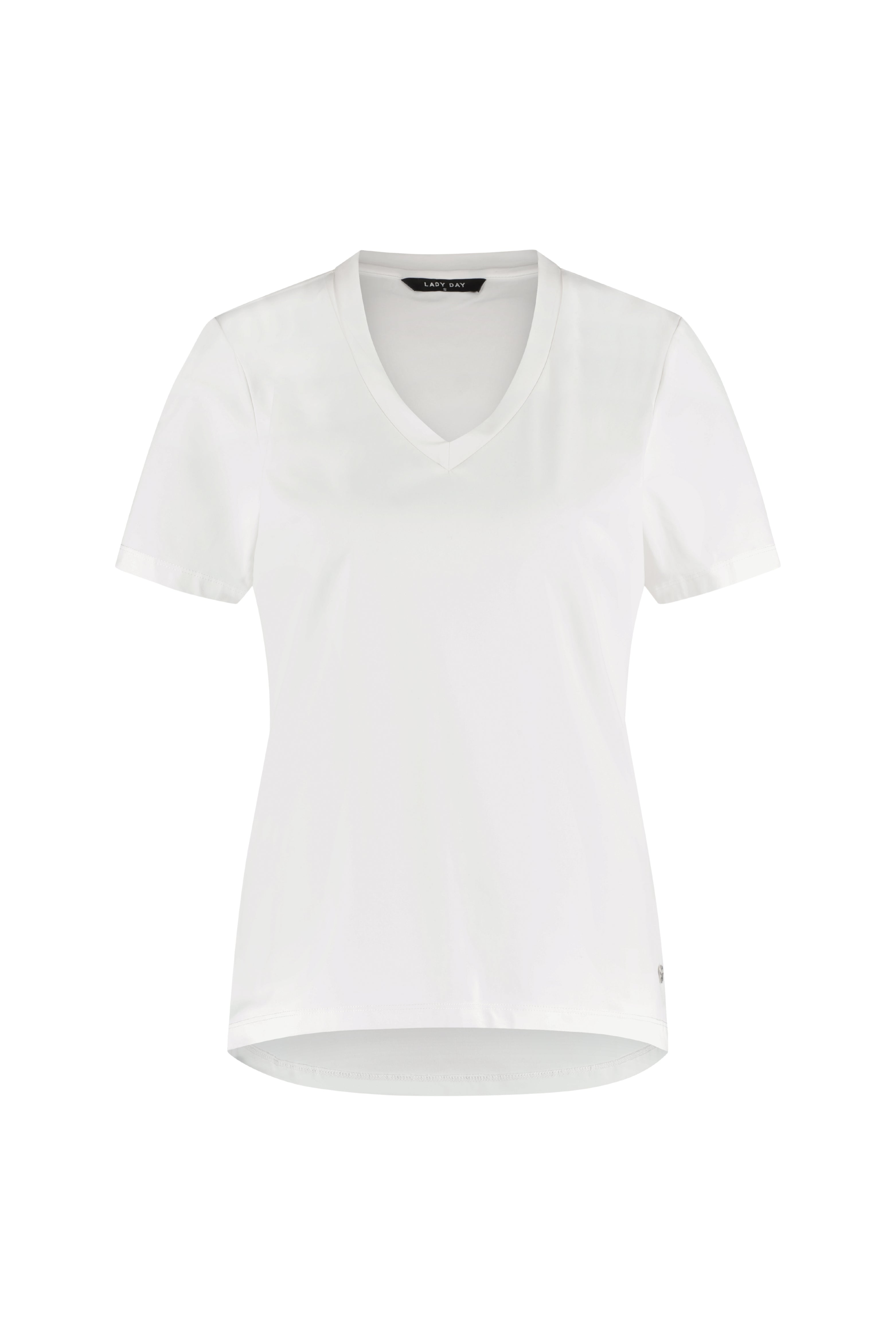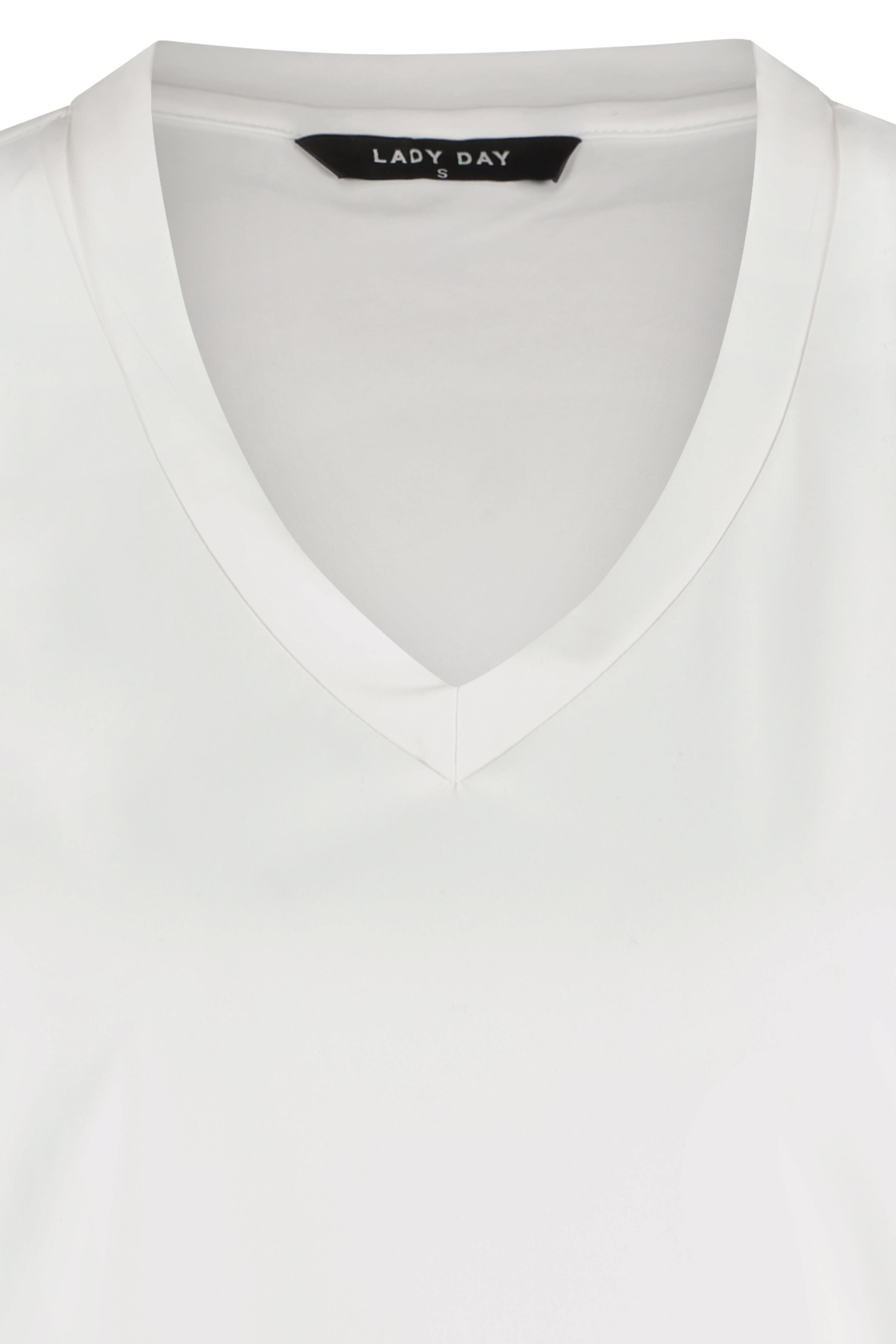 Het Travel T-shirt Tyler Offwhite van Lady Day is een stijlvol travel t-shirt met V-hals. De soepele stretchstof draagt luchtig en blijft de hele dag mooi in model. Perfect voor een frisse, minimalistische look van werk tot weekend.