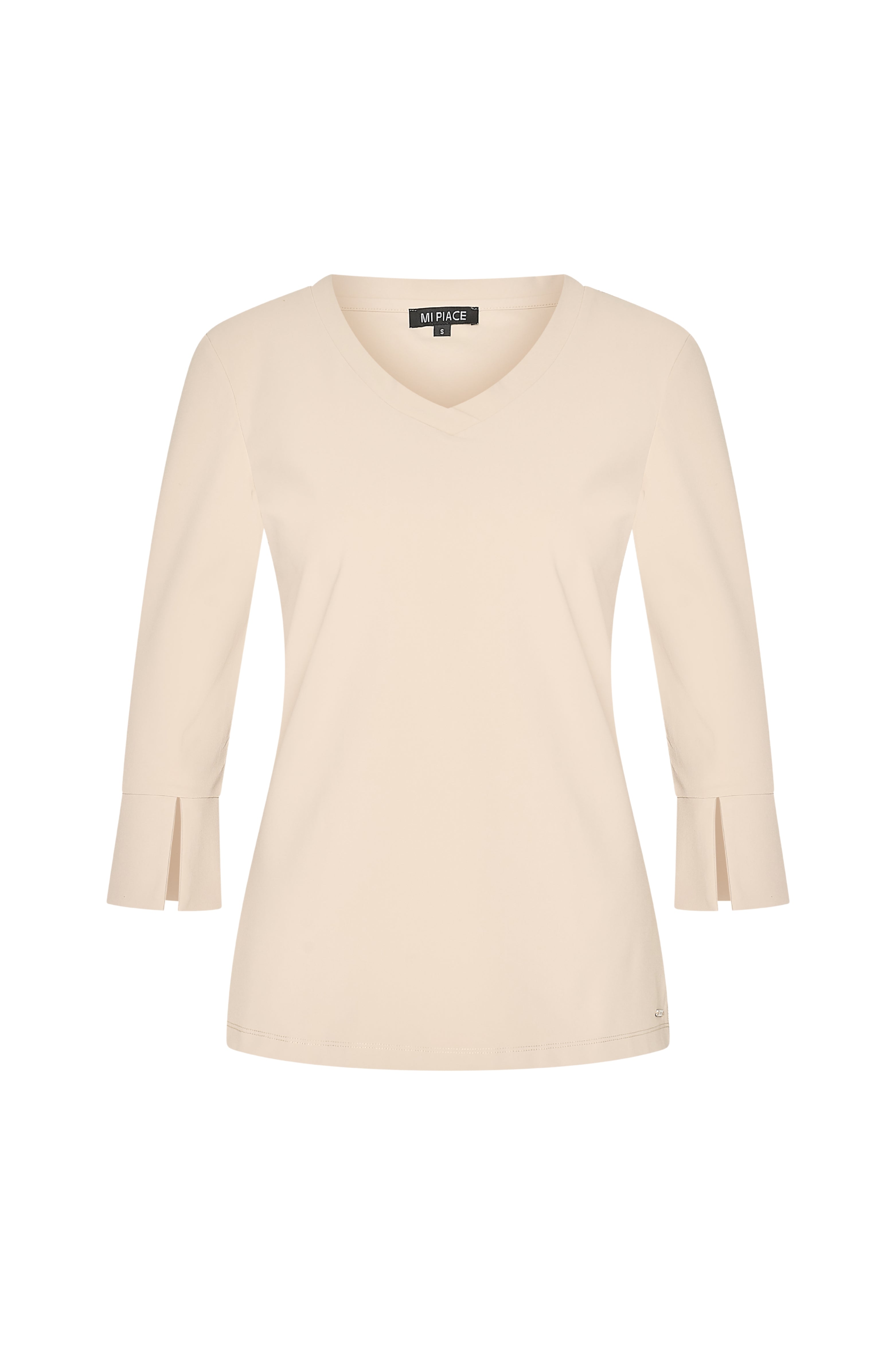 De Mi Piace Travel Top Beige is een vrouwelijke top met V-hals en elegante 3/4 mouwen met split. De ademende, stretchy travelkwaliteit zorgt voor ultiem comfort en een verzorgde look, ideaal voor elke dag.