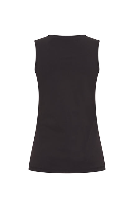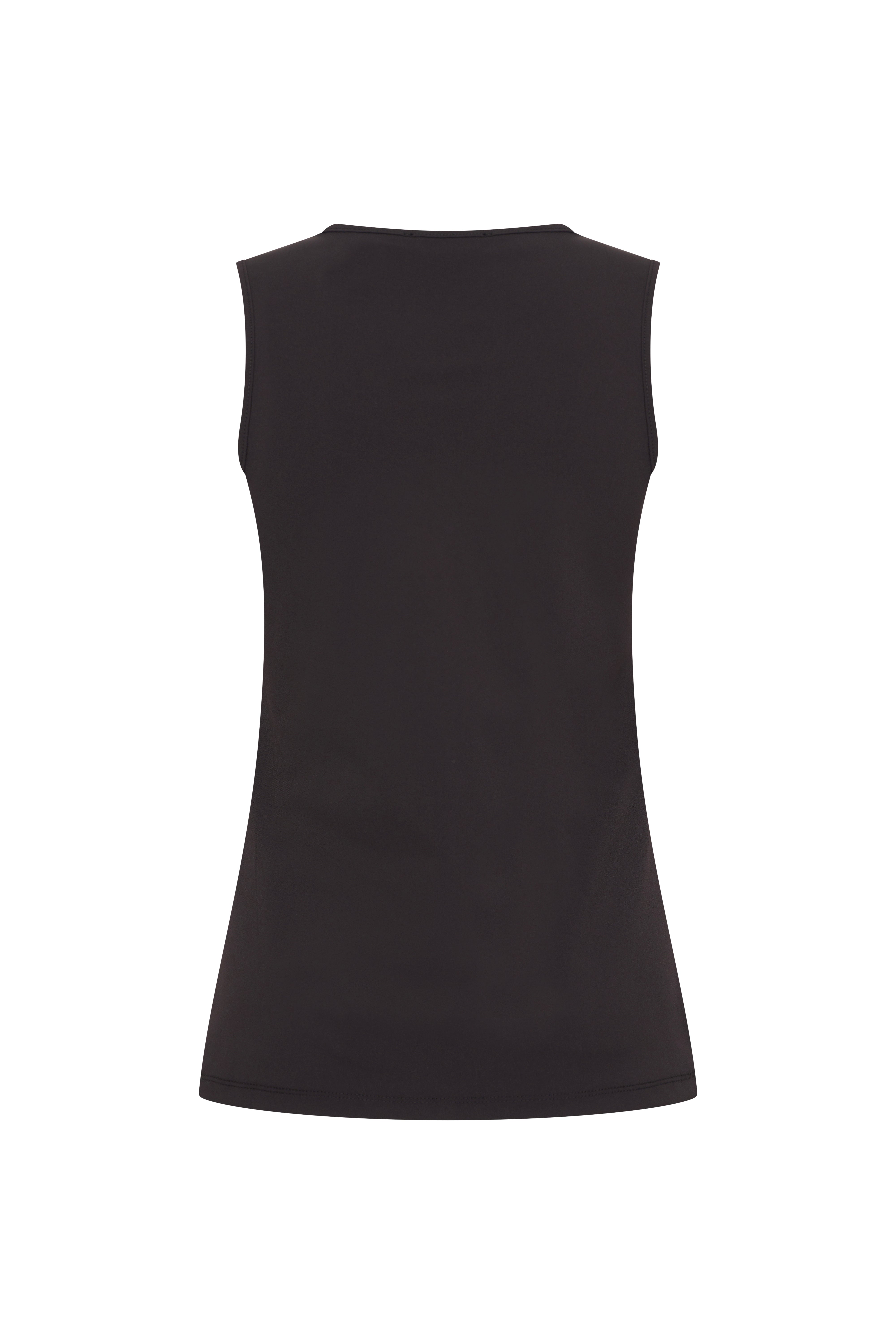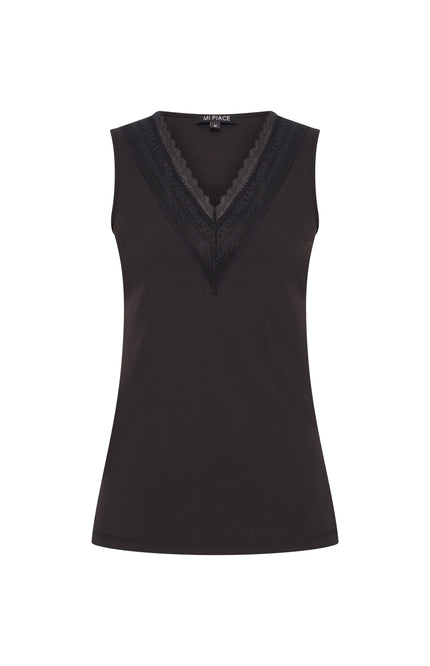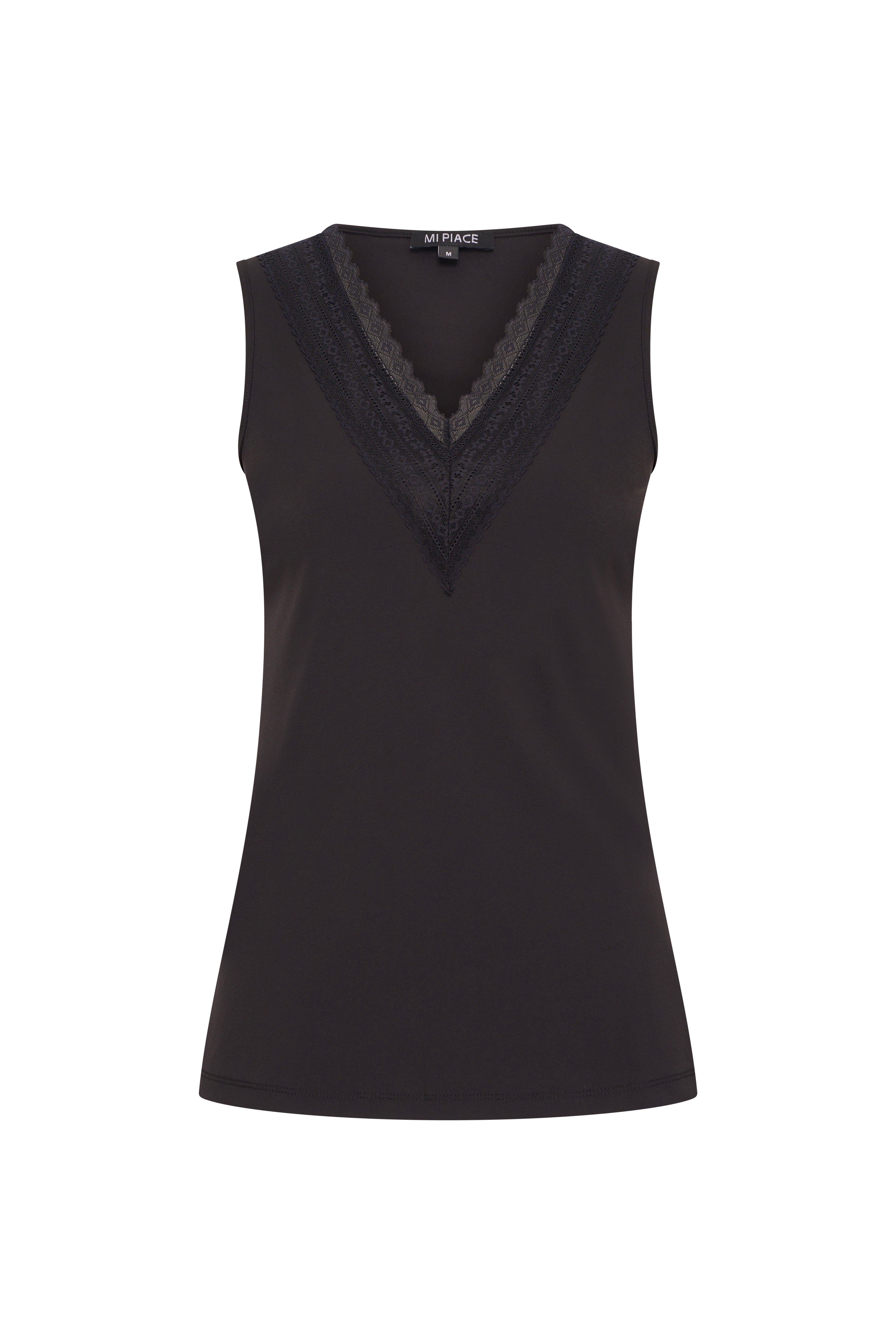 Voeg stijl toe aan je garderobe met deze zwarte top van Mi Piace. Het mouwloze ontwerp creëert een luchtige en zomerse uitstraling, terwijl het kanten detail aan de onderkant een romantische touch toevoegt.