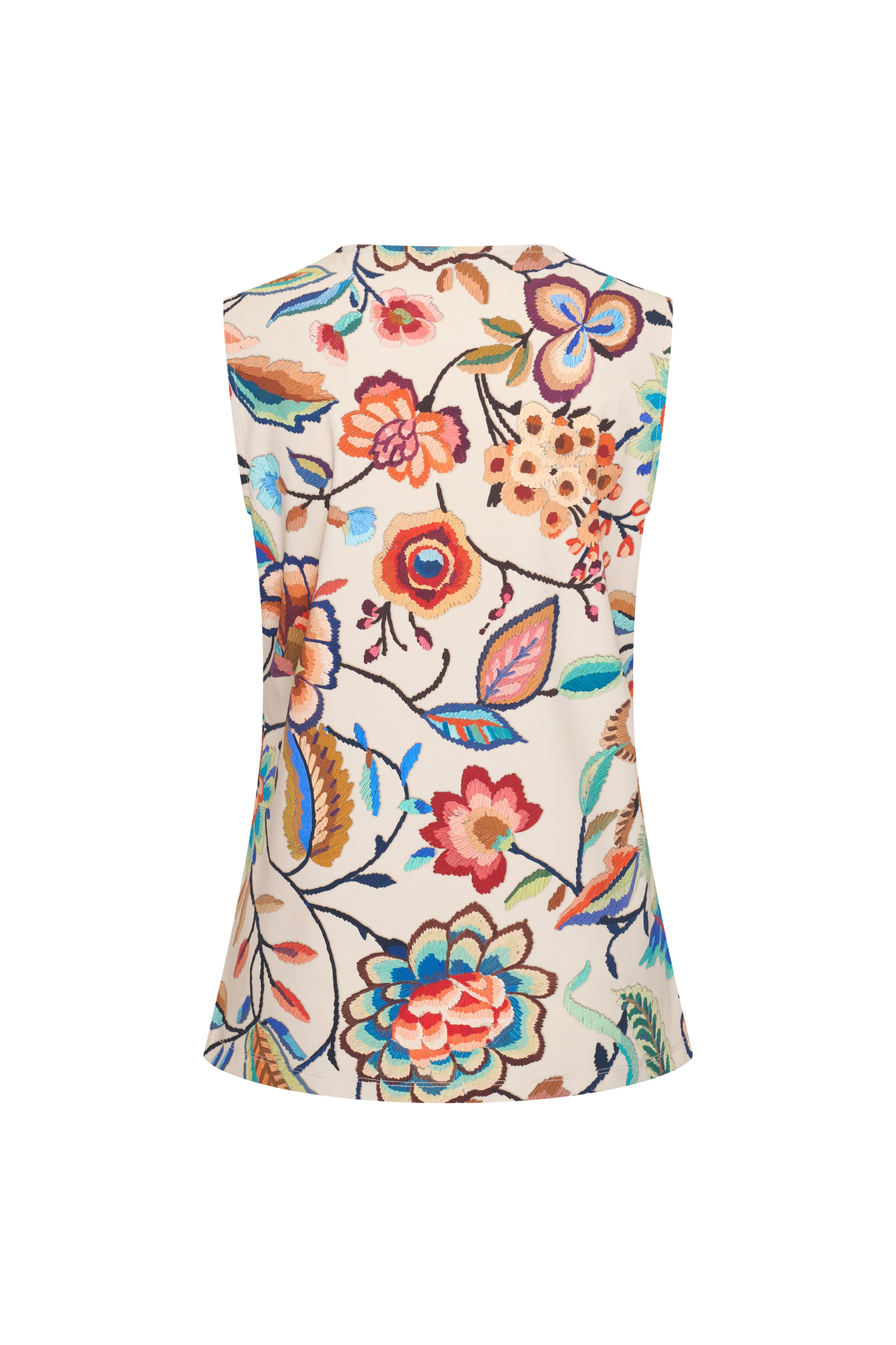 Travel Top Bloom Print Multicolour Embroidered van Mi Piace is een mouwloze top met V-hals en kleurrijke bloemenprint. De soepele travelstof en licht getailleerde pasvorm zorgen voor een comfortabele en vrouwelijke uitstraling.