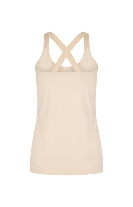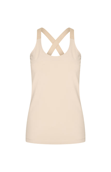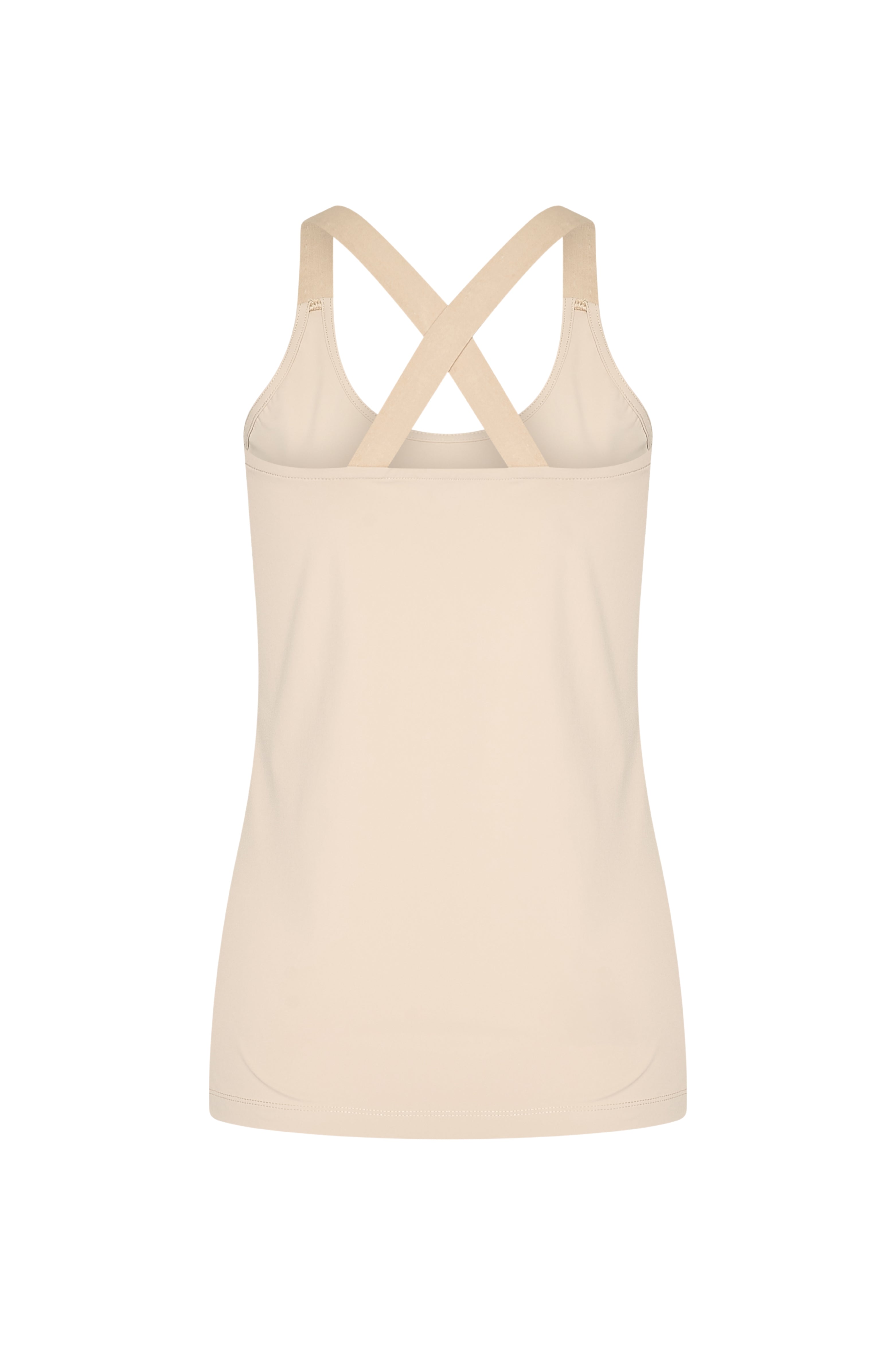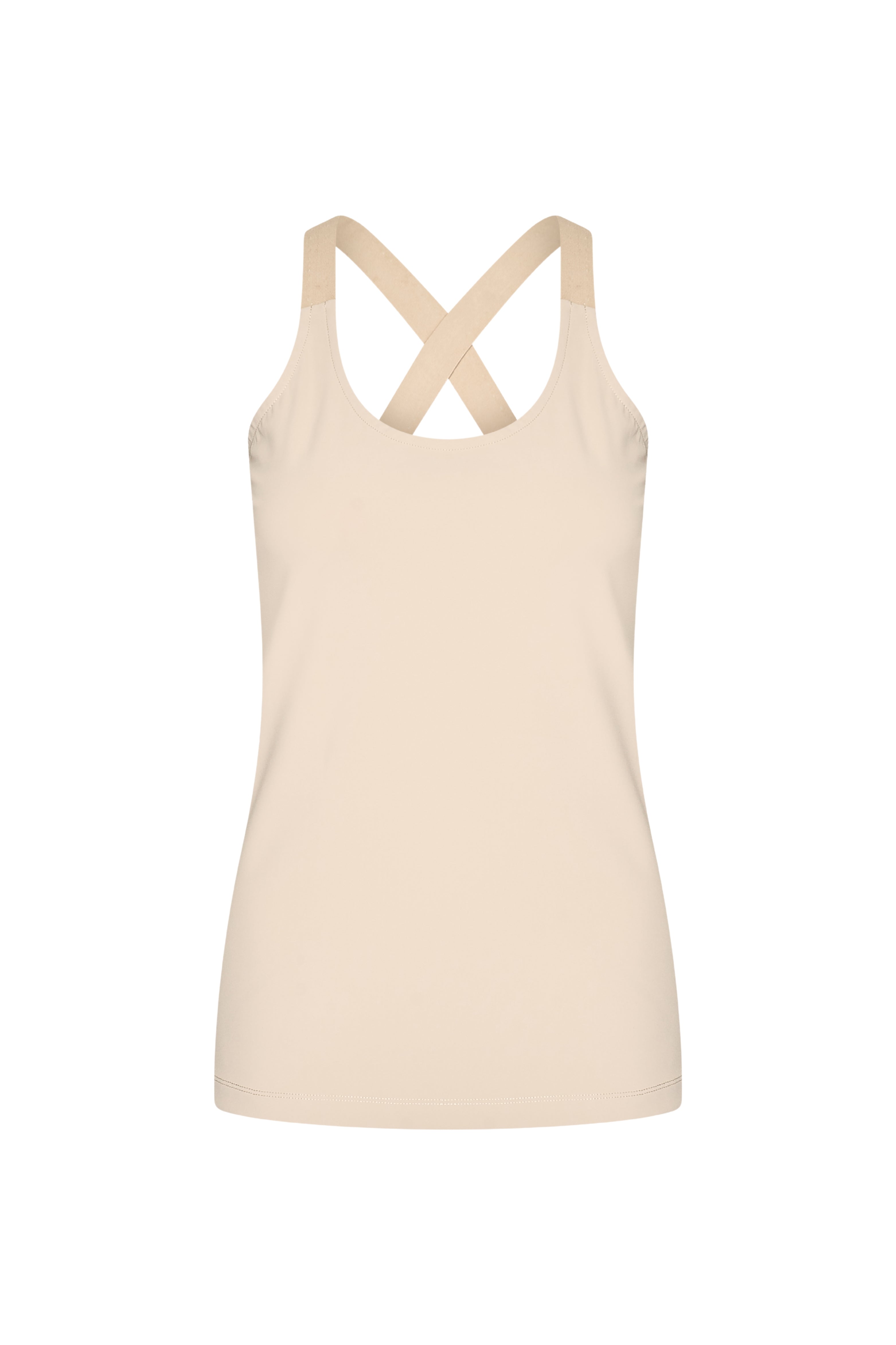 De Mi Piace Travel Top Cross Band Beige is een sportief en vrouwelijk item met gekruiste banden op de rug. Gemaakt van soepele travelkwaliteit die ademt en niet kreukt – perfect voor een stijlvolle en comfortabele look.