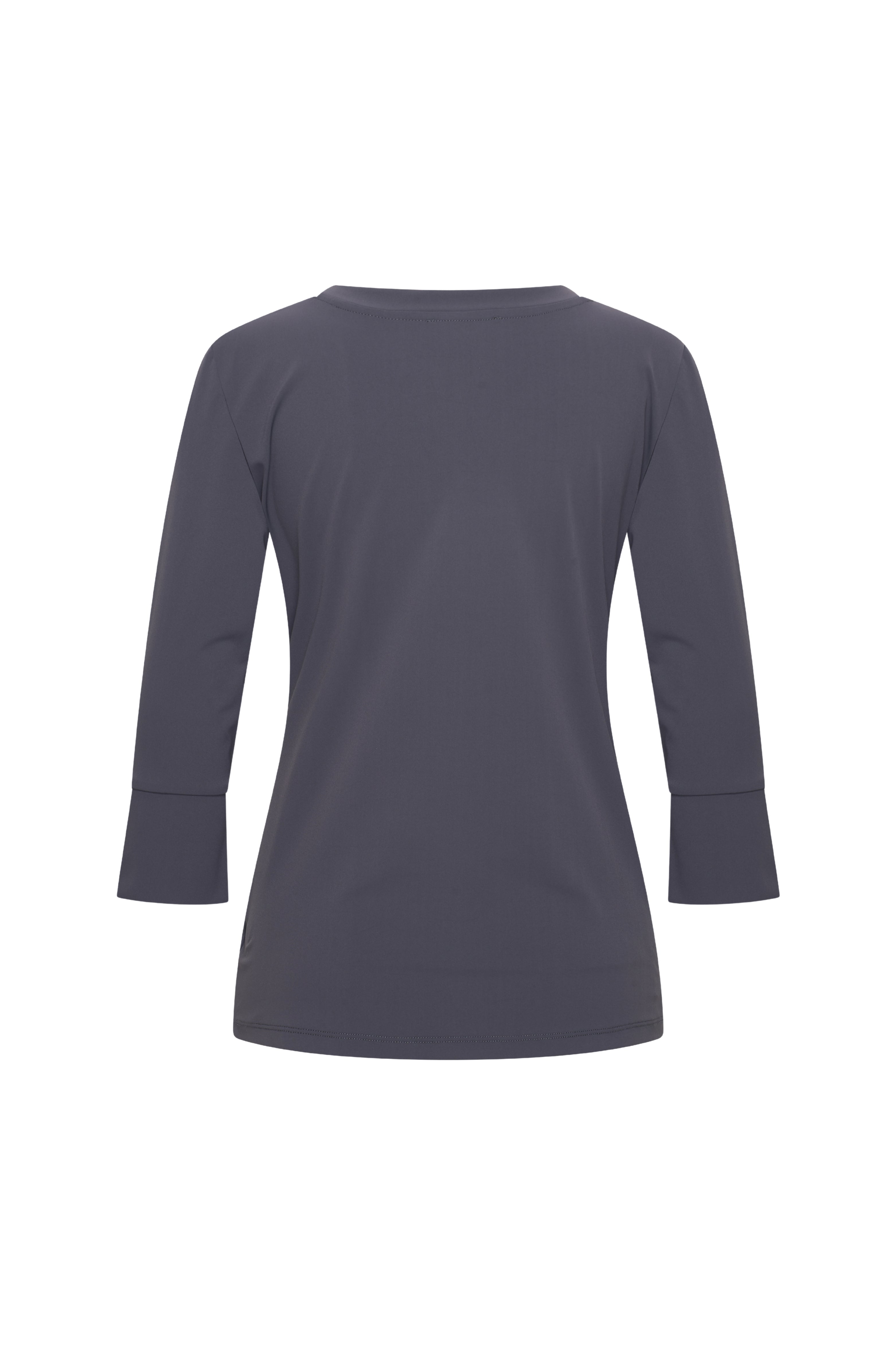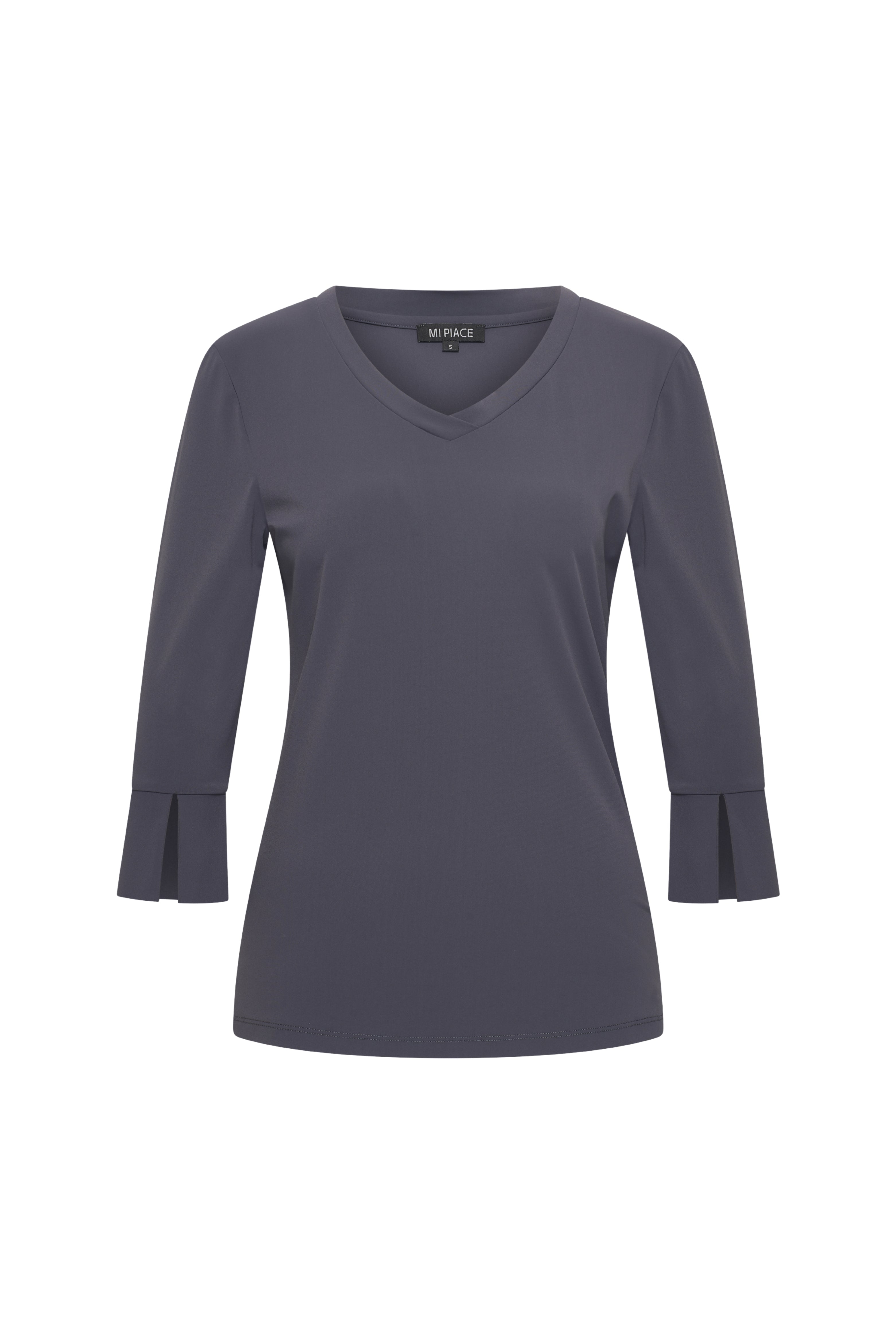 De Travel Top Dark Grey van Mi Piace is een stijlvolle basic met V-hals en 3/4-mouwen met split. Vervaardigd uit kreukvrije, ademende travelstof. Ideaal om chic of casual te dragen en eindeloos te combineren.