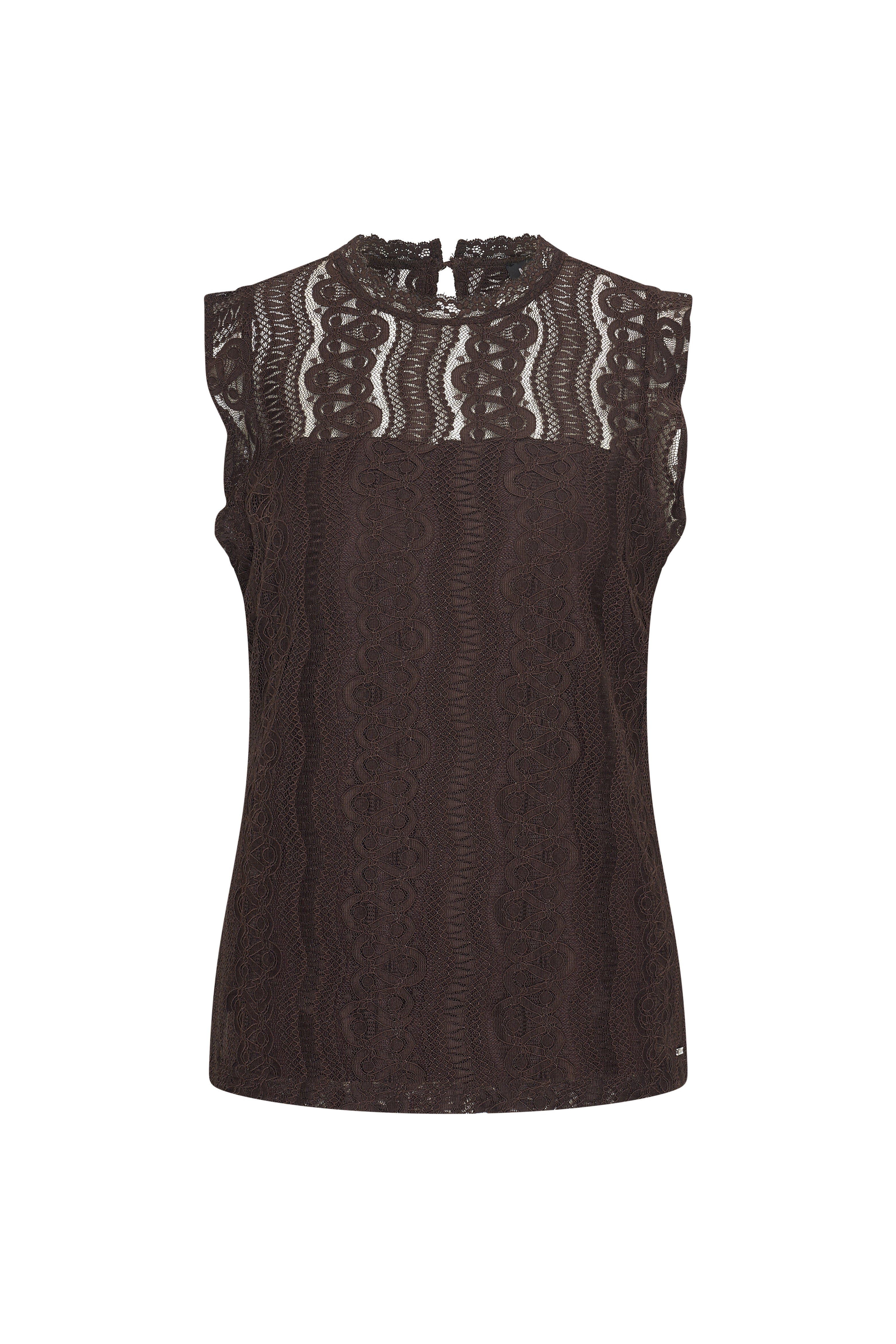 De Travel Top Kant Espresso van Mi Piace is een elegante traveltop met ronde hals en mouwloos design. Fijne kant en kreukarme stretch. Ideaal voor feestjes en stijlvolle layering.