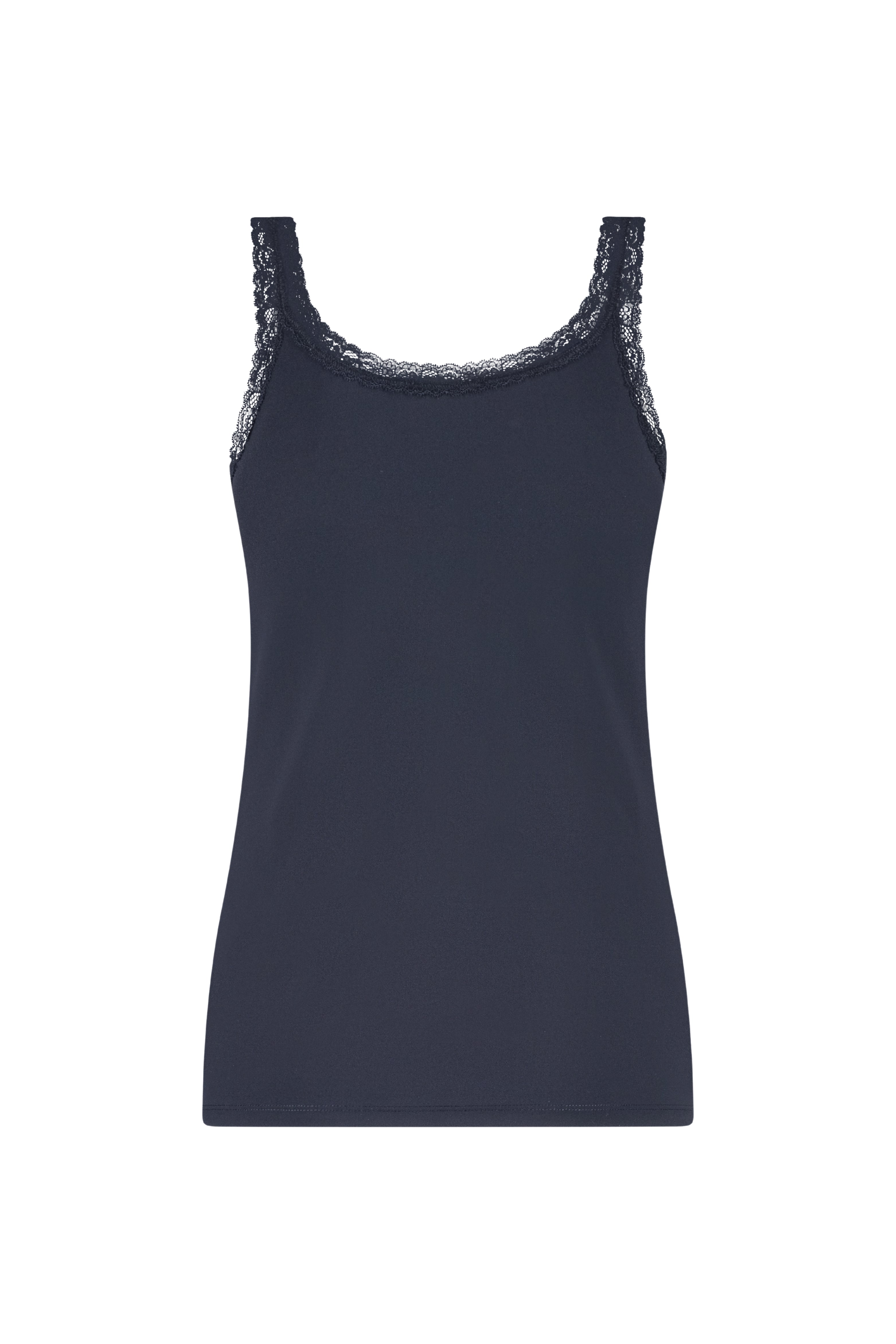 De Travel Top Lacy Blue van Lady Day is een stijlvolle top met ronde hals. De fijne kanten rand langs hals en bandjes geeft een zachte, chique uitstraling en het heeft een comfortabele stretch. Perfect voor kantoor of diner.