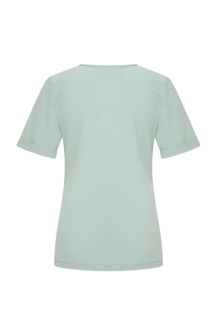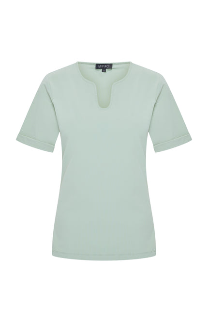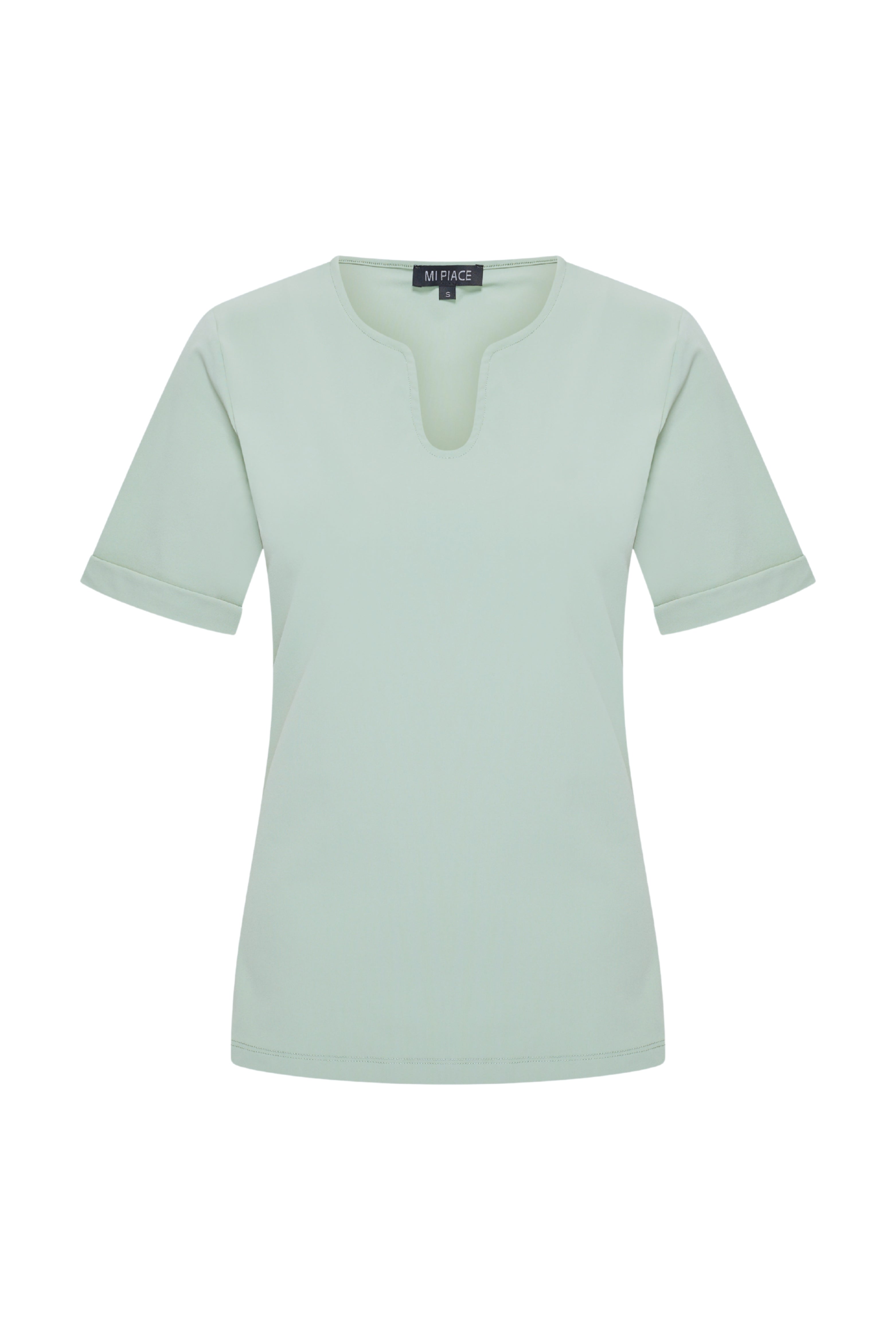 De Travel Top Lilypad van Mi Piace is jouw nieuwe favoriet! Gemaakt van comfortabele travelstof, met een sierlijke split bij de hals en opgerolde mouwen.
