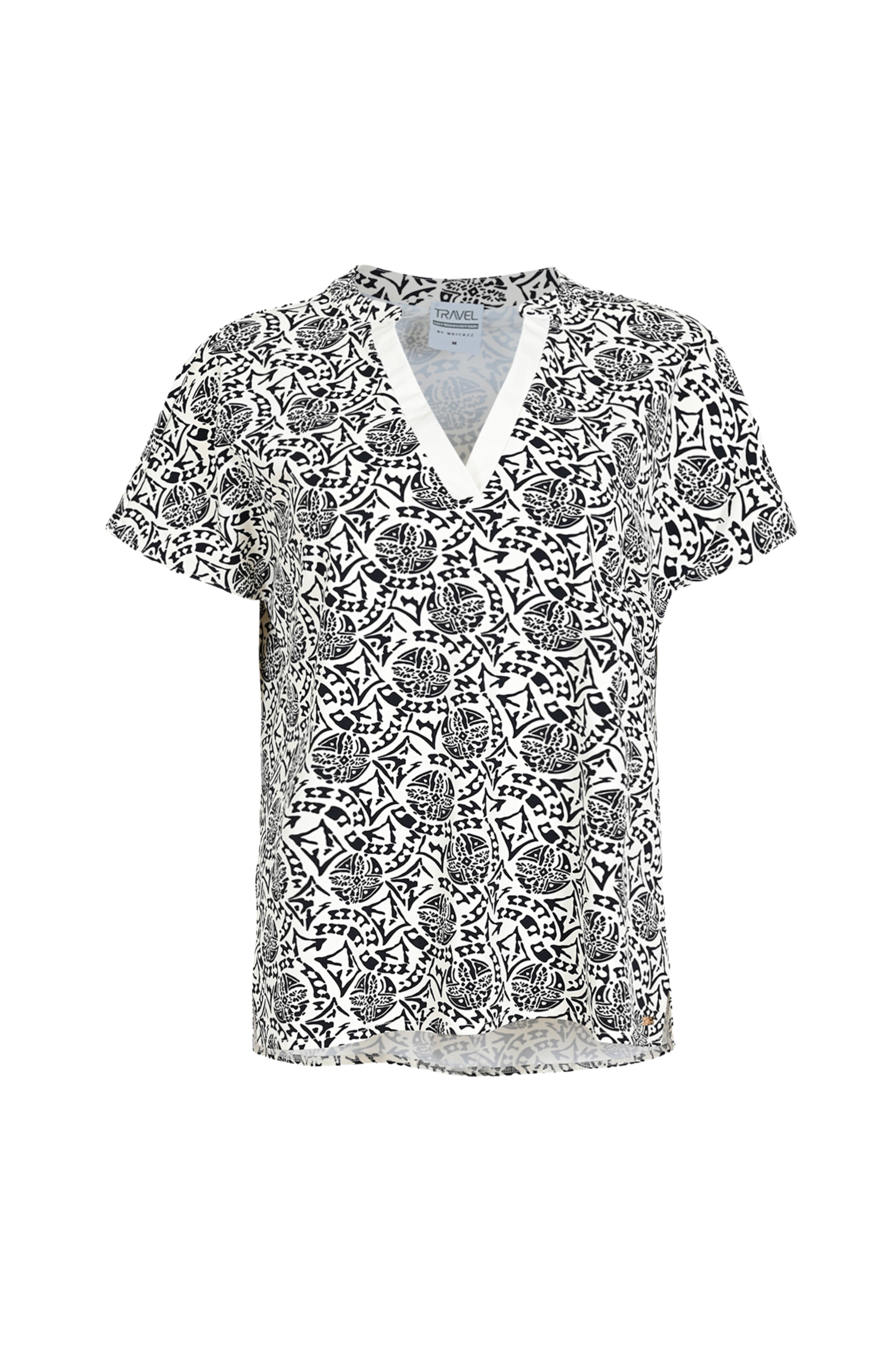 De Travel Top Losina Fan van Maicazz valt op door haar grafische zwart-witte print en diepe V-hals met uni bies. Een luchtige, comfortabele top van travelstof die moeiteloos combineert en perfect is voor elke dag.