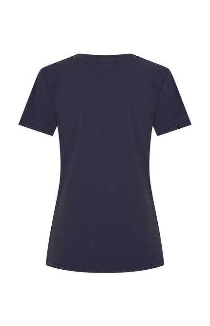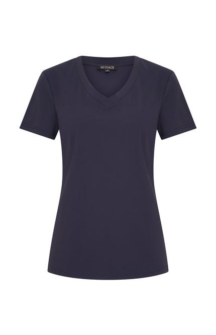 De Travel Top Navy van Mi Piace is een stijlvolle en veelzijdige basic. De comfortabele travelstof met stretch zorgt voor een perfecte pasvorm. De V-hals maakt de top vrouwelijk en elegant voor elke gelegenheid.