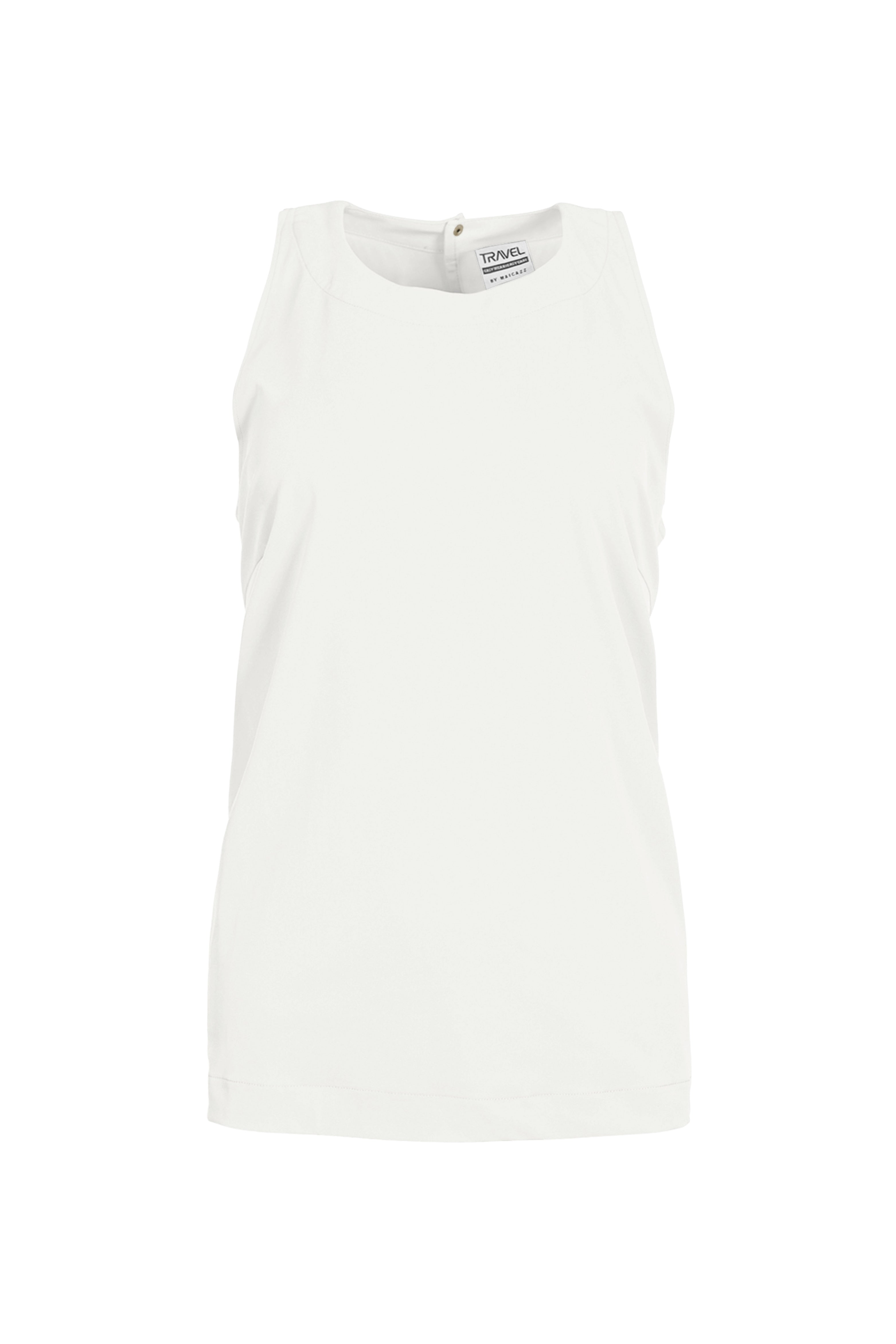 De Travel Top Paulie Offwhite van Maicazz is een minimalistische haltertop met ronde halslijn en knoopsluiting in de nek. Gemaakt van zachte, elastische travelstof voor een frisse en elegante look op warme dagen.