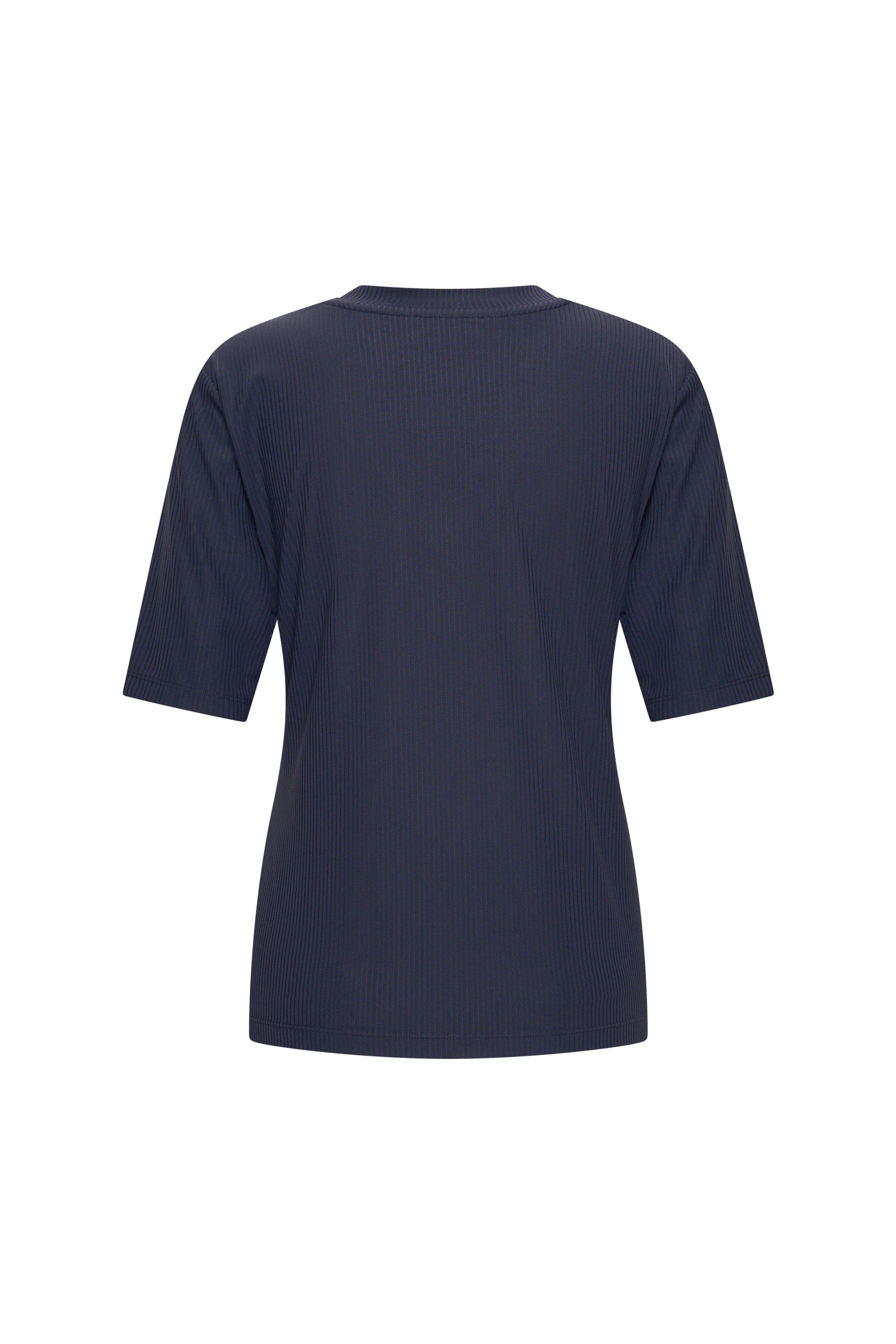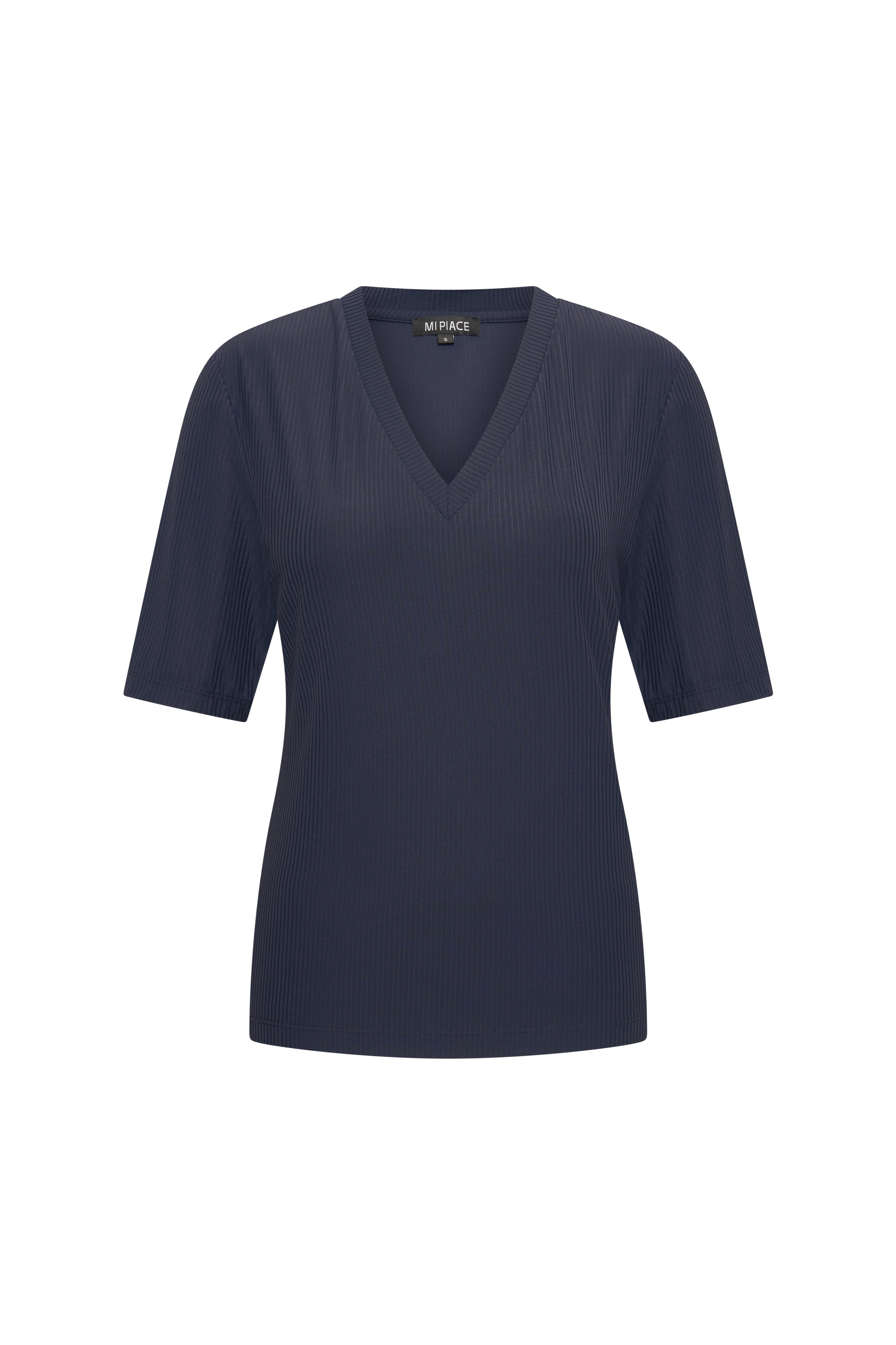 Deze navy uitvoering van de Travel Top Collar Ribbed van Mi Piace is een veelzijdige basic met een V-hals. De elastische ribstof en opstaande kraag geven de top een verzorgde look die je zowel los als onder een jasje kunt dragen.