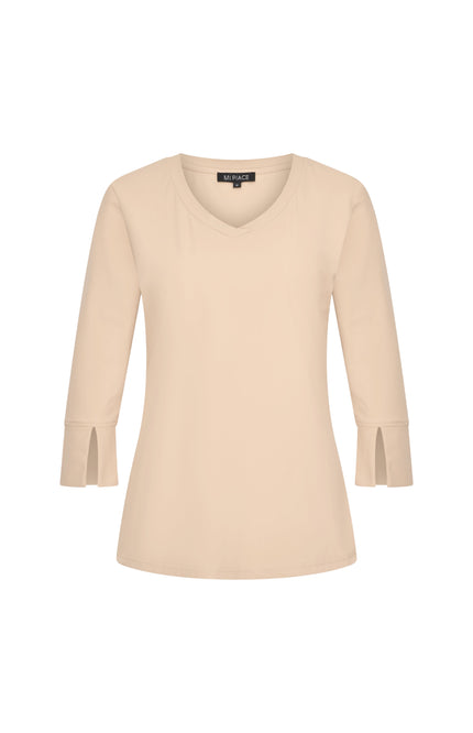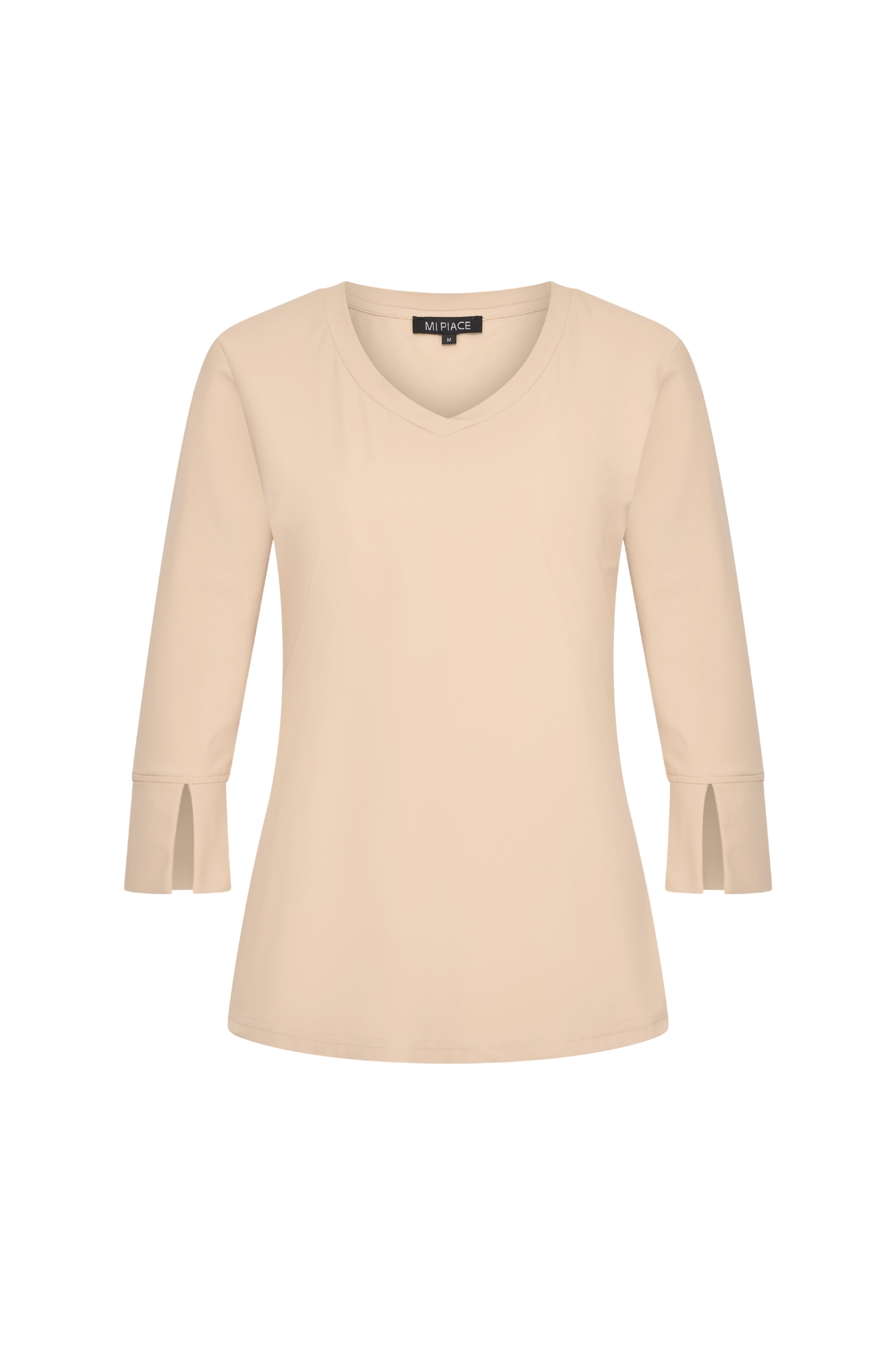 Deze top van Mi Piace is gemaakt van zachte travelstof en is ontworpen om zowel stijlvol als comfortabel te zijn. De top heeft een flatterende V-hals die je vrouwelijke vormen benadrukt, terwijl de zandkleurige tint perfect past bij elke outfit.