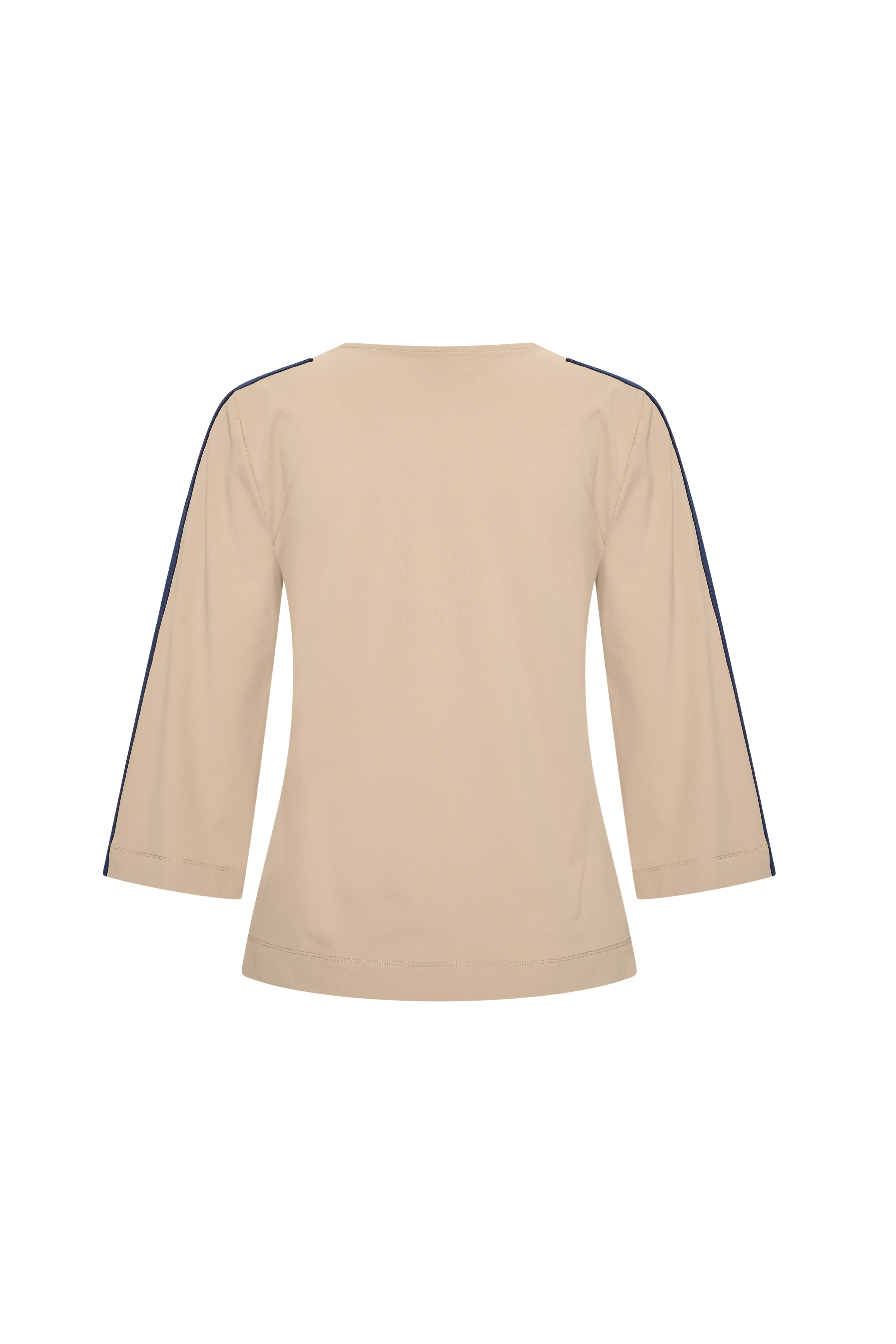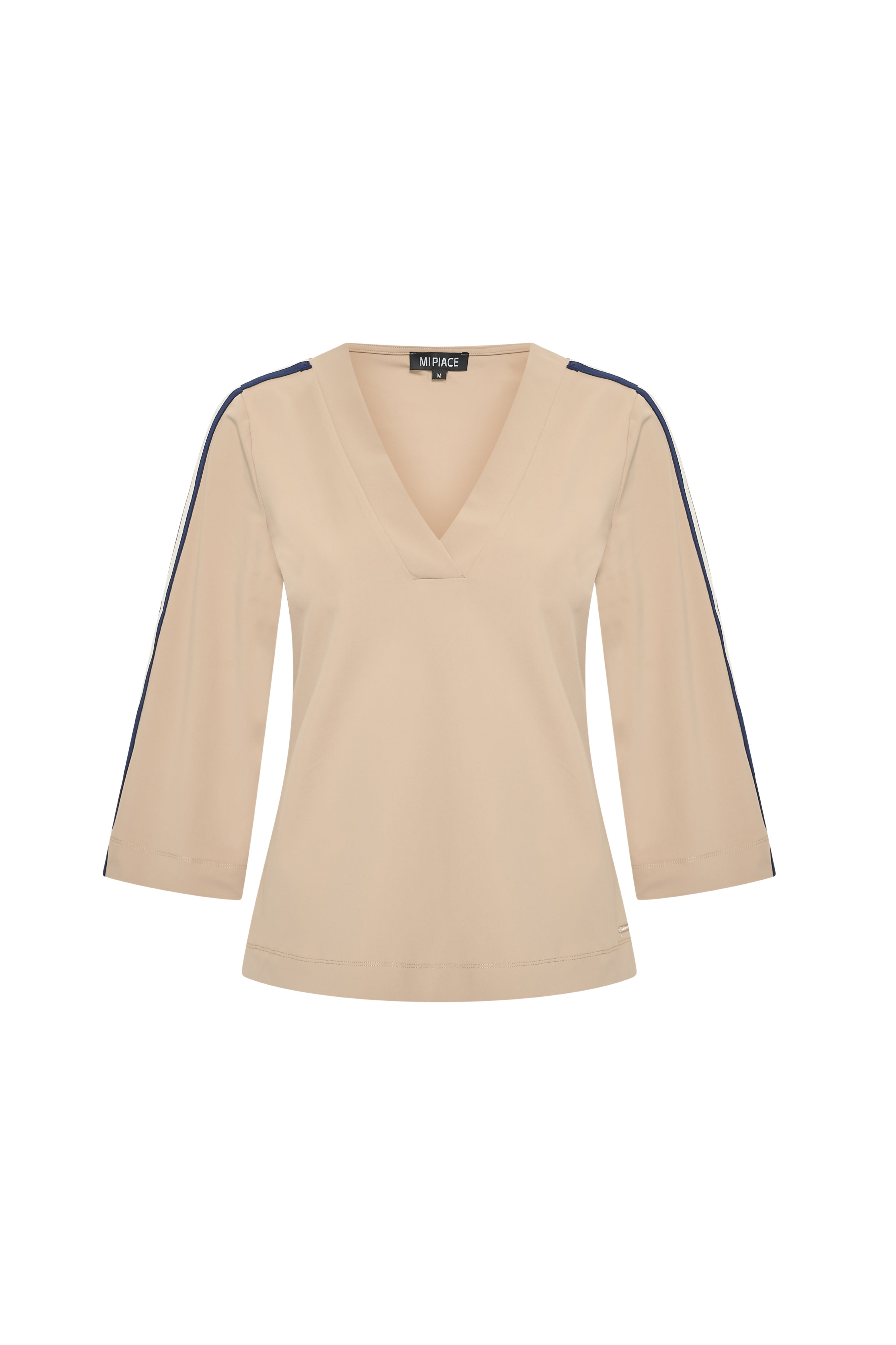 De Travel Top Tape in de kleur Latte van Mi Piace straalt zachte elegantie uit. De comfortabele stretchstof, contrasterende tape en subtiele V-hals maken deze top perfect voor elke gelegenheid.