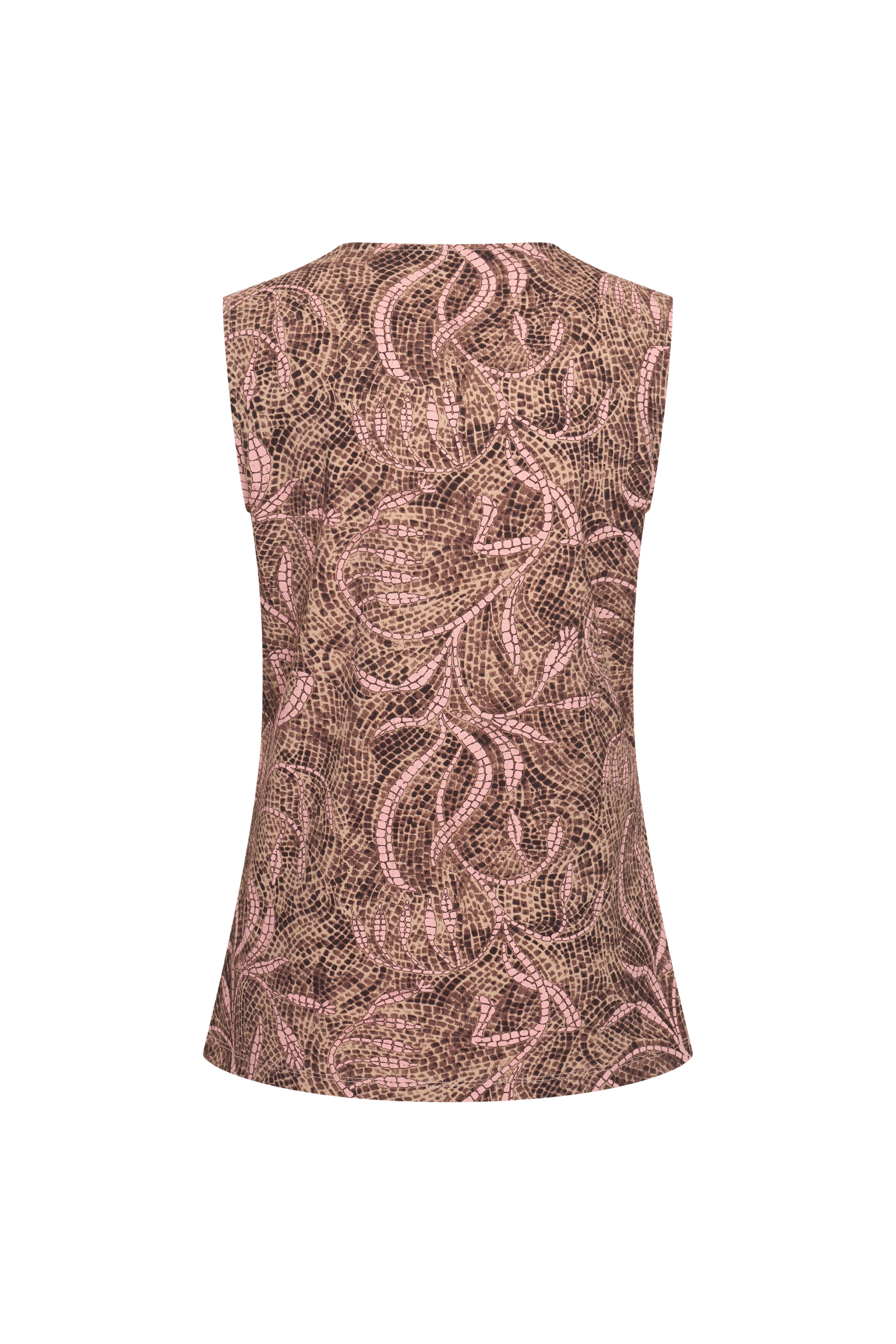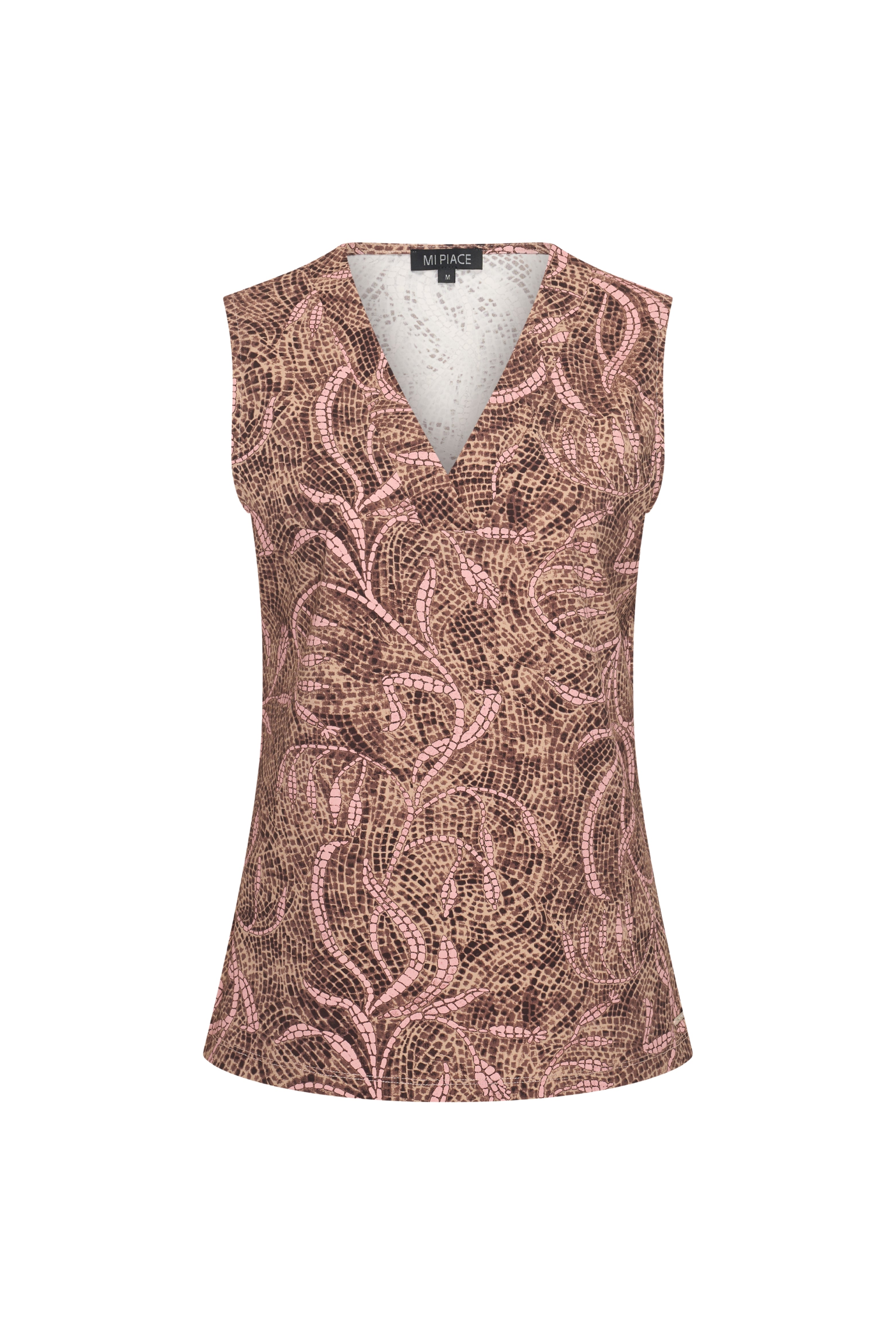 De Travel Top Twilight Twigs Print Espresso van Mi Piace is een mouwloze top van comfortabele travelstof met V-hals en all-over print. Licht, stretchy en kreukarm, ideaal voor werk, reizen en casual chic looks.
