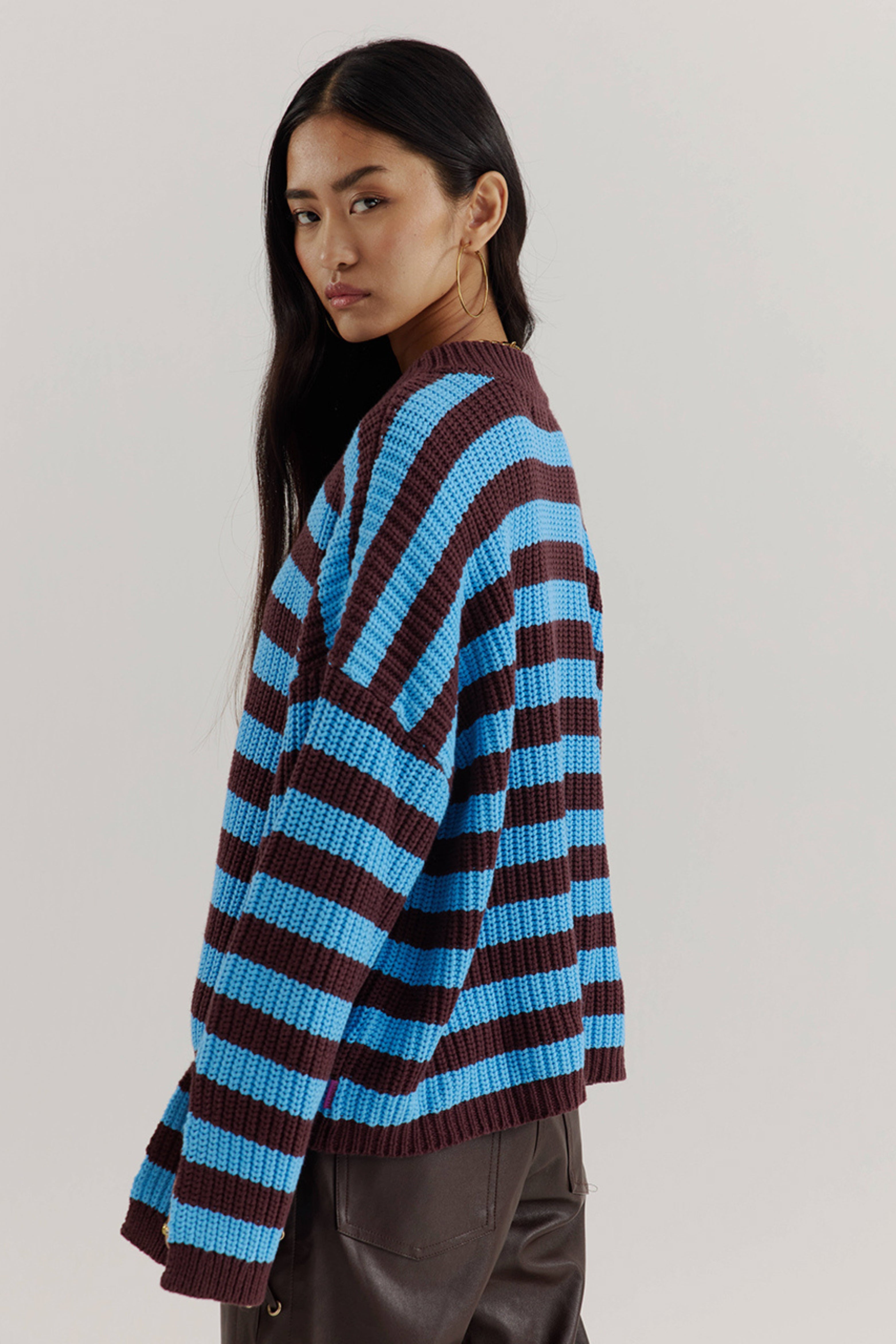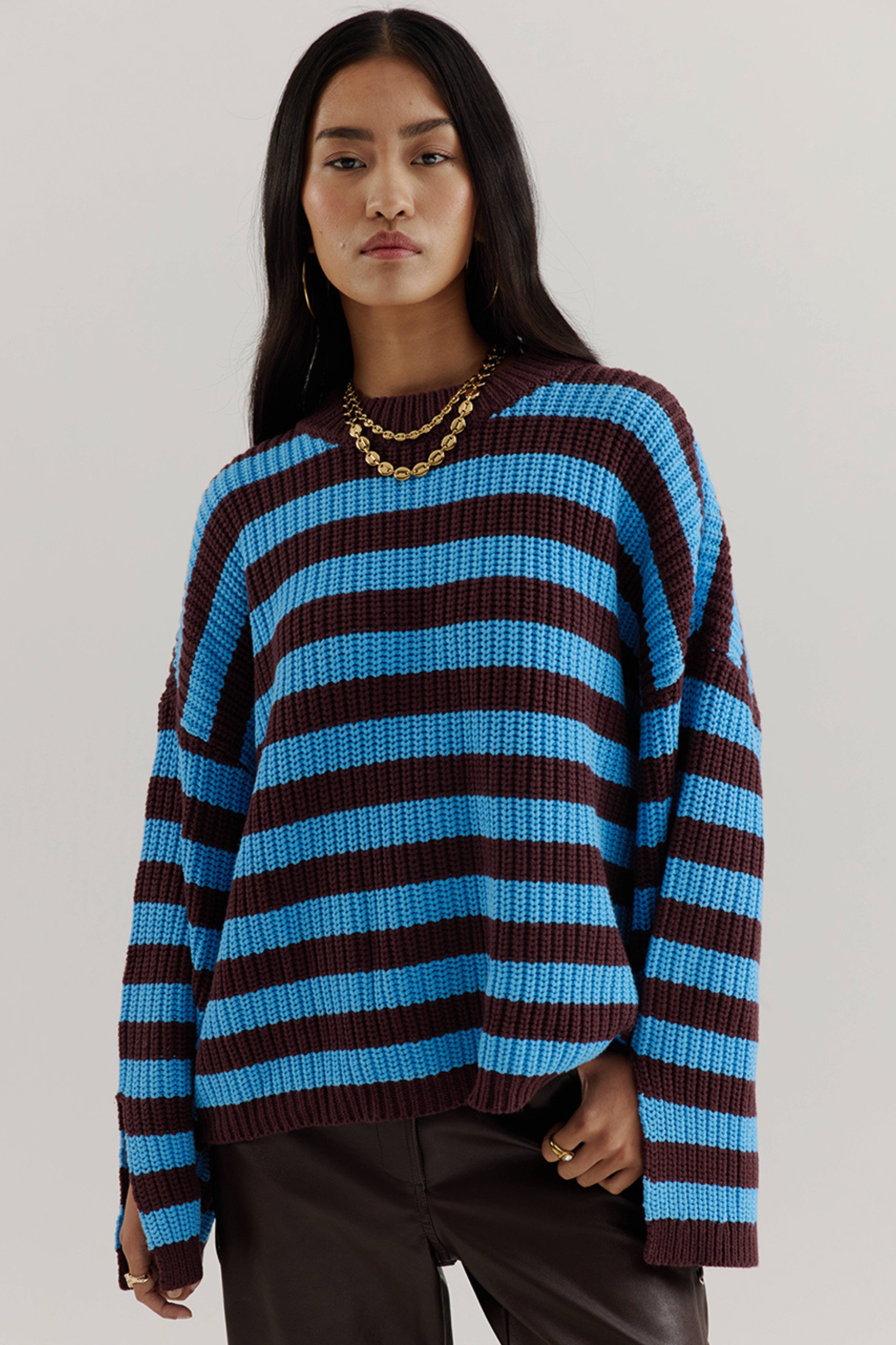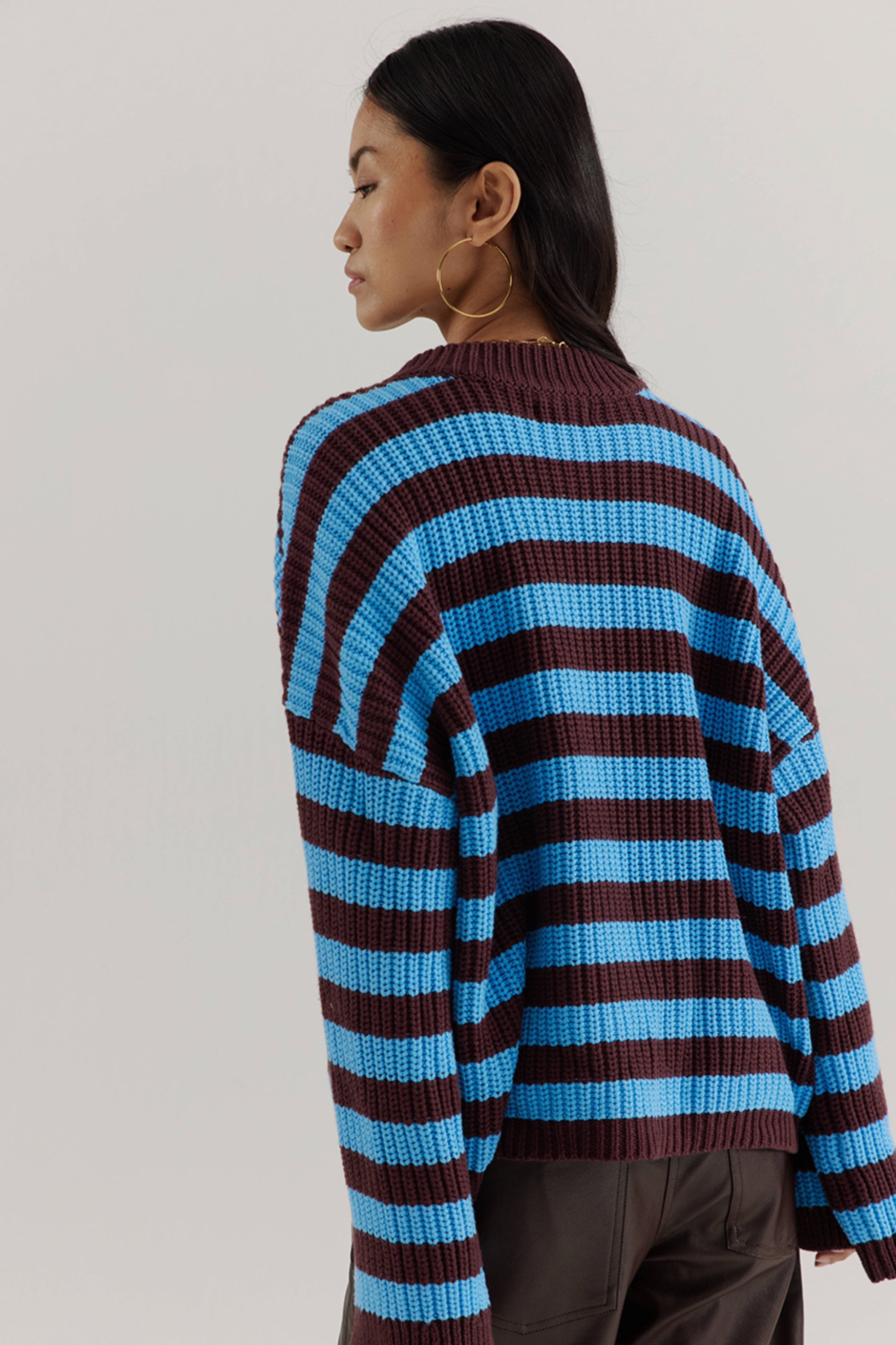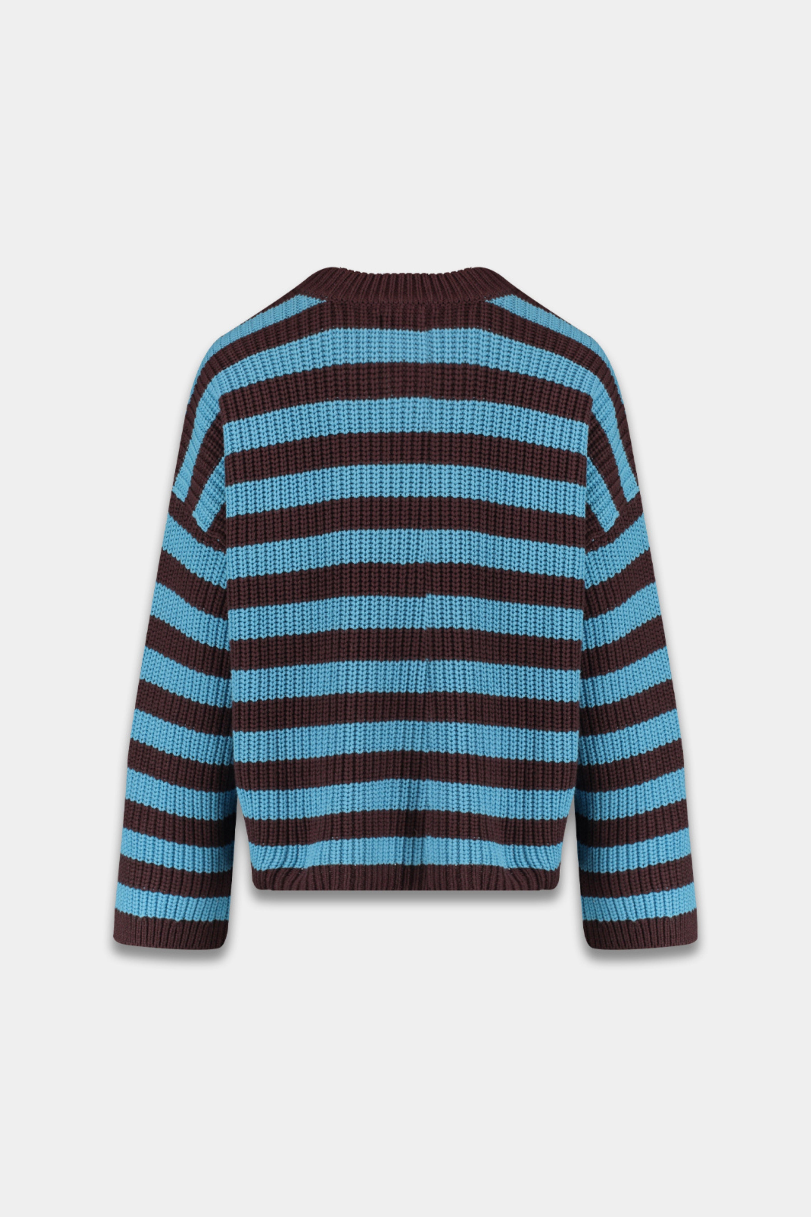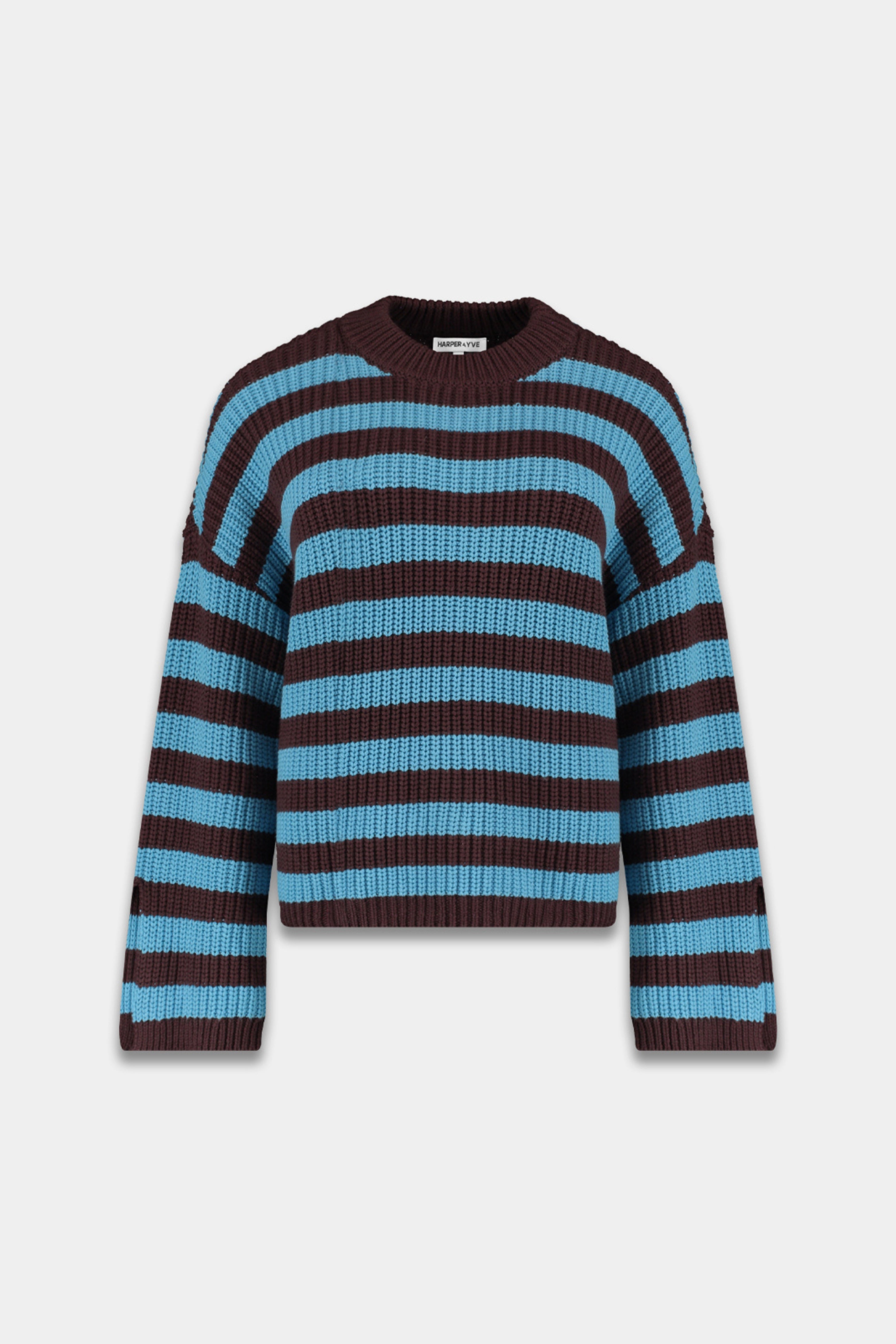 Trui Alice Azure Blue van Harper & Yve is een grofgebreide knit met blauwe en bruine strepen voor een frisse, eigentijdse look. De relaxed fit en licht cropped lengte maken hem ideaal met een hoge taille broek of rok.