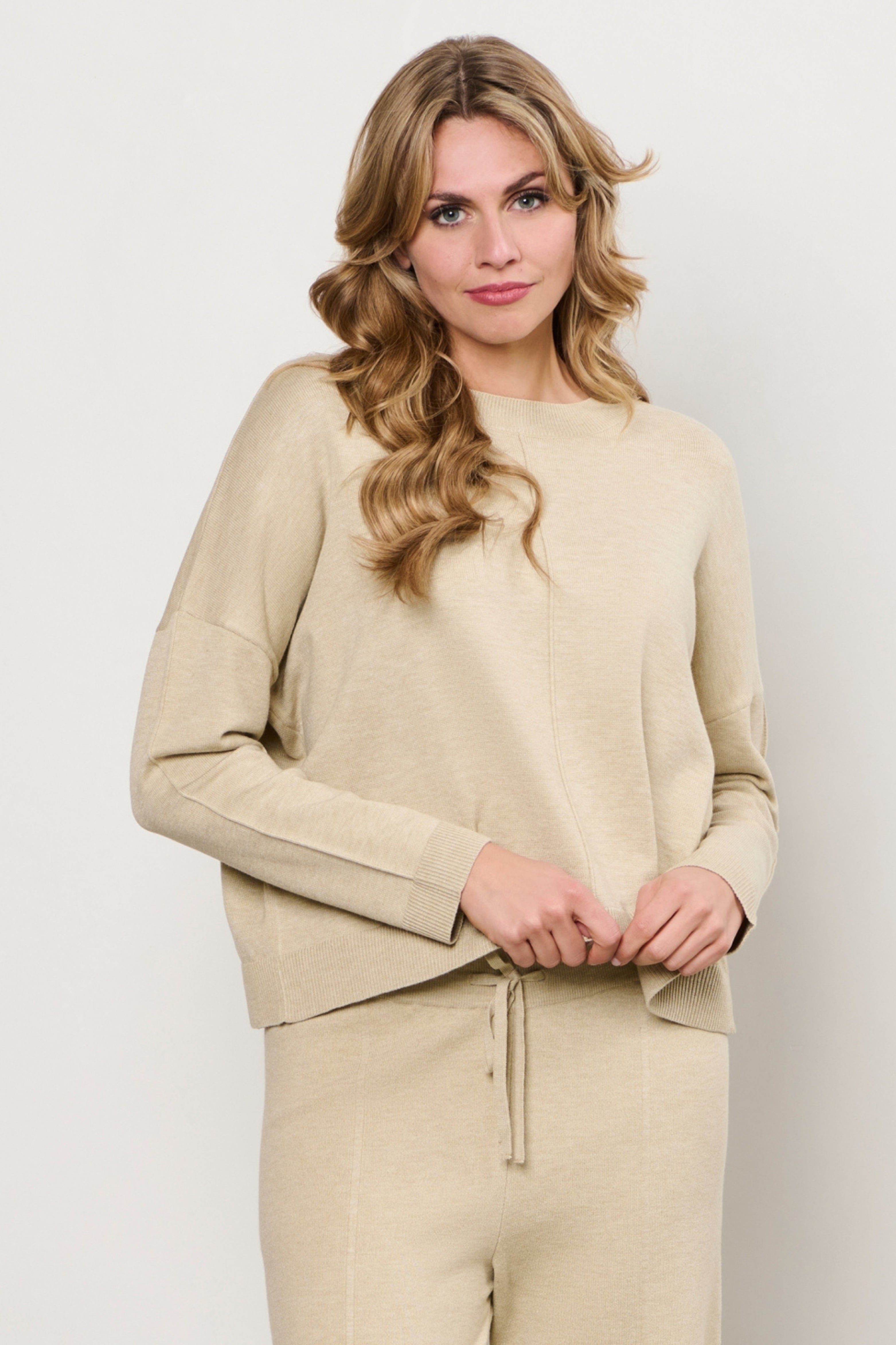 Trui Basile Sand van &Co Woman is een comfortabele, fijngebreide trui in een neutrale tint met een ontspannen pasvorm en verlaagde schoudernaden. Ideaal voor een casual, maar verzorgde look. Mooi te combineren als co-ord set met de bijpassende broek.