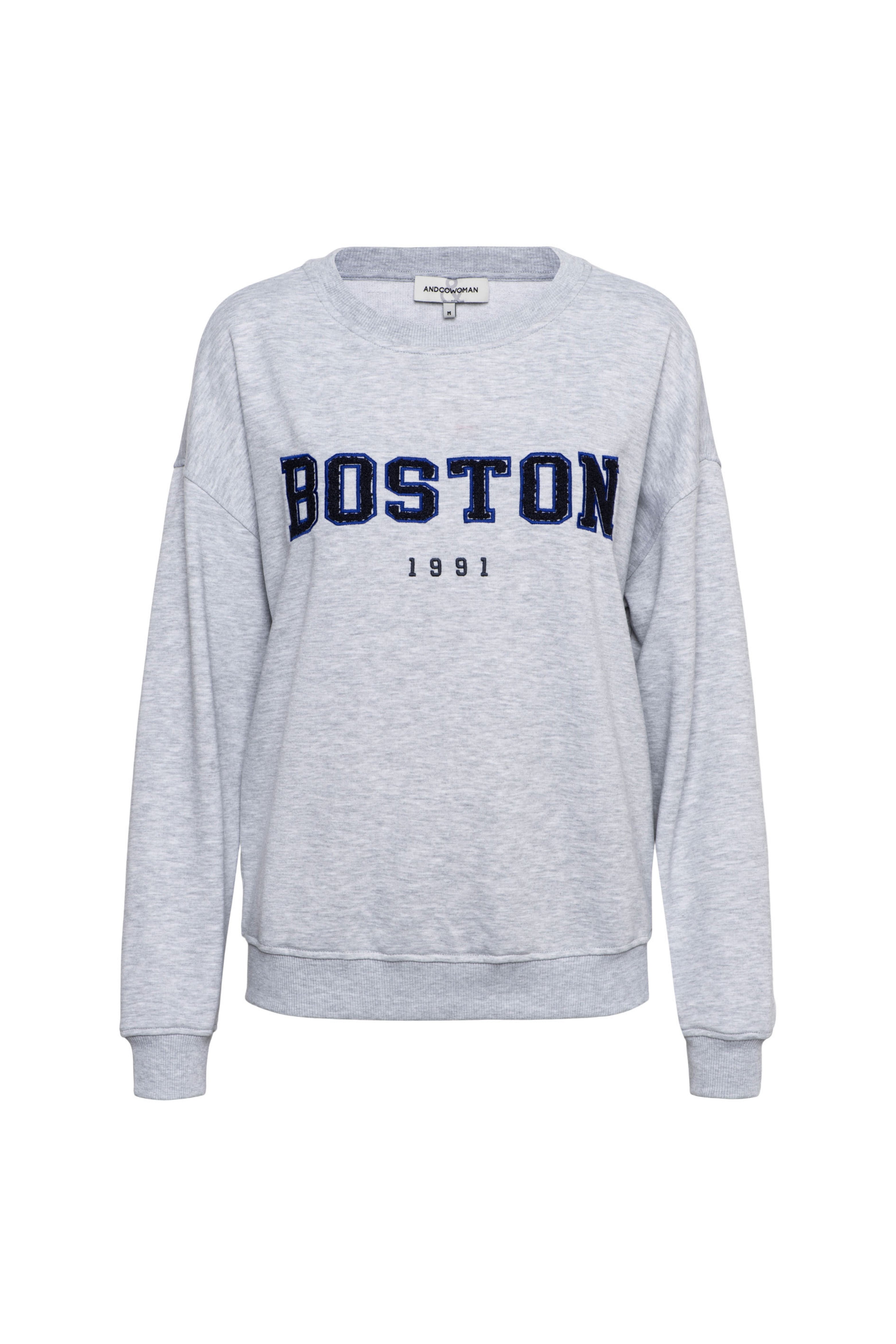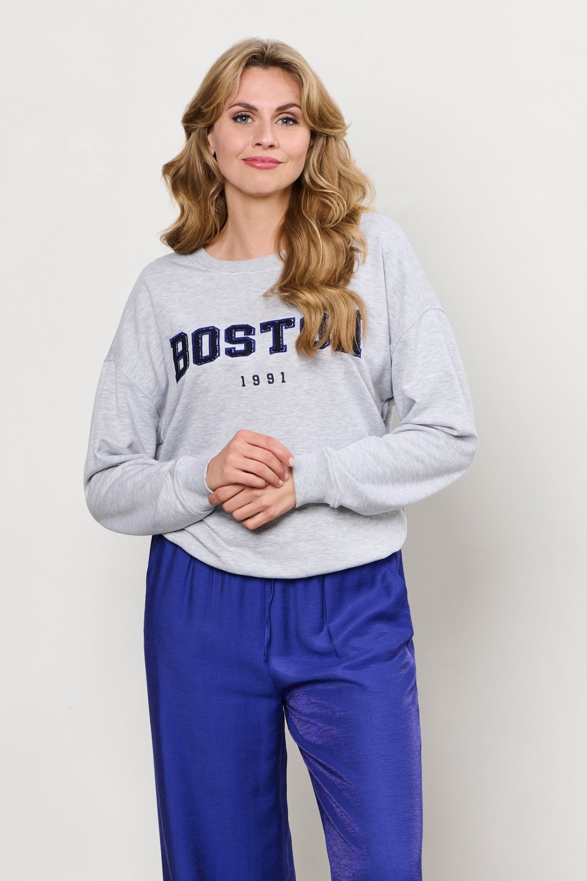Trui Boston Grey Melange van &Co woman is een sportieve sweater met een opvallende ‘Boston 1991’ print op de borst. De grijze melangekleur en rechte pasvorm zorgen voor een casual look die perfect combineert met jeans of een jogger.