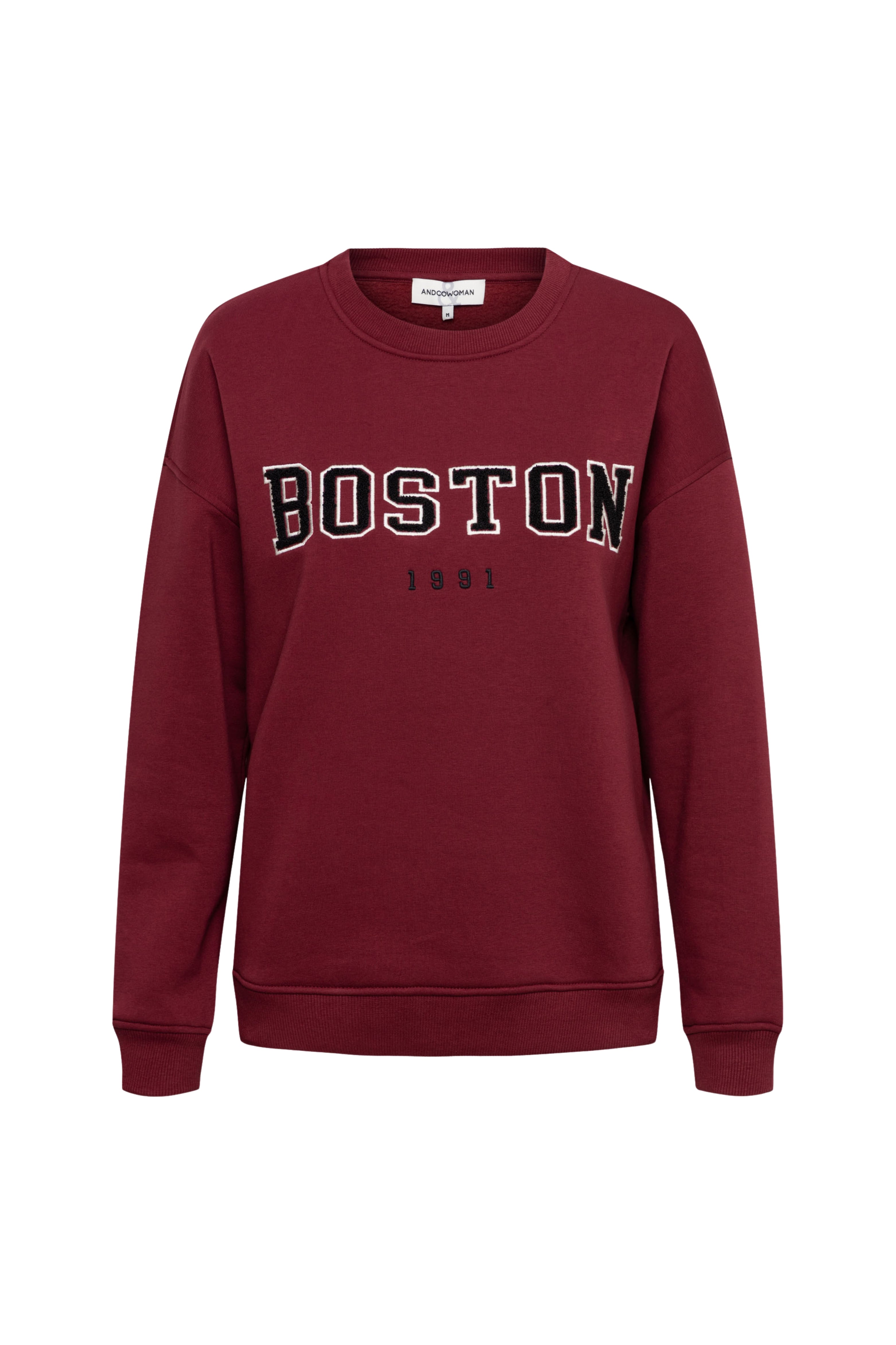 Trui Boston Wine Red van &Co Woman is een sportieve sweater met een casual uitstraling in een diepe wijnrode kleur. De ‘Boston 1991’ opdruk in contrasterende letters geeft de trui een trendy en stoere touch.