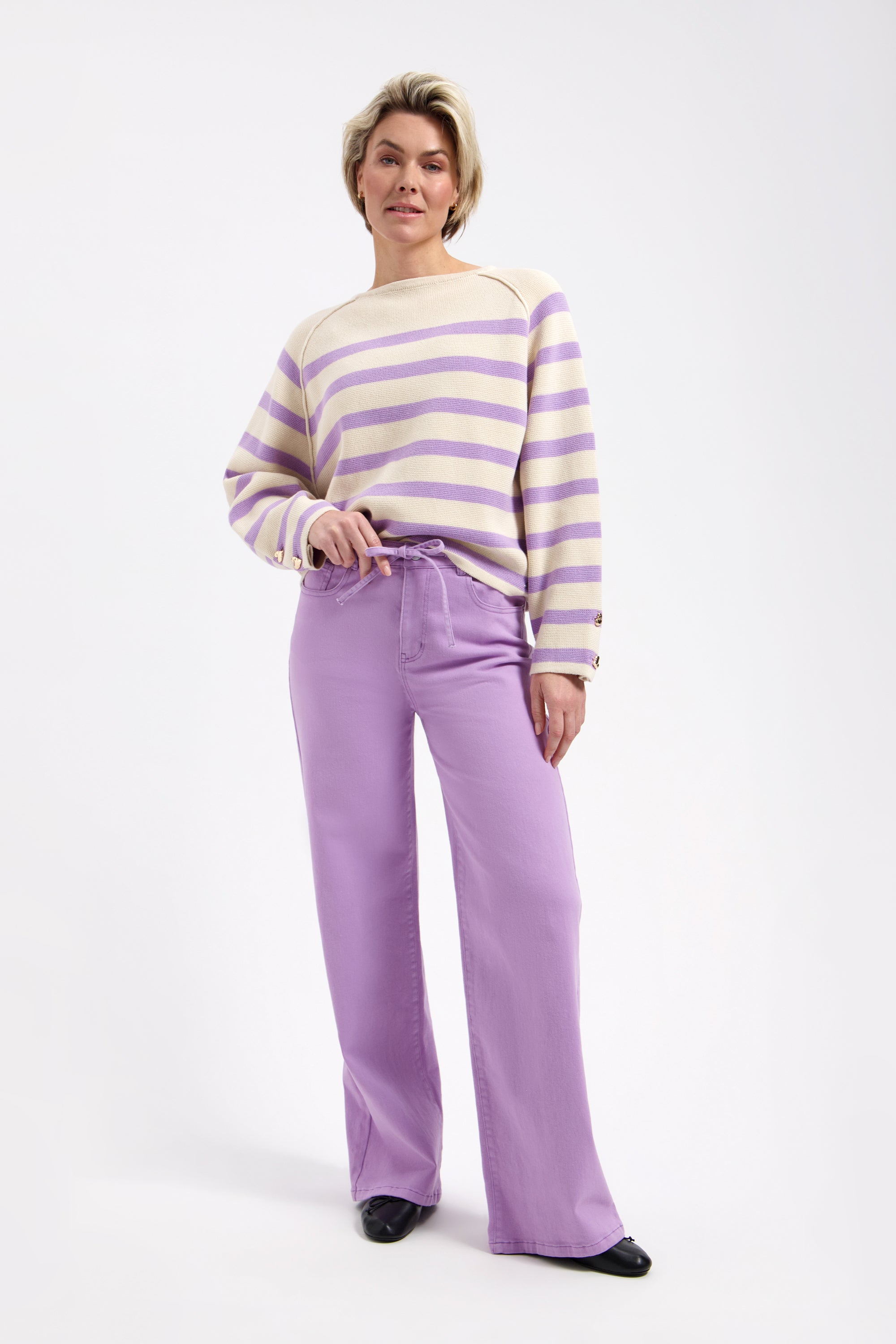 De Trui Breton Cream Violet van Lady Day is een frisse sweater met hoge ronde hals. Zacht breisel met Bretonse strepen en geribde boorden. Perfect voor casual dagen en het weekend.