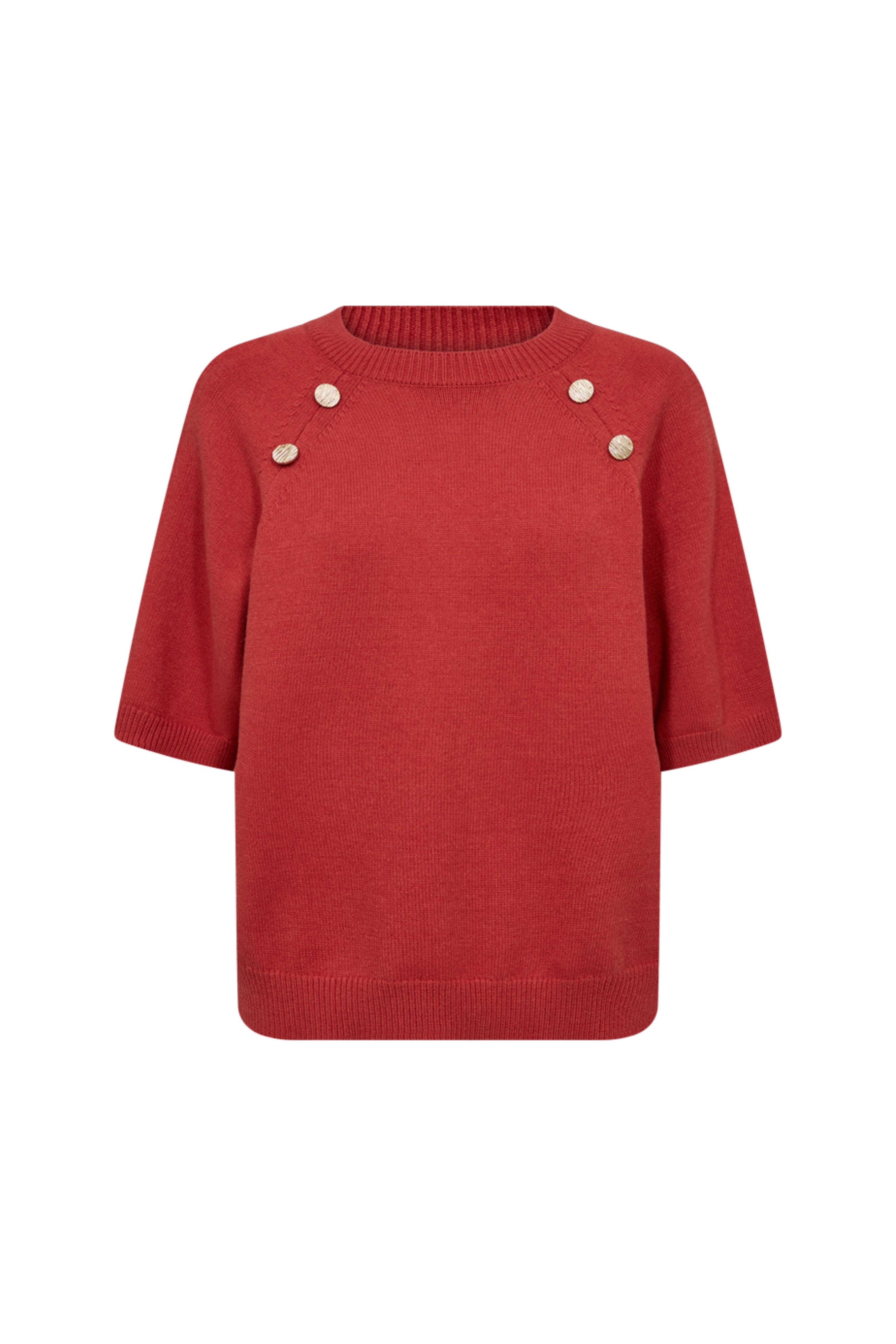 Verrijk je garderobe met deze Fqalpi trui in de warme kleur Baked Apple. De korte mouwen en gouden knopen op de schouders geven een speelse, vrouwelijke look. Comfort en stijl in รฉรฉn, perfect voor elk seizoen.