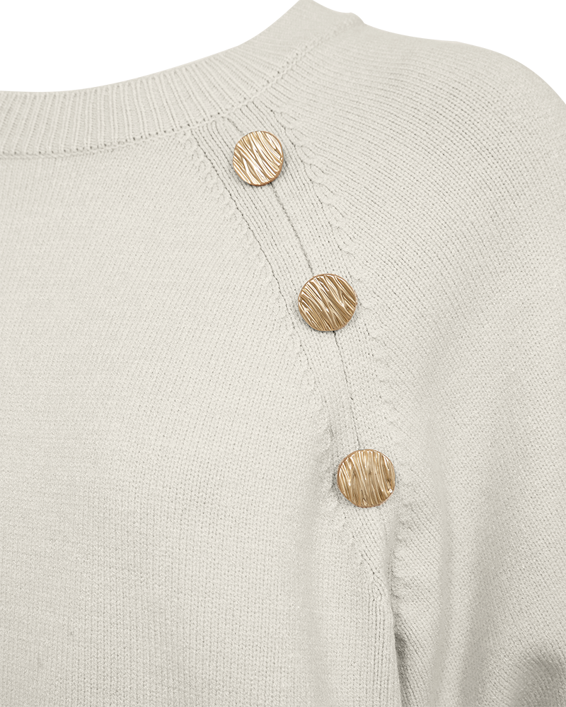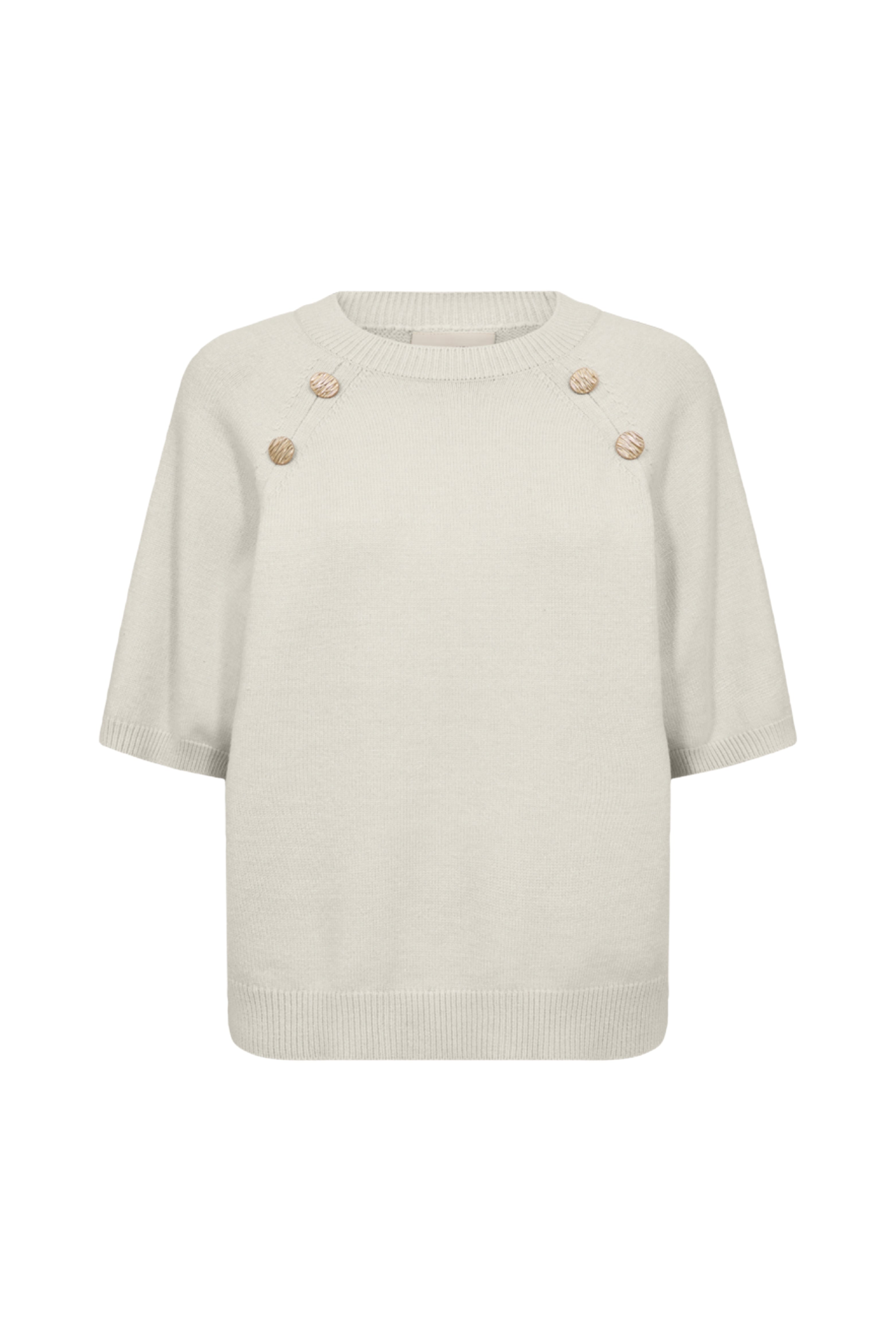 Deze zachte Fqalpi trui in de kleur Moonbeam geeft je outfit een verfijnde touch. De korte mouwen en sierknopen op de schouders zorgen voor een elegante look. Perfect voor een comfortabele, vrouwelijke stijl.