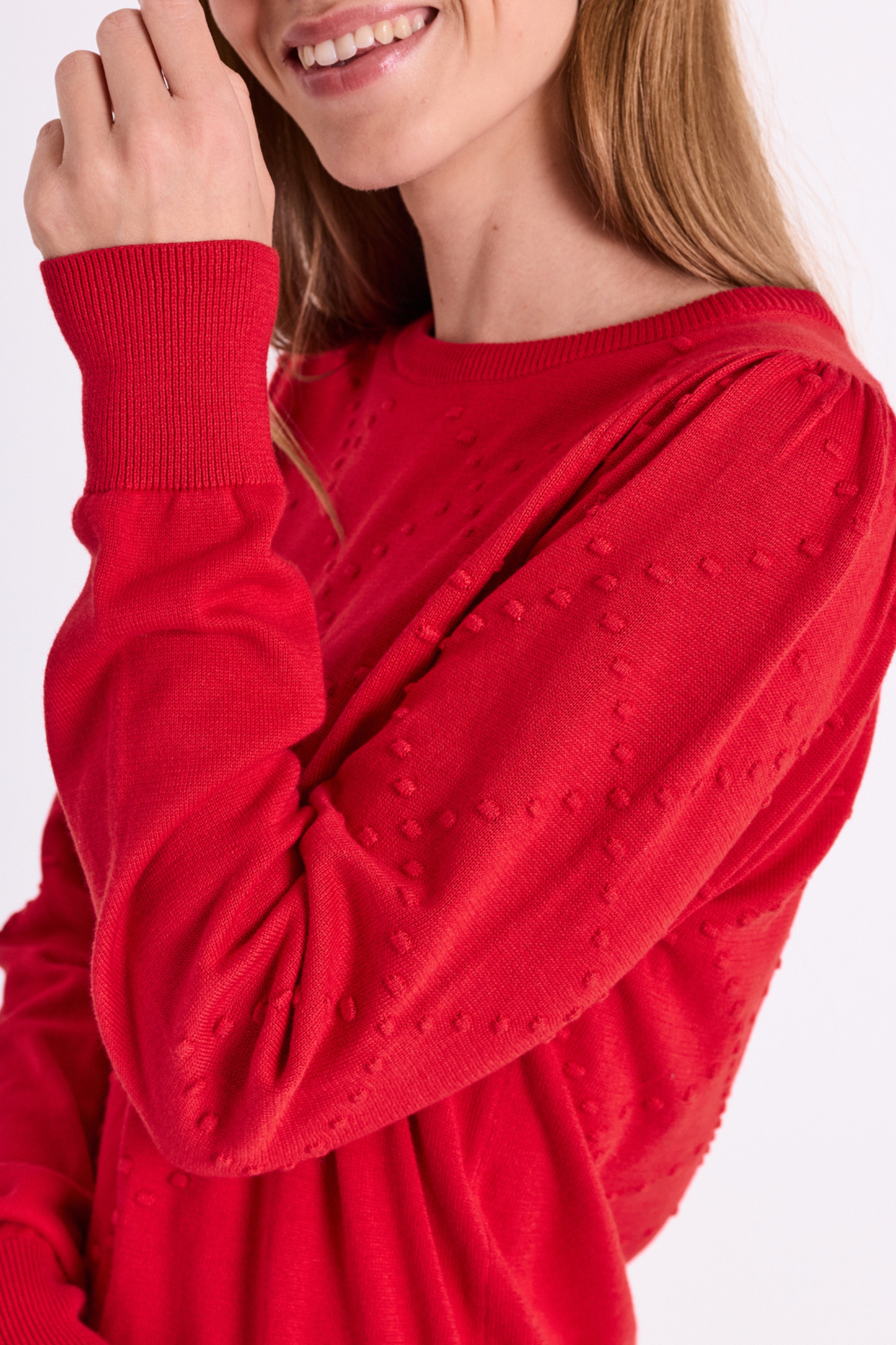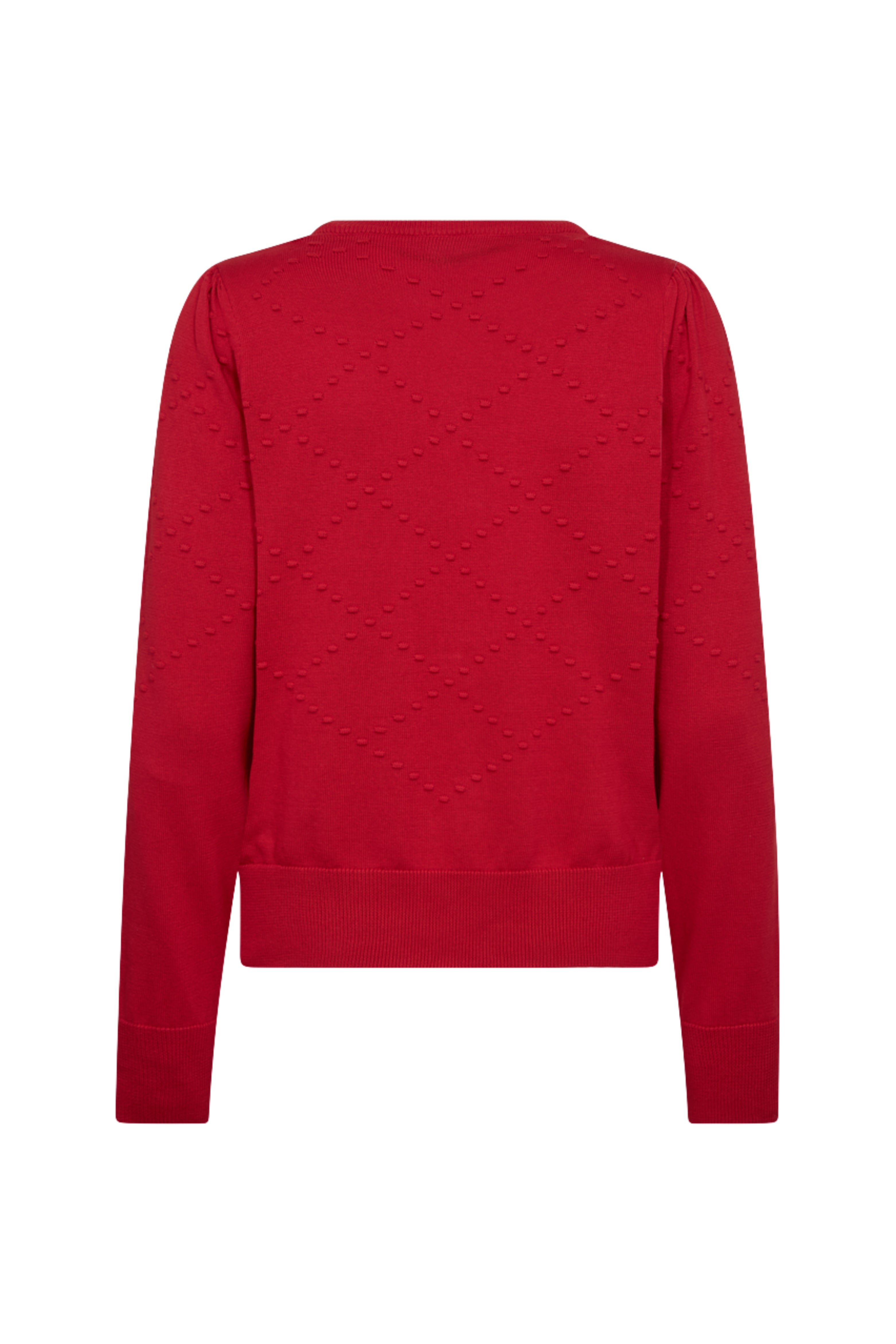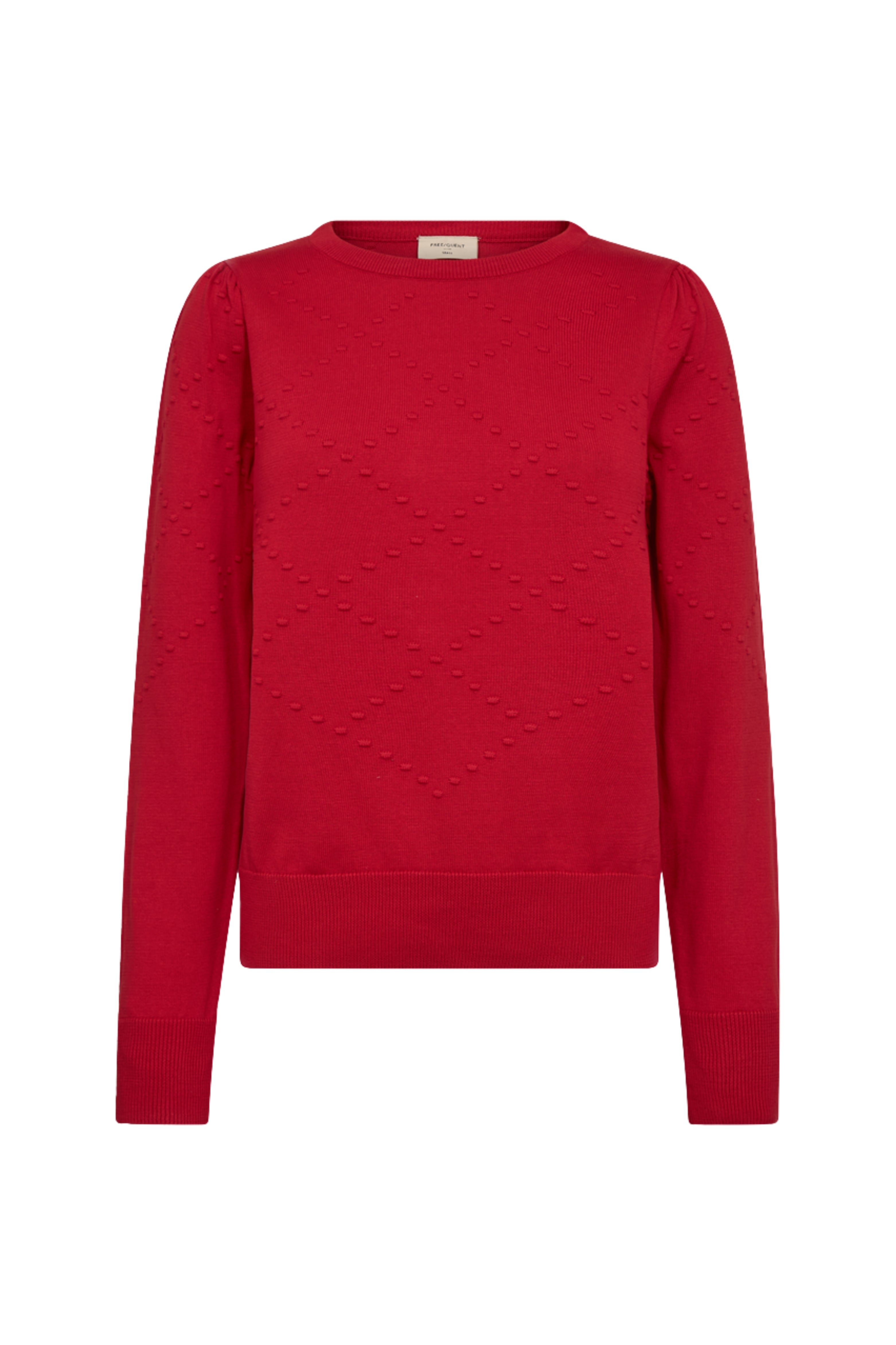 De Trui Fqdodo True Red van Freequent is een vrouwelijke trui met ronde hals. Zachte, fijngebreide kwaliteit met reliëfpatroon en geribde boorden. Perfect voor alledaags gebruik of een kleurrijke office-look.