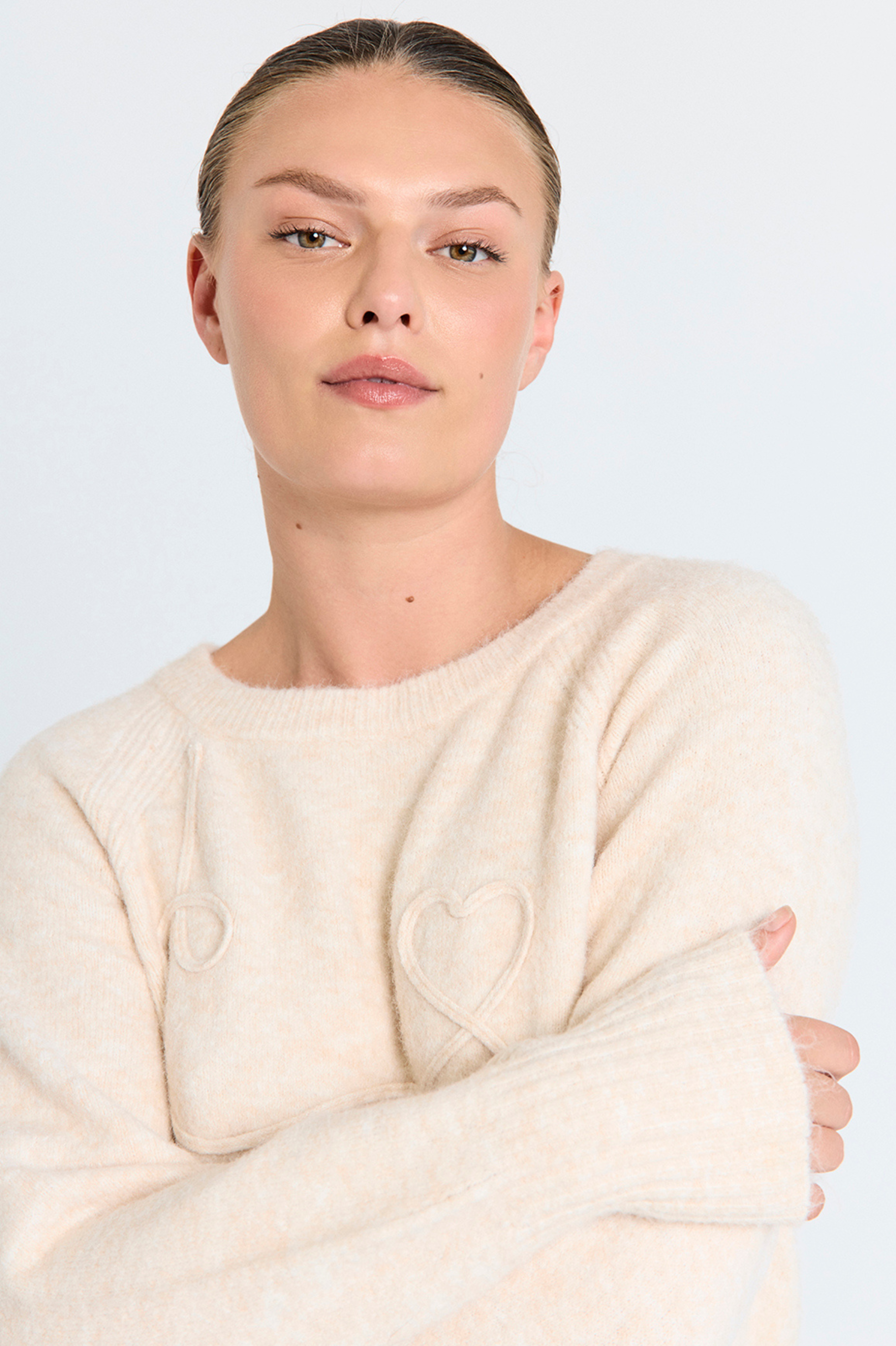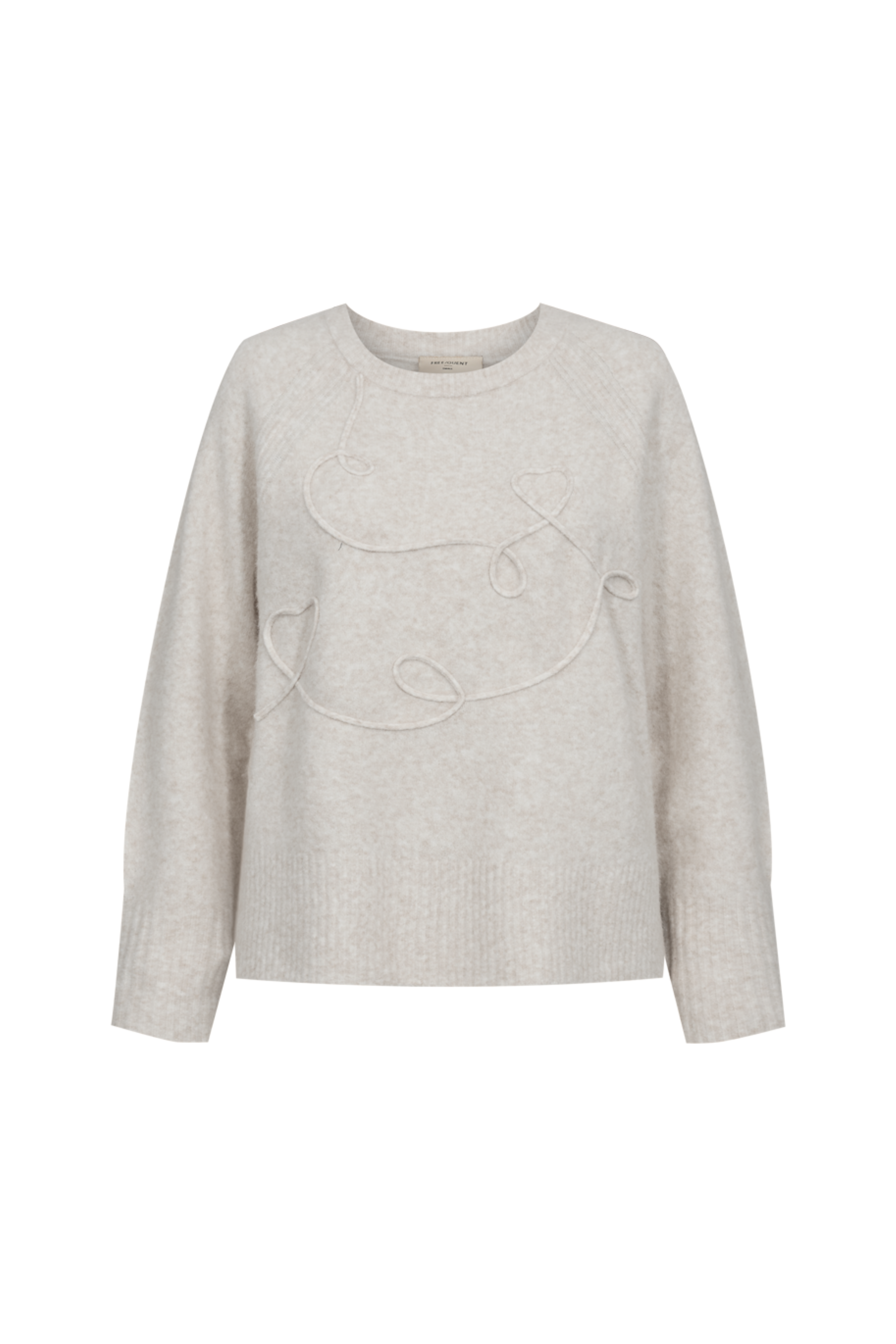 Trui Fqgrsevalin Moonbeam Melange van Freequent is een zachte knit in een lichte crème tint. De trui is afgewerkt met een vrouwelijke ton-sur-ton borduursel in hartvormige lijnen, heeft een ronde hals, lange mouwen en een comfortabele regular fit.