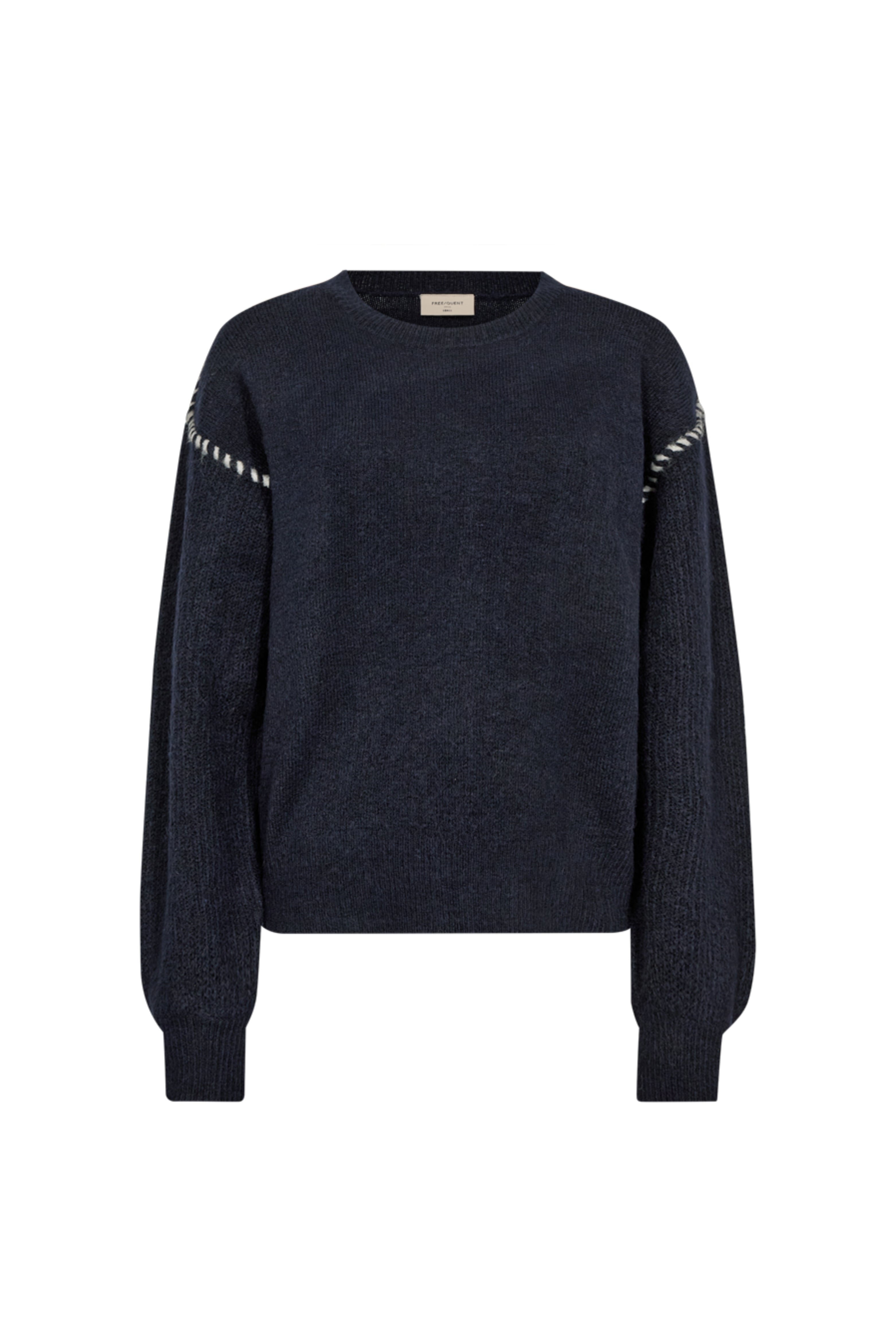 De Trui Fqkinlock Salute Moonbeam van Freequent is een tijdloze knit in donkerblauw met subtiele lichte details langs de schouders. De comfortabele pasvorm en zachte stof maken dit een veelzijdige basic voor je dagelijkse garderobe.