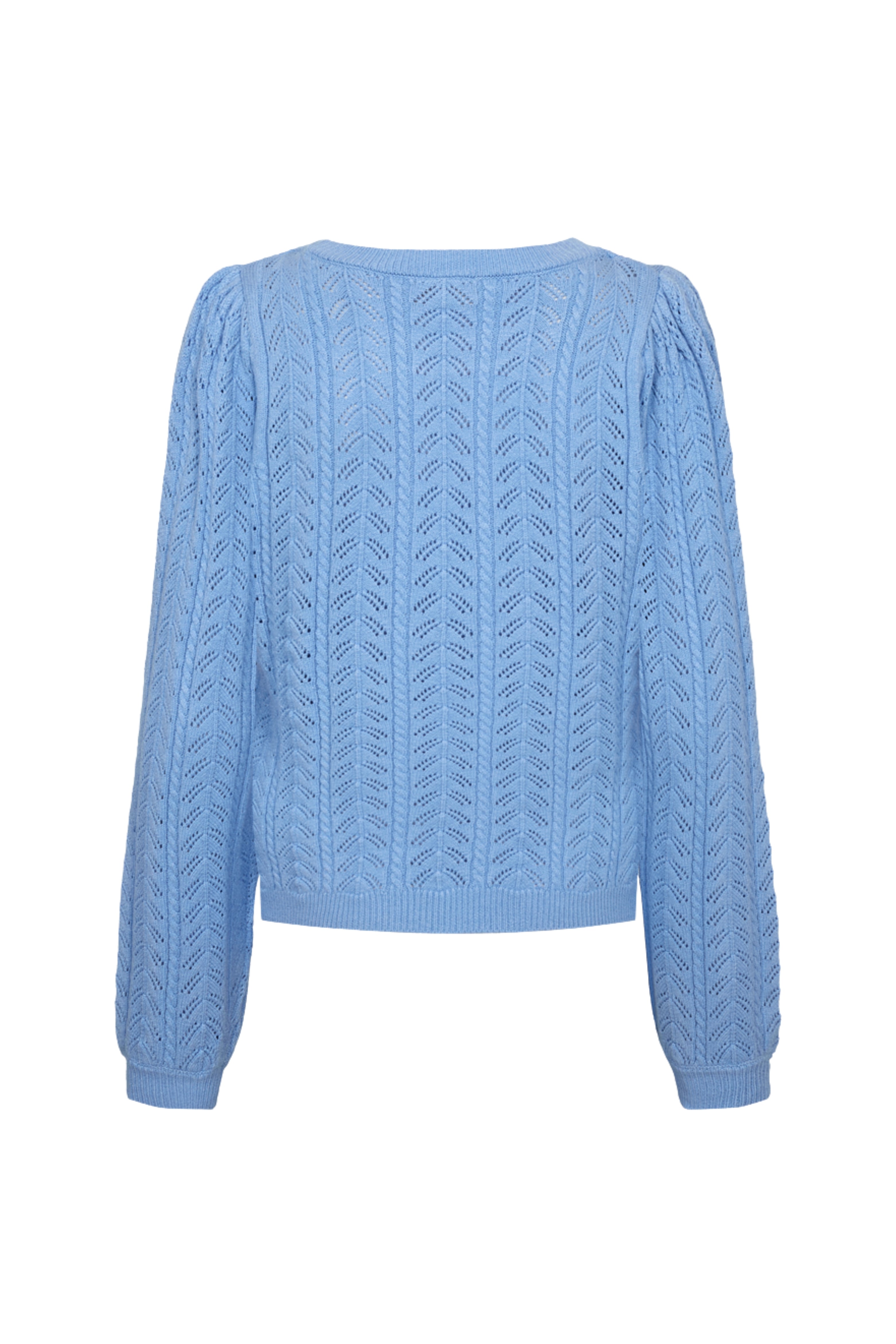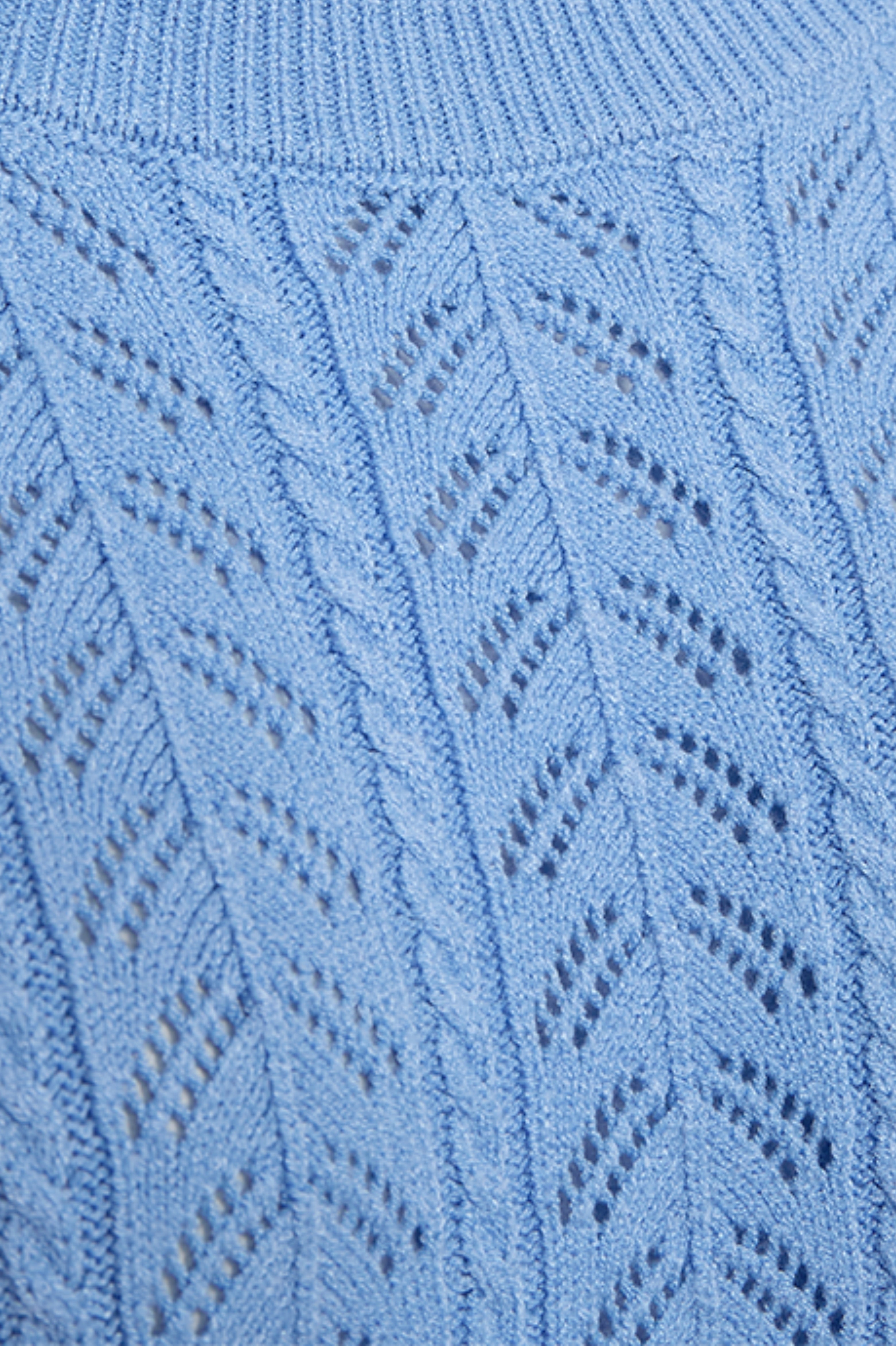 De Trui Fqlarry Vista Blue van Freequent is een vrouwelijke trui met ronde hals. Het ajourbreisel en de licht poffende mouwen geven een luchtige, elegante look. Perfect voor zowel kantoor als casual dagen.