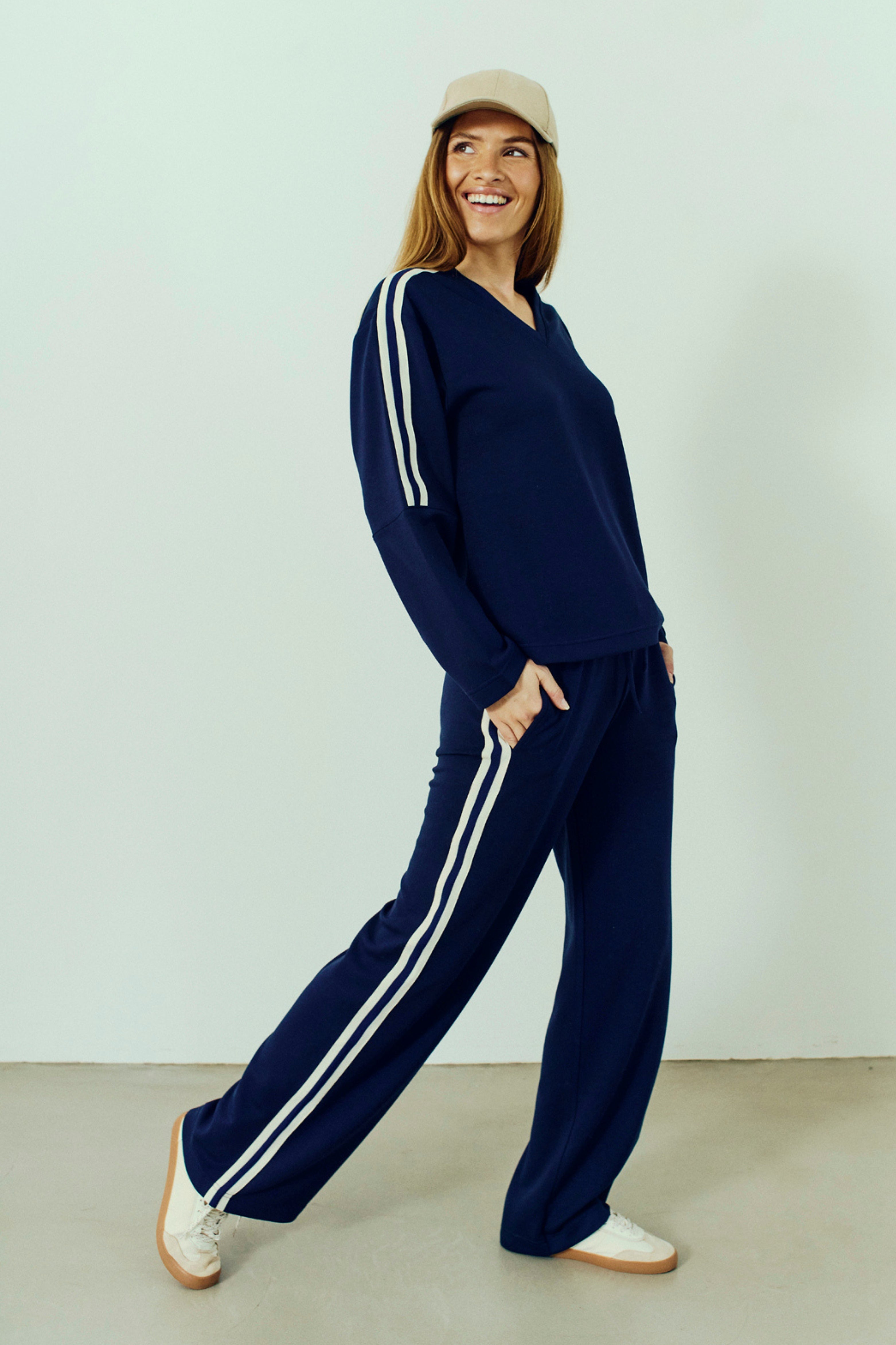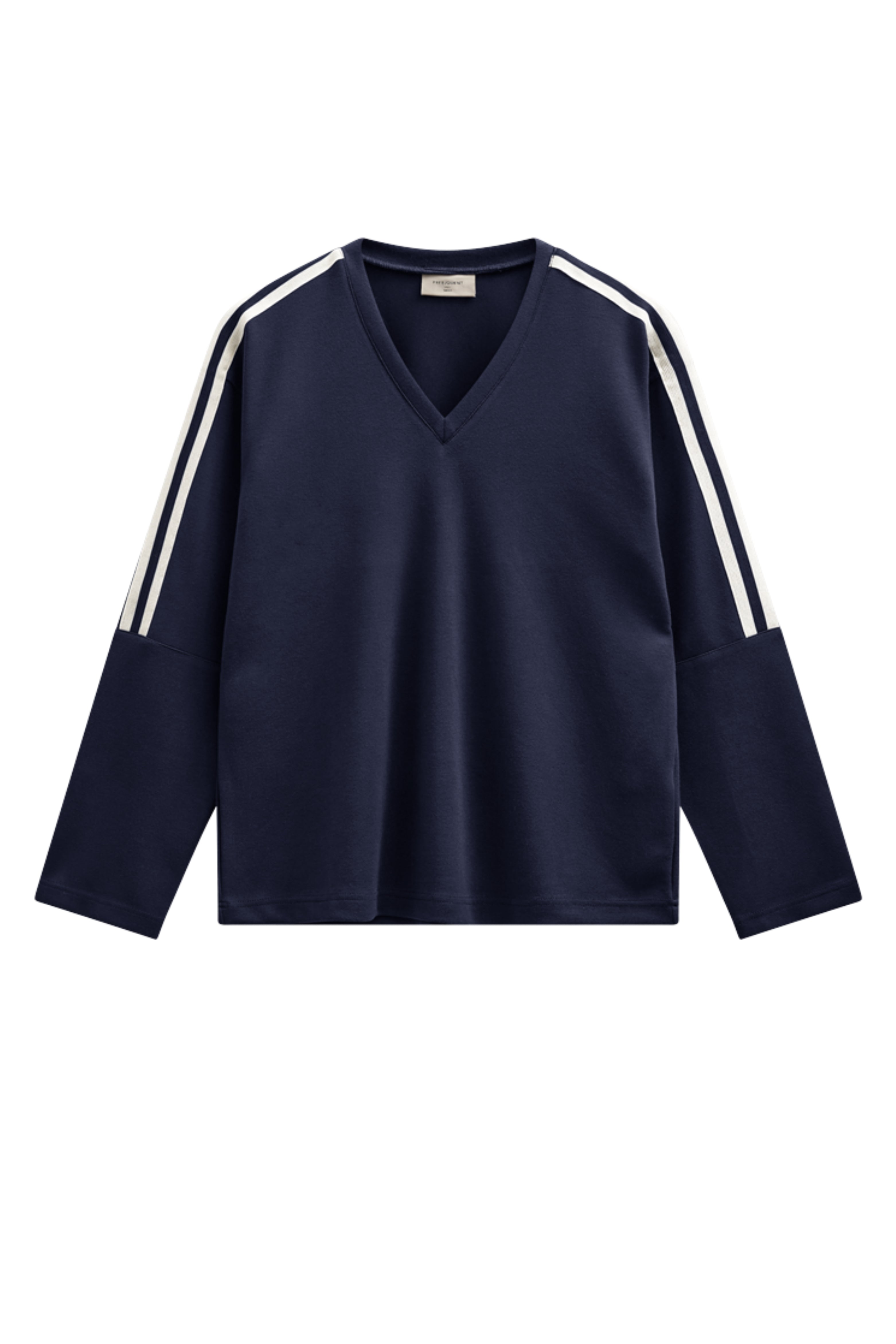 De Trui Fqlucinda Navy Blazer Star Offwhite van Freequent is een sportieve trui met V-hals. Zachte jersey en contraststrepen op schouders geven een relaxed silhouet. Perfect voor vrije tijd en casual looks.