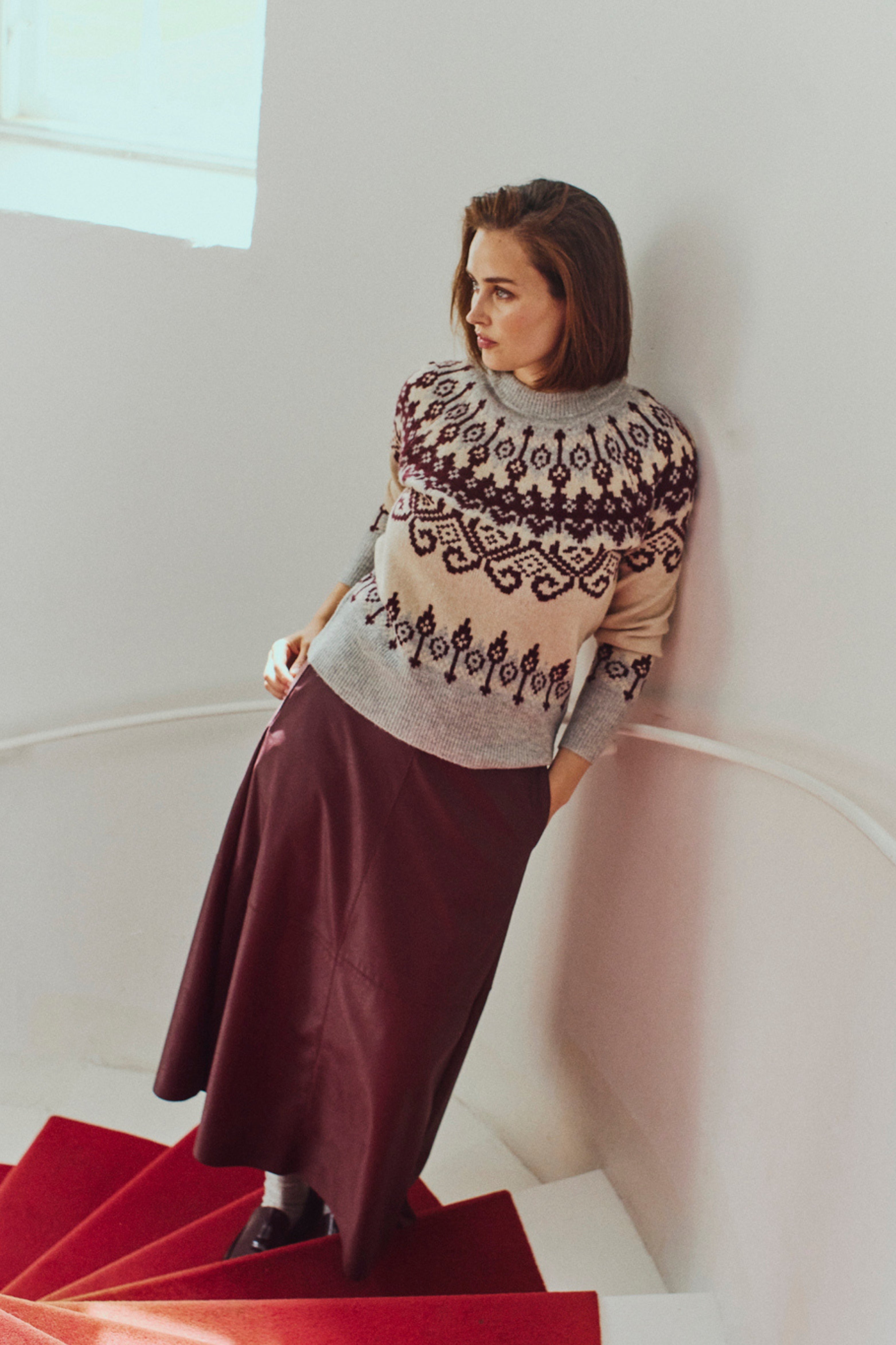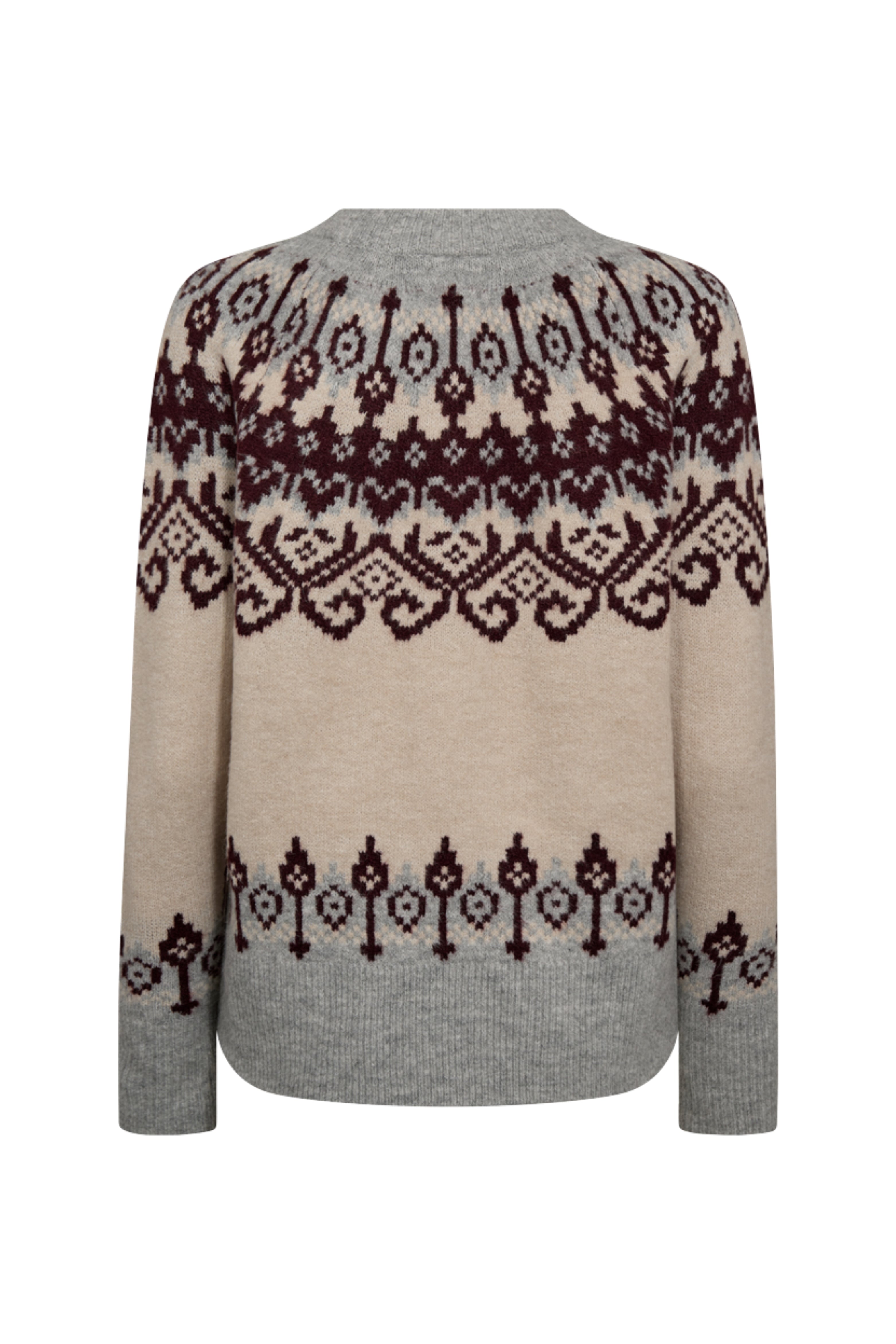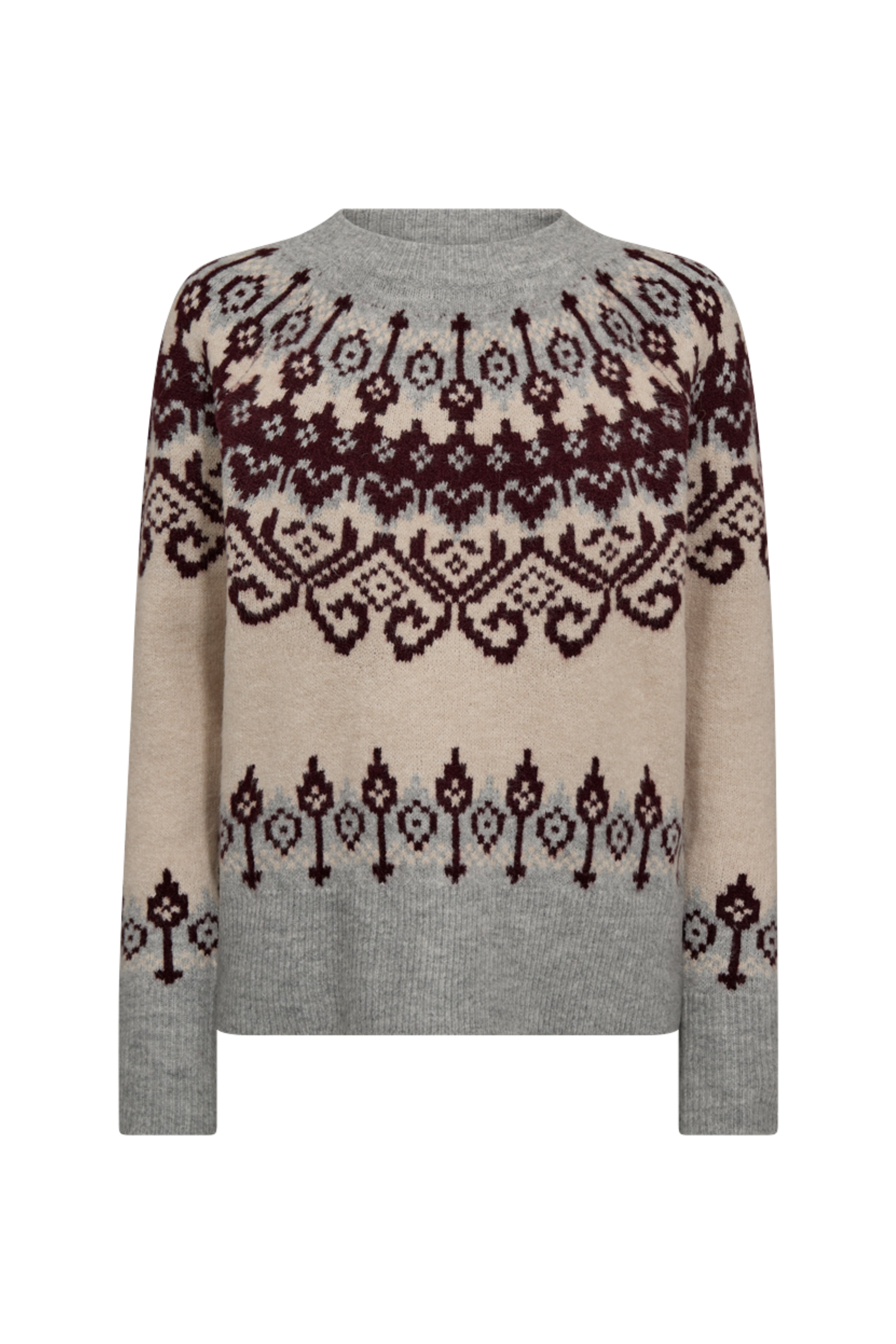 De Fqmerla Trui van Freequent in Moonbeam Grey Melange heeft een prachtig Noors geïnspireerd patroon in warme tinten. Gemaakt van een zachte knitblend met wol voor optimaal comfort en een stijlvolle winterse look.