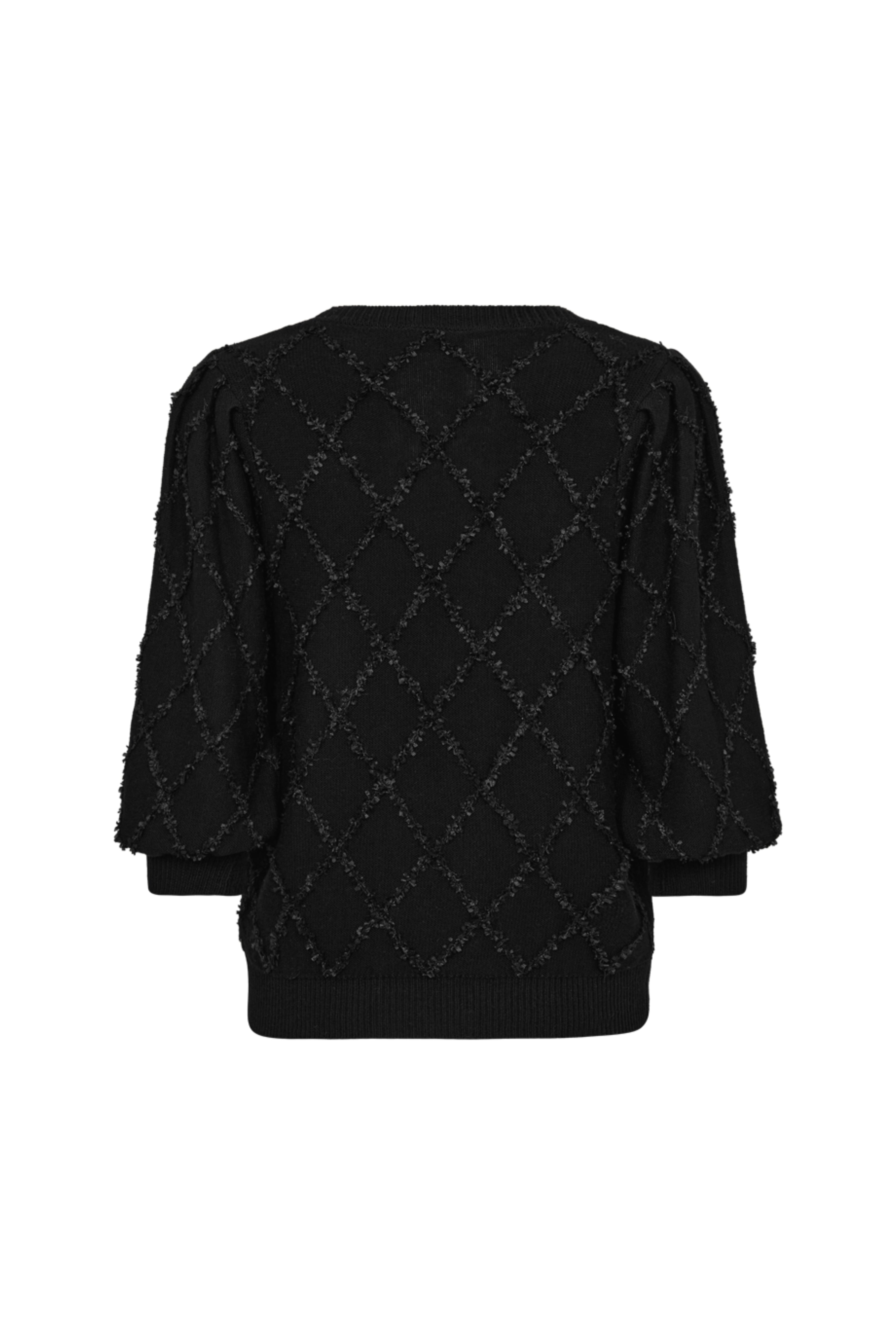 De Trui Fqsafri Black van Freequent is een elegante knit met een unieke ruitstructuur. De subtiele pofmouwen en het licht glanzende motief geven deze trui een stijlvolle en vrouwelijke uitstraling. Ideaal voor een geklede look of casual chic combinatie.
