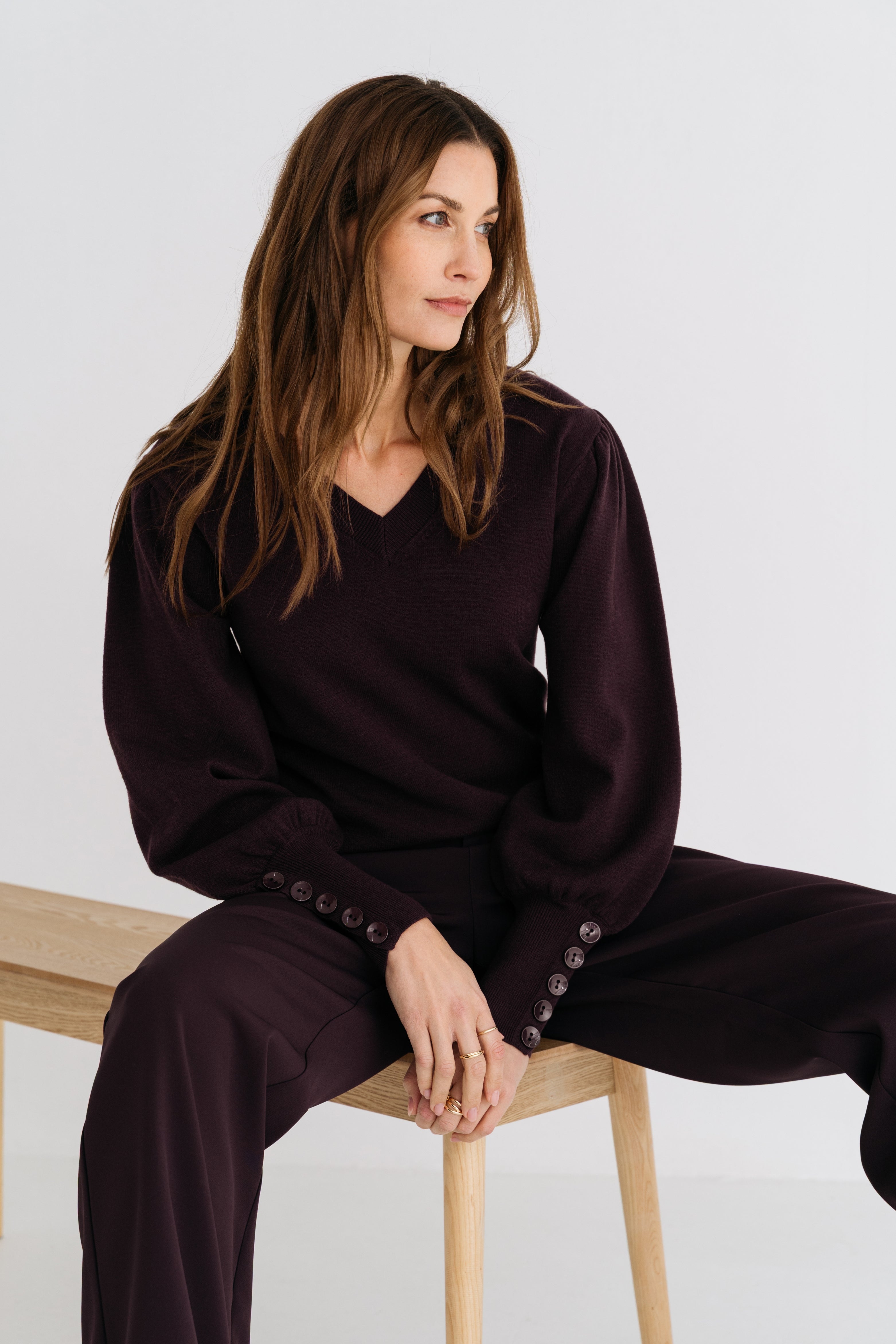 De Lieke trui in plump combineert tijdloze elegantie met moderne details. De V-hals en knoopmanchetten geven een verfijnde touch, terwijl de rijke kleur warmte en stijl toevoegt aan je garderobe.