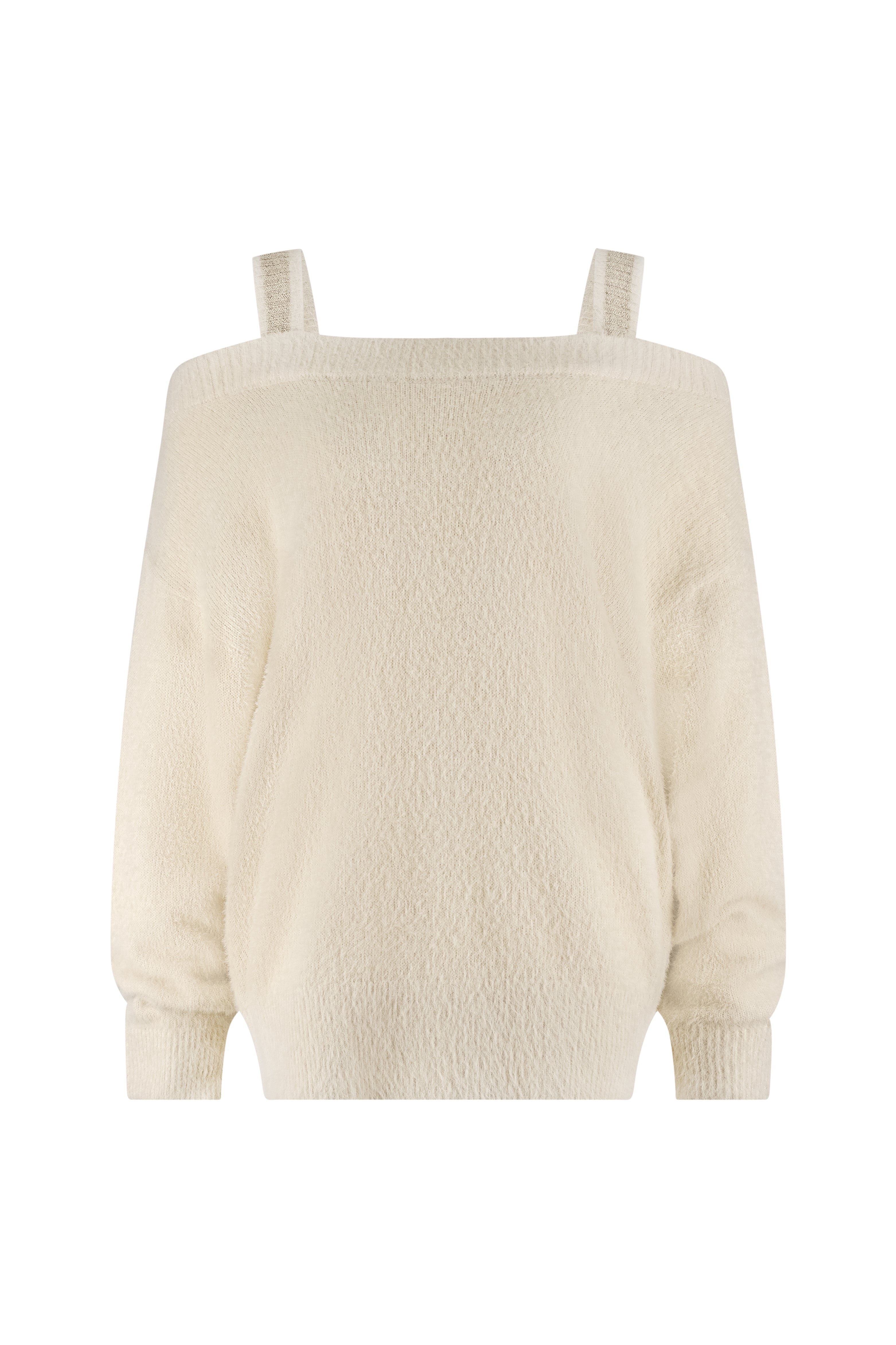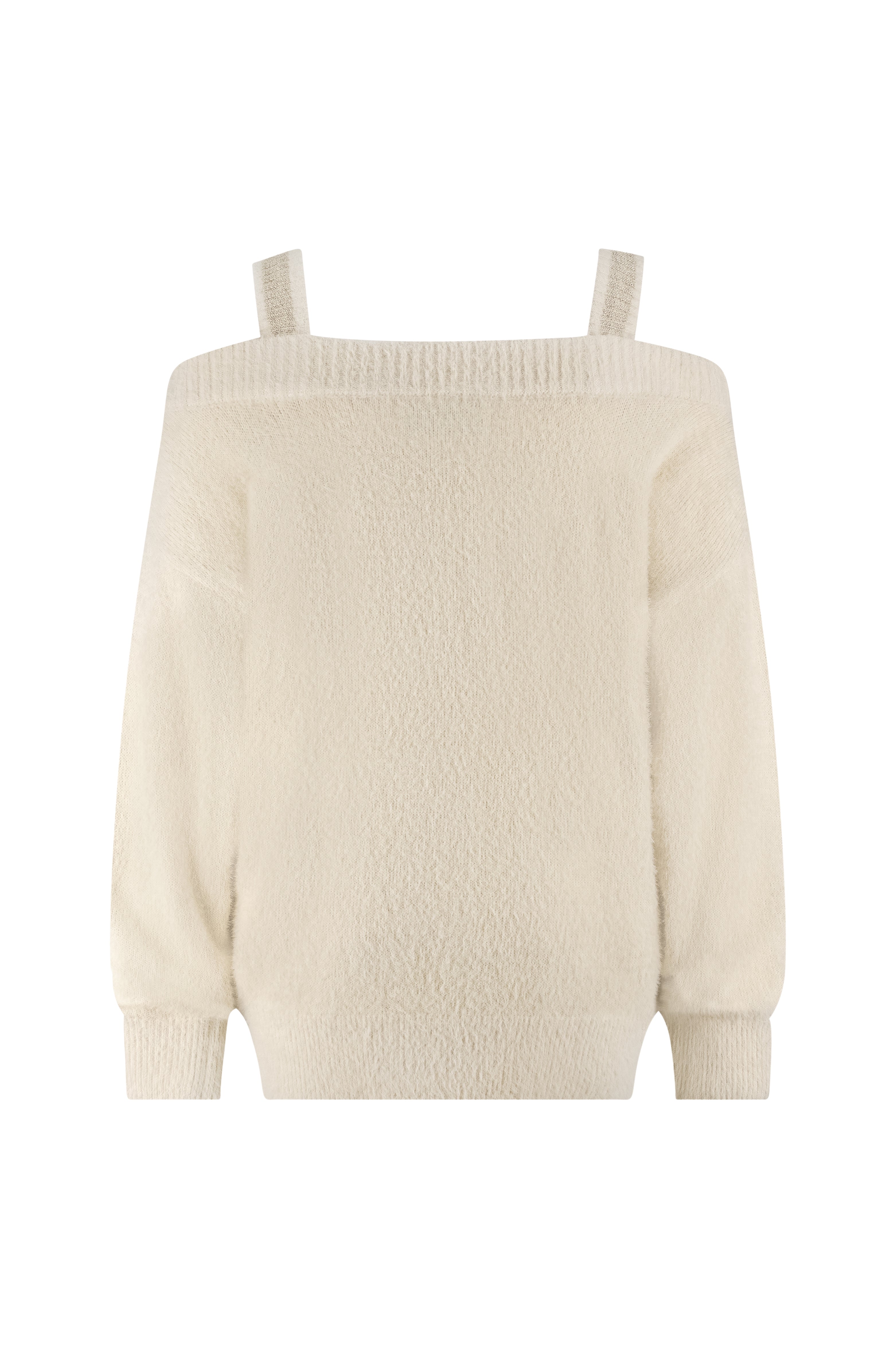 De Trui Praag Lurex Sand van Nukus is een vrouwelijke knit met een zachte fluffy structuur. Het off-shoulder design met brede halslijn en speelse schouderbandjes in lurex glans geeft de trui een elegante en moderne uitstraling.