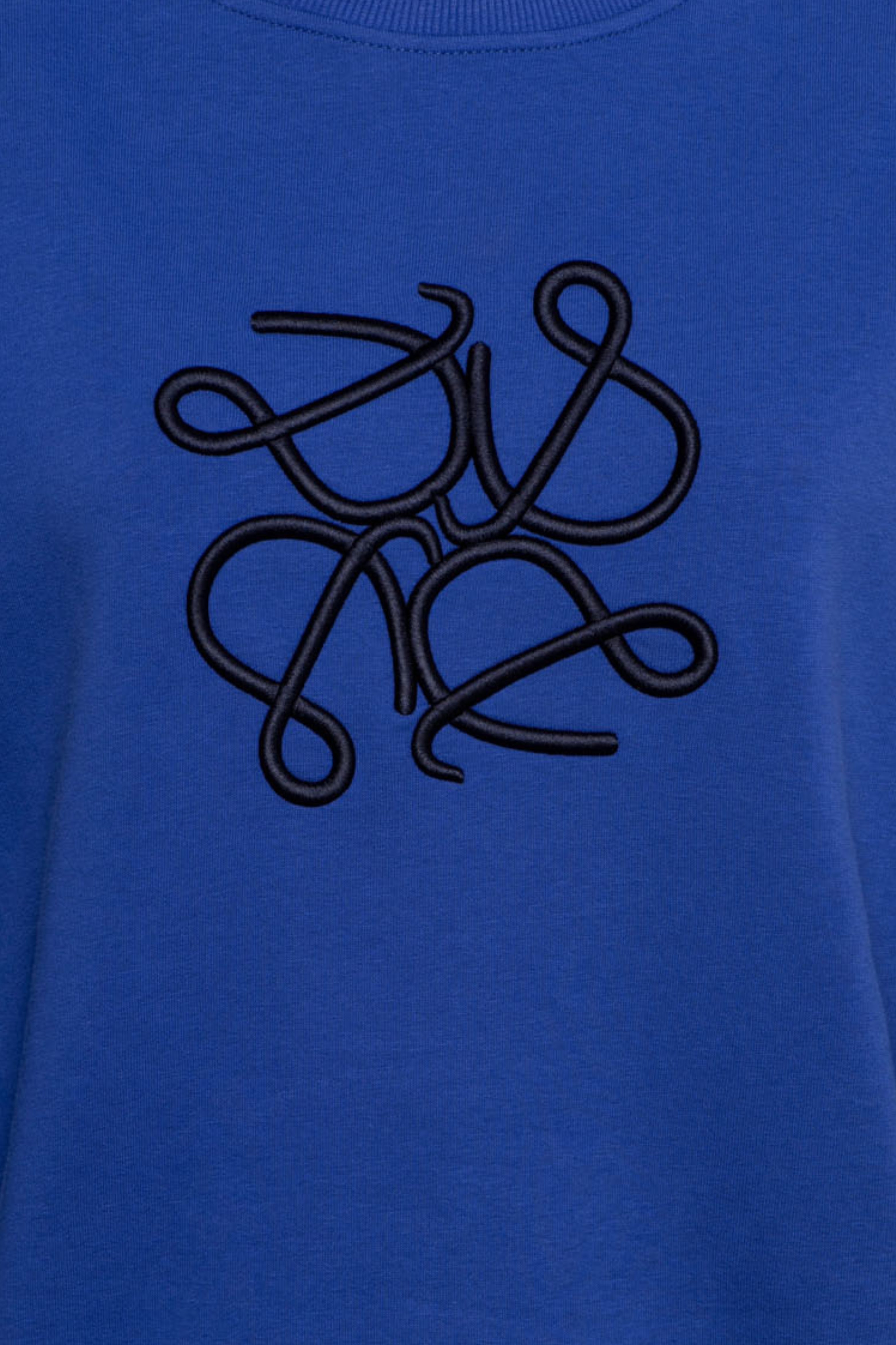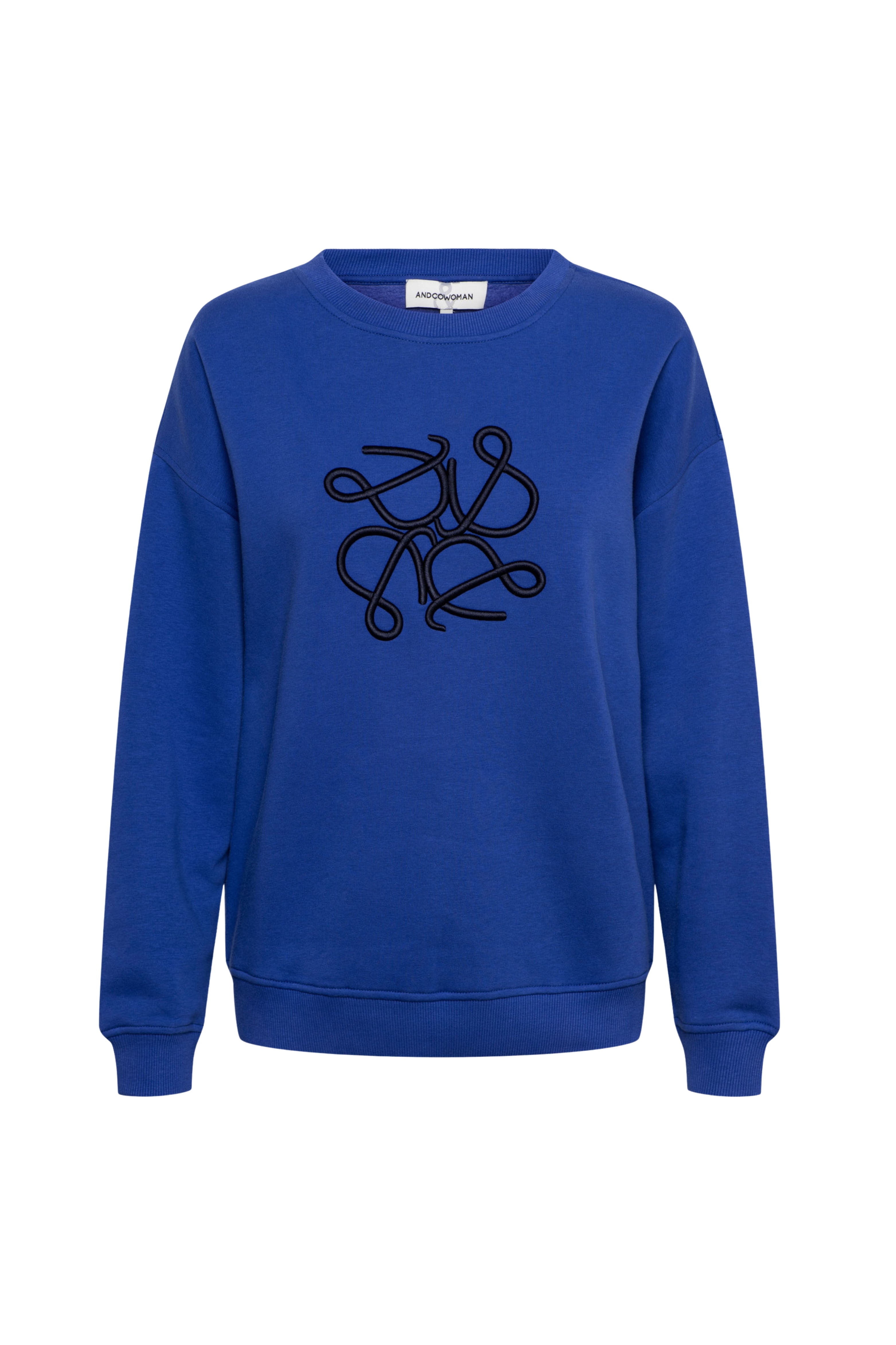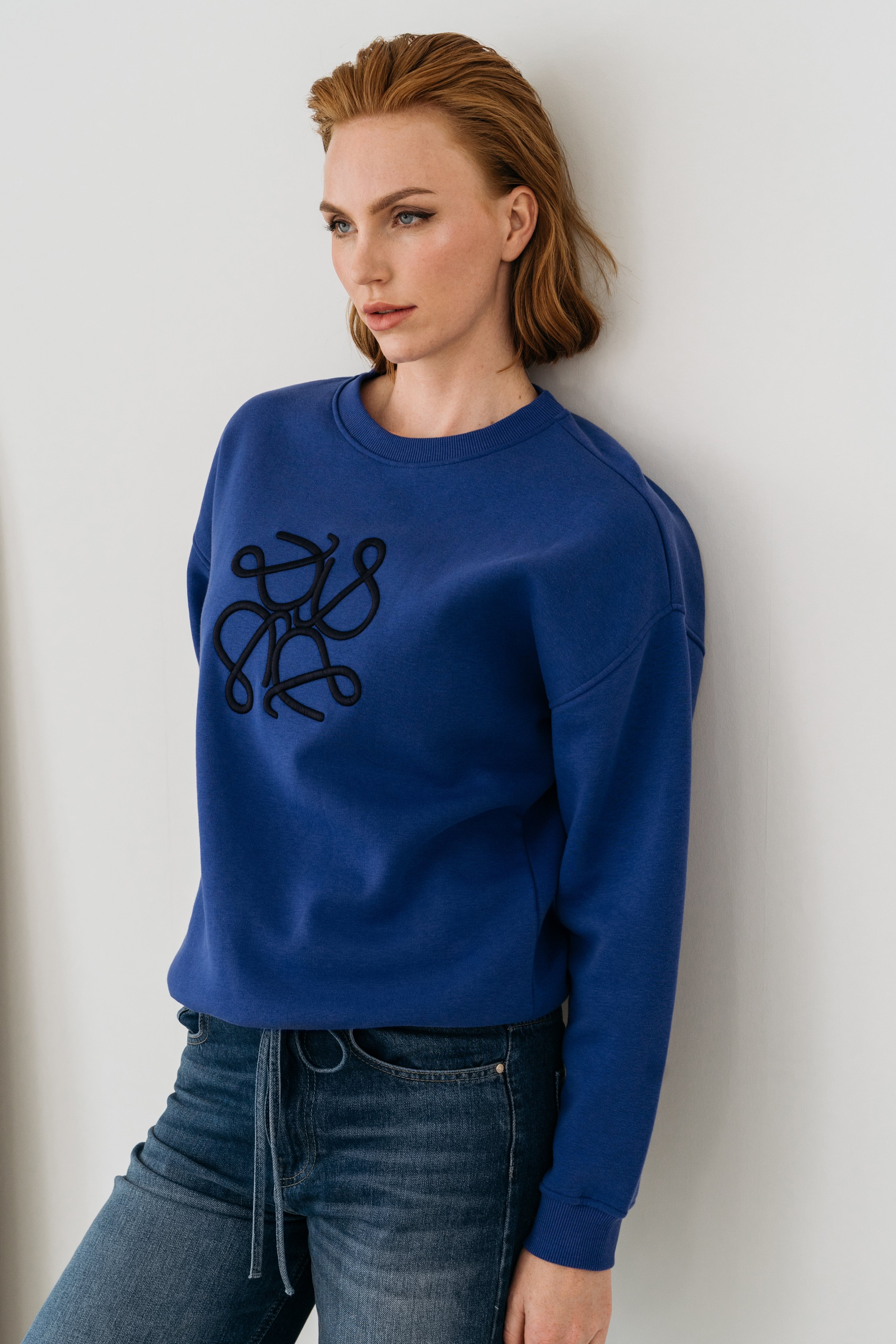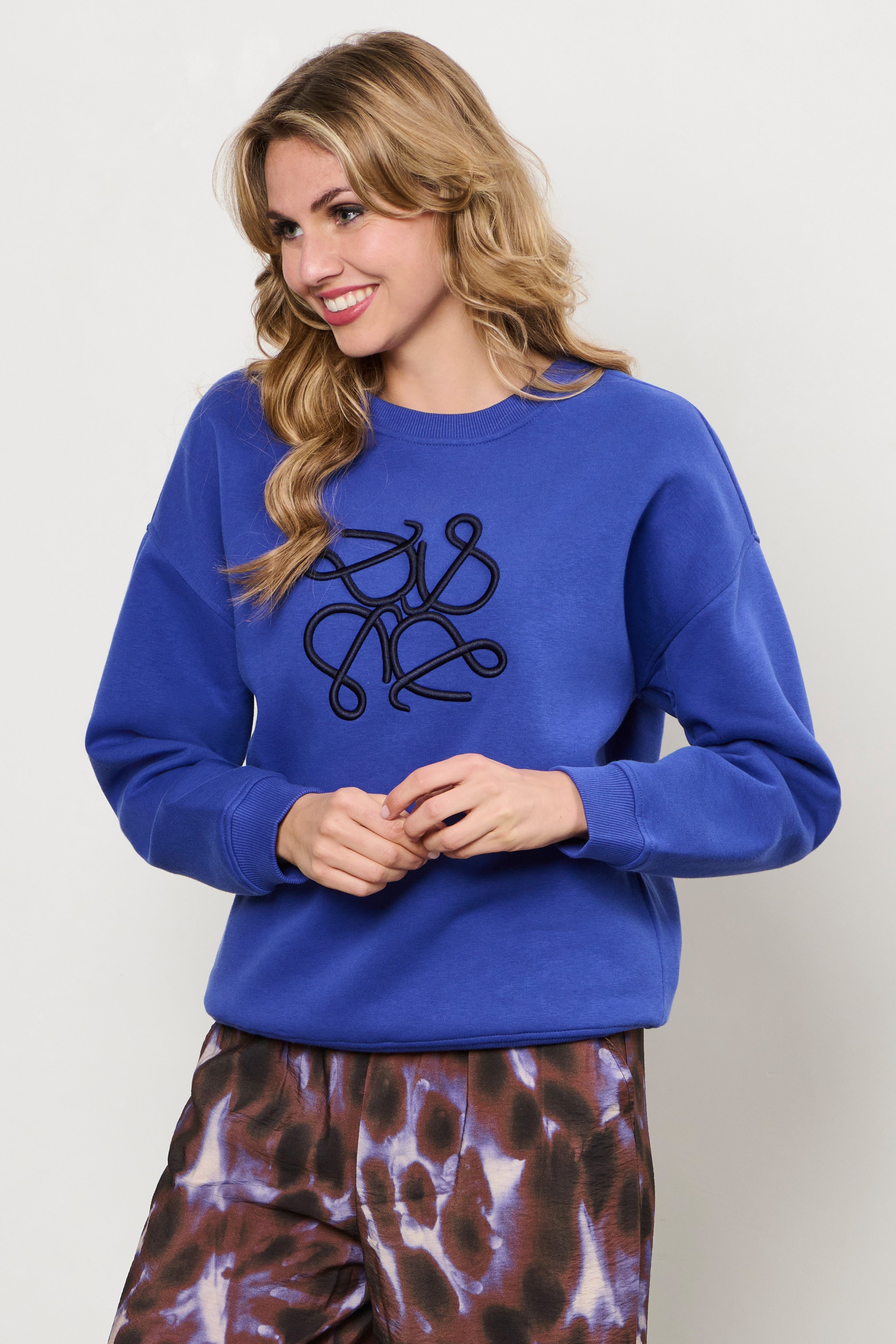 Trui Selina Embro Iris van &Co Woman is een opvallende statement sweater in een diepe blauwtint. De relaxte fit, geribde boorden en het grote geborduurde logo-artwork maken deze trui tot een eigentijdse keuze voor een casual look met karakter.