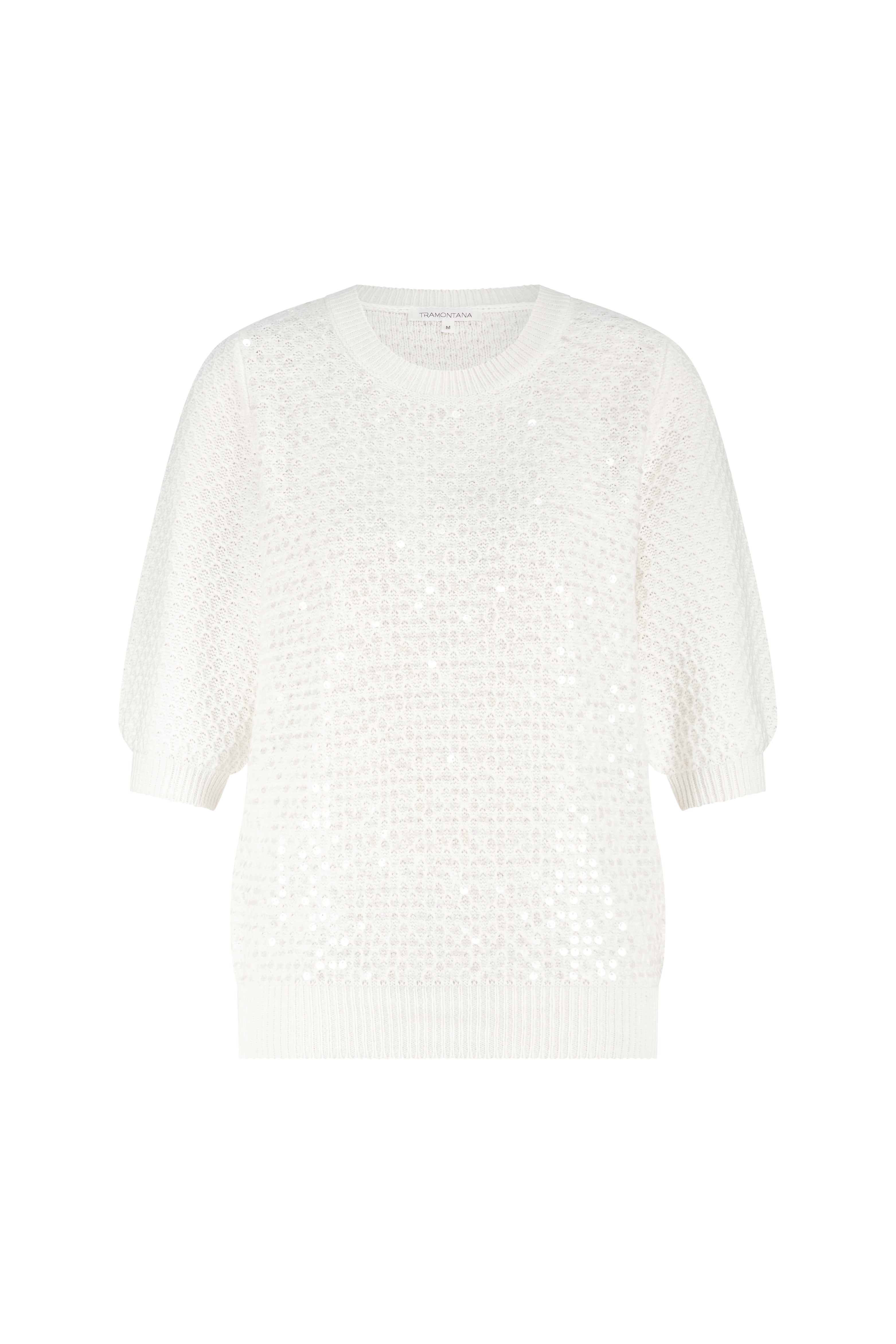 De Trui Sequin Offwhite van Tramontana is een elegante knit met subtiele pailletten. De zachte offwhite tint en fijne glans geven deze trui een verfijnde uitstraling, perfect om je najaarslook net dat beetje extra te geven.