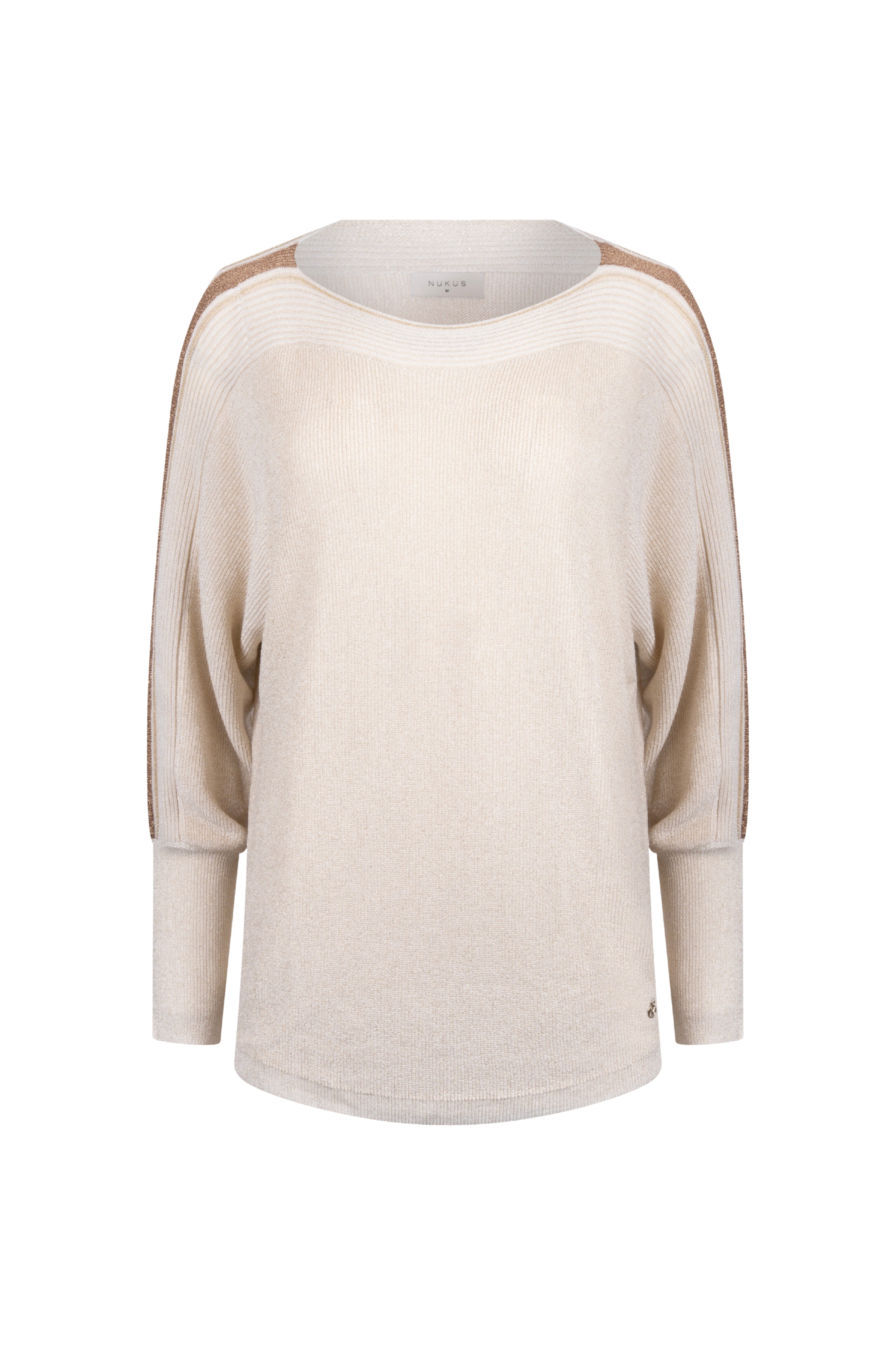 De Trui Winnie Lurex Sand van Nukus is een elegante trui met ronde hals. Vleermuismouwen, glinsterend lurexgaren en contrasterende schouderbanen zorgen voor een luxe uitstraling. Perfect voor werk én diner.